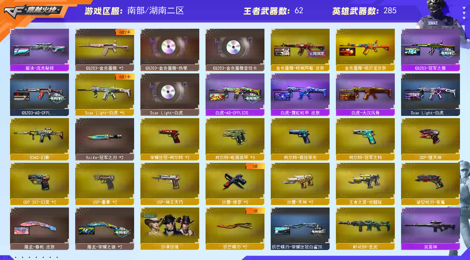 排位退出店铺拉黑 退款无条件同意 , 请文明游戏 有任何问题都可以随时申请退款,我尽量秒同意或者几分钟内同意 请勿使用连狙AI按键, 卡bug宏驱动等方式游戏,硬件类设置驱动的鼠标(不用也会检测)等进行游戏,如造成封号将由商户经理提供**信息和截图证据追究法律责任, 广东深圳龙华区虚拟财产网监局已备案,备案额24万, 你打游戏为了开心,不要让别人几十万财产有损害损害必究谢谢大家配合 此号充值30万,单独10传说(3序列号8888)价格已经不低于8万人民币了,不要以身试险,全V百皮大概成本你可以估算下是**有30万RMB,简单玩游戏, 老板记得收藏不迷路 10小时以上可改名 南部;湖南二_按默认湖南二,南部进入 其他大区有充值几十V别进错 传说武器全齐350V 3把 序列号8888__ 另外其他序列号×2 雷神:十周年臻藏动感,CFS十周年+很多皮 毁灭:2018.2020.2022等十几个皮肤 星神璀璨+漫游+暗刃音效卡, QBZ:冠军+白鲨+阿敏+AG+天罚+ 冠军之刃 幻神:一共14皮+套幻掌上幻6把幻神+6张幻神卡音效:武器卡大于30张动物:柯基+金色刀锋金色牛牛系列m4.ak.cop和金戈幻神副武器USP×4 COP×3,2号B背包;生化:毒蜂+异变清道夫+蝴蝶+萌兔+沙漠玫瑰3号C背包;挑战:类武器×8属性全部3+3;USP-雷暴,荣耀世冠-柯尔特,柯尔特-冠军之特,炽芒蝶刃,Knife-冠军之刃,沙漠玫瑰,传说女帝,