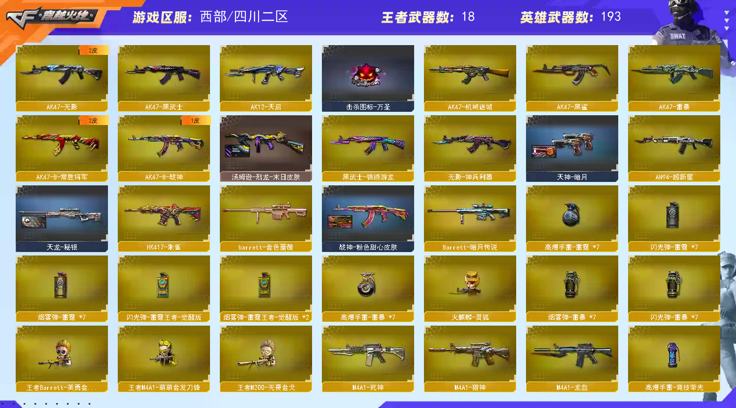 传说影煞,传说女帝,传说光耀,传说暗裔英雄武器194个; 王者武器21个。 装备齐全拥有完美游戏体验。重要的是,特殊装备有:AN94-超新星、M4A1-黑骑士、M4A1-玫瑰精灵、AK47-黑武士、麒麟刺、AK47-火麒麟、AWM-天龙、Barrett-毁灭、加特林-炼狱、M4A1-雷神、M4A1-黑龙、QBZ03-金色蔷薇、M4A1-雷霆、AA-12-雷霆、AK47-雷暴、M4A1-堕天神、COP-堕天神、龙啸-堕天神、麒麟刺-堕天神、闪光弹-堕天神、烟雾弹-堕天神、HK417-朱雀、M4A1-夜魔、Scar Light-白虎、传说暗裔、传说光耀、破空枪刃-夜魔、M4A1-青龙、Kar98K-星神、Barrett-朱雀、M200-幻神、USP-雷暴、雷霆之怒、传说圣灵、传说梦魇、雷霆之契、雷霆之锋、烟雾弹-竞技荣光、闪光弹-竞技荣光、高爆手雷-竞技荣光、炫金天龙、炫金雷神、炫金毁灭、高爆手雷-雷霆王者、QBZ-03-王者蔷薇-觉醒版、王者之怒-觉醒版、王者之武-觉醒版、王者冰魄-觉醒版、王者蔷薇-觉醒版、源·武圣、灵·QBZ03-金色蔷薇-嘉年华、源·武圣glock、堕天使、雷霆-β、王者复仇、潘多拉、传说女帝、迷迭香、王者-魅影、王者玲珑-小乔、圣诞潘多拉-X、生化弹匣、Barrett-毁灭音效卡、AK47-火麒麟音效卡、炼狱-悦蓝金色光效、等,随意畅选。;USP-雷暴,传说影煞,传说女帝,RPK-盘龙,QBZ03-金色蔷薇,M200-幻神,Scar Light-白虎,
