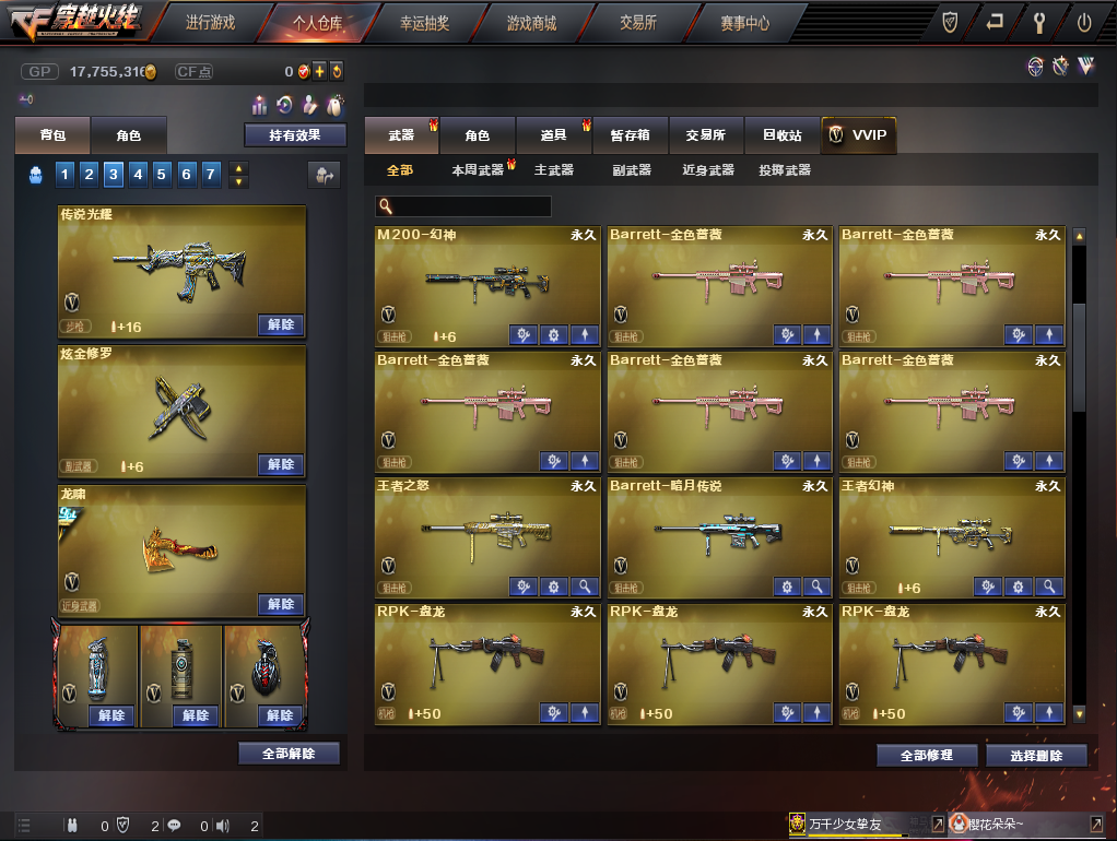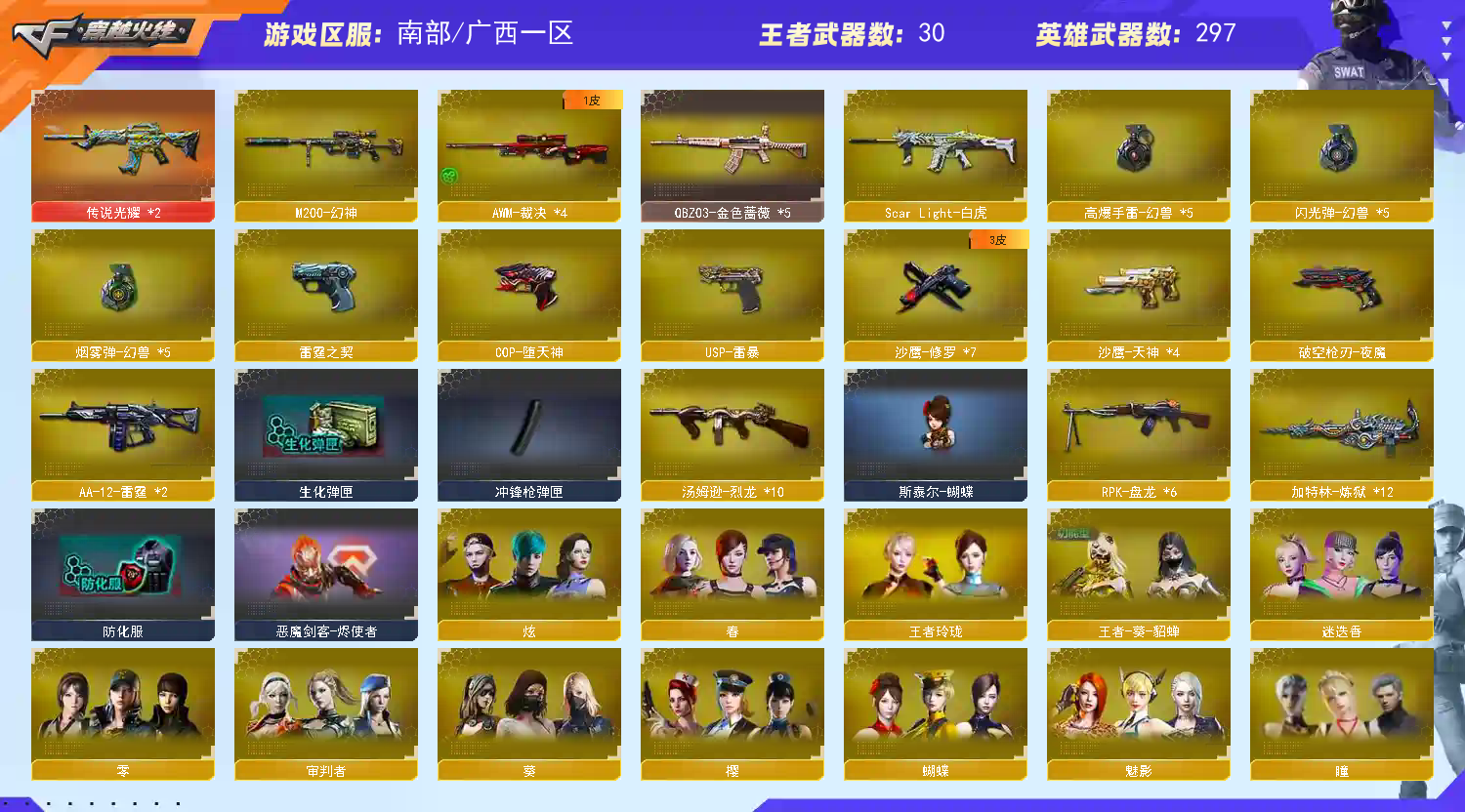 首页 > 租号大厅 > 穿越火线 > 电信区/广西一区 > 妹子号297V❤传说光耀雷神N9❤SV王者幻神满年套斯太尔蝴蝶牛逼号