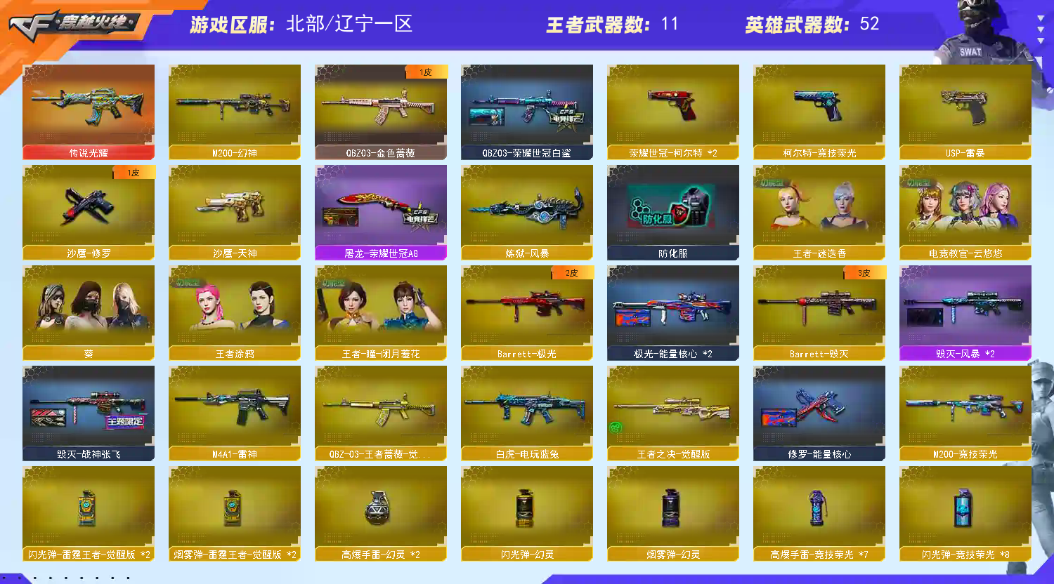 M200-幻神+幻神-动感闪耀音效卡/M200-竞技荣光/传说光耀/qbz03-王者蔷薇觉醒版/白虎-电玩蓝兔/雷神/毁灭/极光/王者之心/王者之决/王者雷怒/炼狱-风暴/裁决-雪莉杨/等等 USP-雷暴/柯尔特-竞技荣光/荣耀世冠-柯尔特X2/修罗/天神/等等 龙啸/擎天/屠龙/麒麟刺/擎天-竞技荣光/黄金猫猫手套-白鲨/胡萝卜匕首/等等 幻神-动感闪耀音效卡/语音特效-机器人 电竞教官-云悠悠(已开四防)/王者瞳-闭月羞花(已开四防)/王者涂鸦(已开四防)/灵狐者职业经理/芳心审判者/初恋灵狐/潘多拉X/情久炫彩背包 QBZ03-荣耀世冠白鲨/毁灭-战神张飞/屠龙-荣耀世冠AG皮肤/天龙-传奇白鲨/毁灭-风暴等等;USP-雷暴,荣耀世冠-柯尔特,电竞教官-云悠悠,QBZ03-金色蔷薇,M200-幻神,
