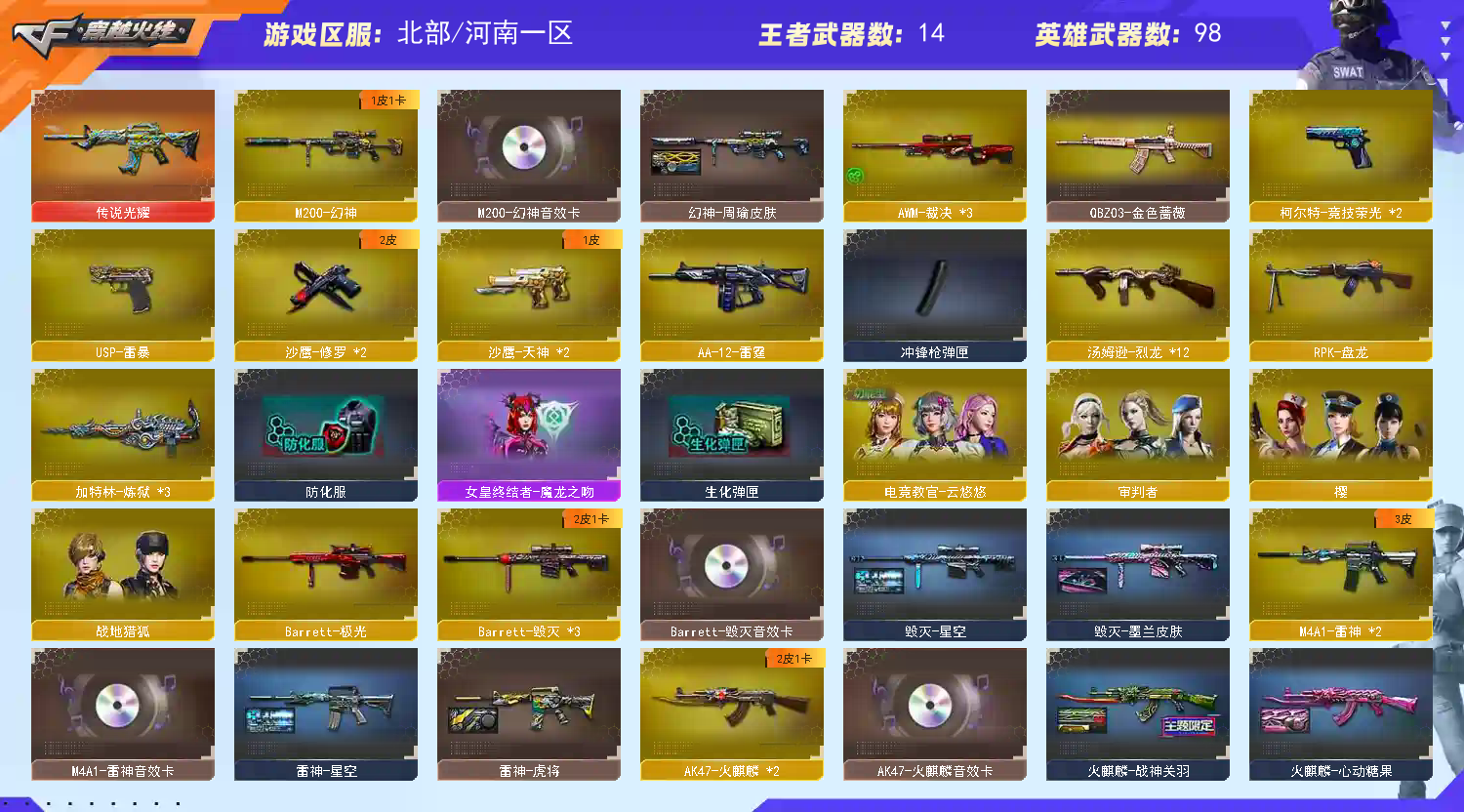 M-幻神音效卡周瑜皮肤三件套+M竞技荣光套星神长生圣莲USP雷暴竞技柯尔特+生化满6烈斯太尔蝴蝶百V;USP-雷暴,电竞教官-云悠悠,RPK-盘龙,QBZ03-金色蔷薇,M200-幻神,