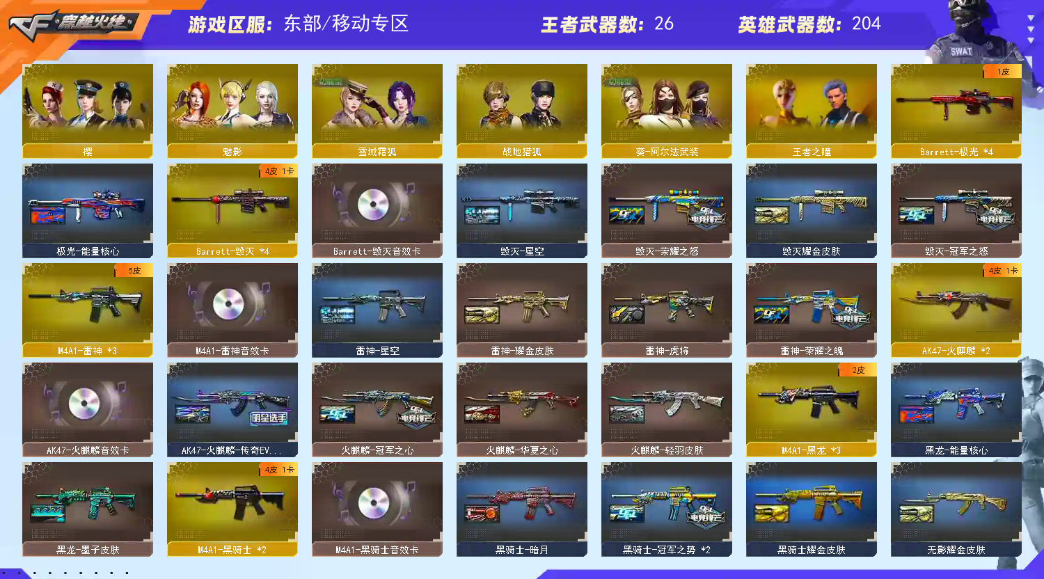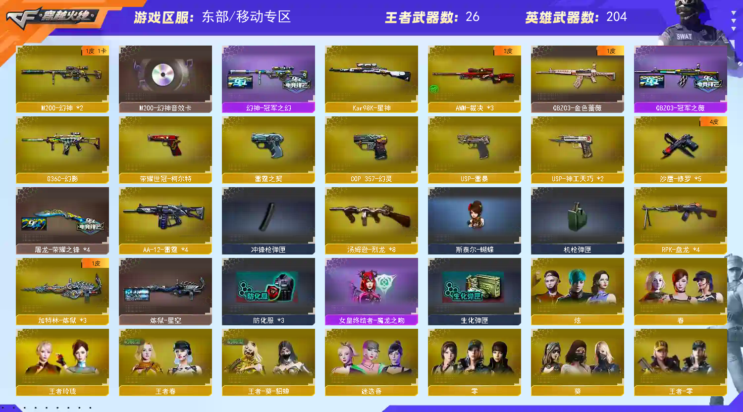 移动专区 vip5 206v 【王者幻神】 【m200幻神+音效卡+冠军之幻】 【98k星神】 【白虎之魄】 【hk417朱雀】 【qbz金色蔷薇+冠军之薇】 【冠军之刃】 【雷霆套】 【雷暴套】 【网剧冠军套】 【荣耀世冠套】 【小人呛 雷神刀锋 火麒麟绝迹 cop白鲨 黄金猫猫手套白鲨 猫猫手套】 【g36c幻影】 【火麒麟+音效卡+传奇even+冠军之心】 【黑龙】 【雷神+音效卡+白鲨14冠军+荣耀之魄】 【黑骑士+音效卡+冠军之势】 【毁灭+音效卡+冠军之怒+荣耀之怒】 【极光】 【裁决】 【盘龙*4 炼狱*3 烈龙*6】 【王者之心 王者之魄 王者之势 王者之幻 王者之啸 王者之击 王者之刺】 【无影 死神 黑武士 天启 机械迷城 黑鲨 龙血 黑武士锦绣游龙 玫瑰精灵 烈火 猩红传说 战士 战神】 【修罗 屠龙 龙啸 麒麟刺】 【四防角色 王者春 王者葵貂蝉 】 【角色 春 葵 零 迷迭香 王者零 王者玲珑 王者之瞳 新海豹突击队 樱 炫 魅影】 【edg炫彩背包 estar炫彩背包 xrock炫彩背包 炫彩背包 ag炫彩背包 bs炫彩背包】;USP-雷暴,荣耀世冠-柯尔特,Knife-冠军之刃,RPK-盘龙,QBZ03-金色蔷薇,G36C-幻影,M200-幻神,