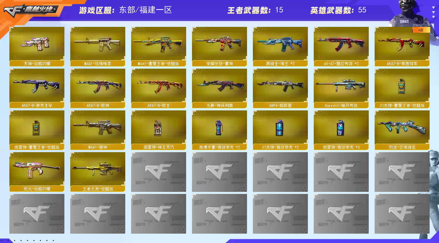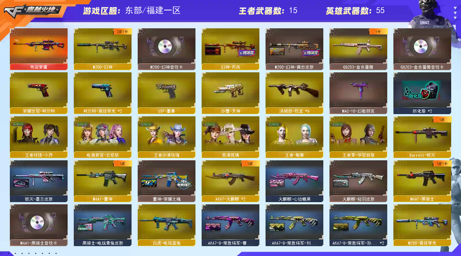 VIP613王者传说梦魇/幻神黄忠/幻神丹凤/毁灭墨兰/火麒麟心动糖果/火麒麟枪娘凯特琳/火麒麟轻羽/刘备/孙权/曹操/雷神荣耀之魄/电竞教官-云悠悠/荒漠琉璃/M200-幻神/M200-竞技荣光/Barrett-毁灭/Barrett-暗月传说/王者之光-觉醒版/竞技荣光套装/M200-幻神音效卡/M4A1-黑骑士音效卡/QBZ03-金色蔷薇音效卡;USP-雷暴,荣耀世冠-柯尔特,电竞教官-云悠悠,王者沙漠玫瑰,QBZ03-金色蔷薇,M200-幻神,