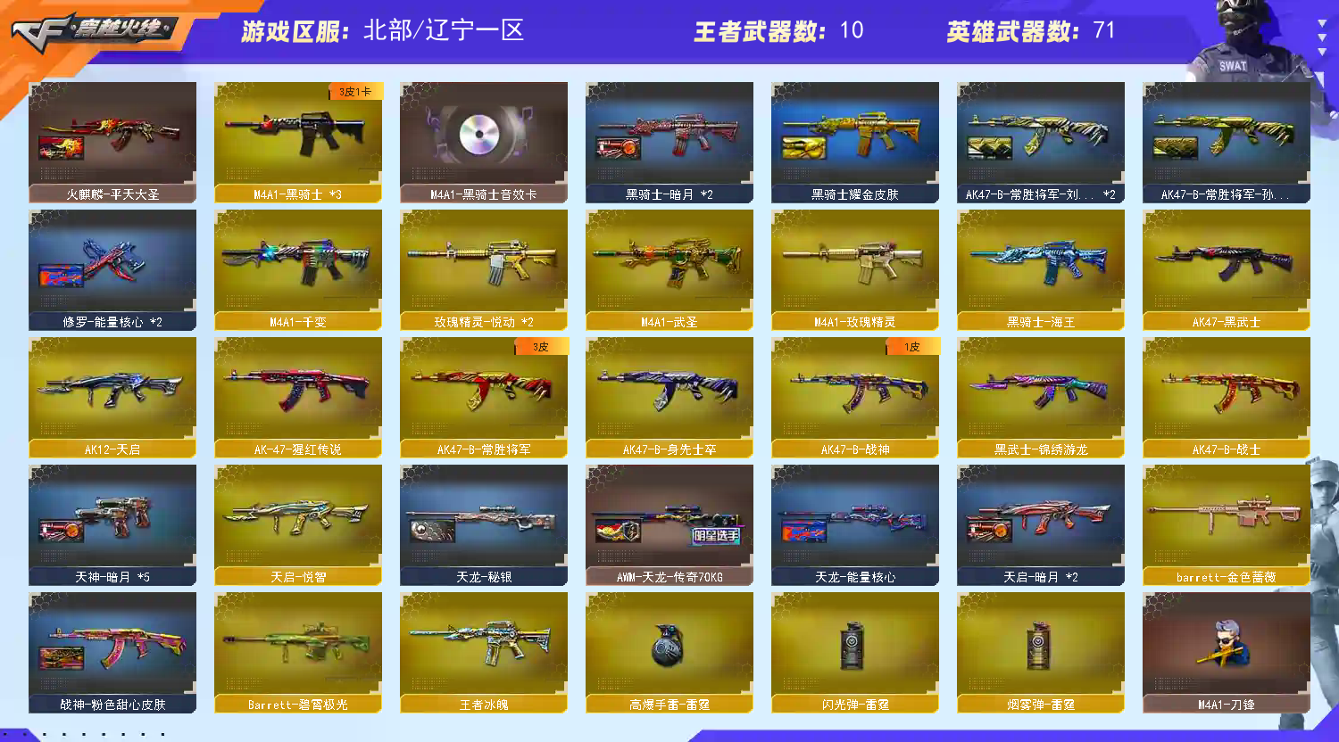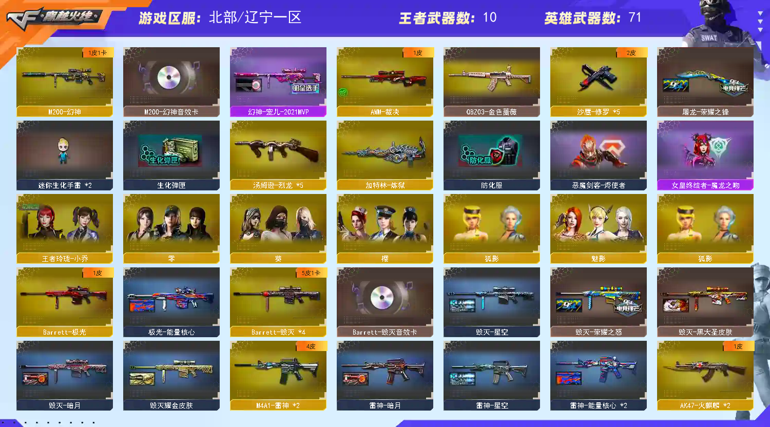 【重要角色】_零/审判者/王者-葵-貂蝉/王者复仇/乔伊教练/女主播/新海豹突击队/铁骑荣耀/兰-梨园特工/零-水下丽影/灵狐者-黄金海岸 【英雄武器】_M200-幻神/Barrett-毁灭/Barrett-暗月传说/Kar98K-星神/AWM-天龙/M4A1-雷神(3)/M4A1-死神(2)/M4A1-千变/M4A1-黑骑士/王者之魄-觉醒版/白虎-电玩蓝兔/AK47-火麒麟/AK47-无影/无影-神兵利器/AK-47-猩红传说/AK47-B-战神/QBZ03-天罚/QBZ03-金色蔷薇/烈火-动感闪耀/汤姆逊-烈龙/天神-动感闪耀/沙鹰-天神/沙鹰-修罗(4)/麒麟刺/王者之刺-觉醒版/龙啸(2)/擎天/王者之击-觉醒版/屠龙-动感闪耀/屠龙/手雷-动感闪耀/高爆手雷-云龙(3)/高爆手雷-神工天巧/烟雾弹-云龙(2)/烟雾弹-神工天巧/烟雾弹-雷霆王者-觉醒版(2)/闪光弹-神工天巧/闪光弹-雷霆王者-觉醒版/M4A1-凌龙-I/超新星-热带奇洋/黑武士-锦绣游龙/龙啸-热带奇洋/手雷-热带奇洋 【王者武器】王者之幻/王者之怒/高爆手雷-雷霆王者 【小人枪】AWM-灵狐-15周年嘉年华/夺魂/冰火魔兽/魔能飞环-曼陀罗/迷你生化手雷/疾爆手雷-河马/灵狐娃娃手雷 【其他重要武器】炫金雷神/炫金骑士/炫金武士/M4A1-英雄-能量核心/激光毁灭者III-白马银枪/冰龙粉碎者-白马银枪/AK47-破空冰刃/M4A1-战龙/M4A1-破空冰刃/M4A1-PINK/黄金AK-47/9A91-赤血龙魂/AK47-圣诞节[2019]/QBZ03-吕布(3)/9A-91-圣诞/红龙AK47/百城AK47/QBZ03-街机/M14EBR-CFS 2020/神罚/黄金AWM/AWM-Pink/AWM-A/barrett-战龙-圣诞/雷蛇AWM/末日裁决者/EVO III-赤血龙魂/神圣爆裂者-末日/SPAS-12-雷电核心/柯尔特-百城/Anaconda-炽焰核心/Anaconda-麟龙/Colt1911-彩蝶/沙鹰-枪王排位/Cop357-萌杀/金刚伞-电玩红兔/尼泊尔军刀-战龙/蝴蝶刀-枪王排位/烟雾弹-机甲核心 【重要武器皮肤】M200-幻神-黄忠皮肤/幻神-宠儿-2021MVP/毁灭-冠军之怒/毁灭-墨兰皮肤/毁灭-暗月/毁灭-直播专属 /毁灭-黑大圣皮肤/极光-能量核心/AWM-天龙-传奇白鲨/火麒麟-CFSTAR/火麒麟-心动糖果/火麒麟-战神关羽/无影-能量核心/雷神-荣耀之魄/雷神-暗月/雷神-能量核心/M4A1-黑骑士-娜塔莉娅 皮肤/黑骑士-幻能朋克皮肤/M4A1-战神赵云/白虎-热带奇洋 皮肤/天启-暗月/修罗-CFSTAR/修罗-能量核心 【重要光效】王者之魄金色光效/AK47-火麒麟蓝色光效/M4A1-死神蓝色光效/加特林-炼狱蓝色光效/屠龙蓝色光效/巴雷特-毁灭蓝色光效/汤姆逊-烈龙蓝色光效/沙鹰-修罗蓝色光效/麒麟刺蓝色光效/龙啸蓝色光效/M4A1-雷神蓝粉色光效/Barrett-极光绿色光效/M4A1-雷神绿色光效 【重要音效卡】M200-幻神音效卡/QBZ03-金色蔷薇音效卡/Barrett-毁灭音效卡/AK47-火麒麟音效卡 【重要戒指】8周年戒1/8周年戒2/15周年限定戒指/皇龙戒/金蛇戒/银蛇戒/22赛季纪念戒指-耀银(拇指)/23赛季纪念戒指-耀银(拇指)/23赛季纪念戒指-耀银(食指) /24赛季纪念戒指-耀银(食指) /24赛季纪念戒指-耀银(拇指)/25赛季纪念戒指-耀银(食指)/25赛季纪念戒指-耀银(拇指)/26赛季纪念戒指-耀金(拇指)/26赛季纪念戒指-耀金(食指);QBZ03-金色蔷薇,M200-幻神,