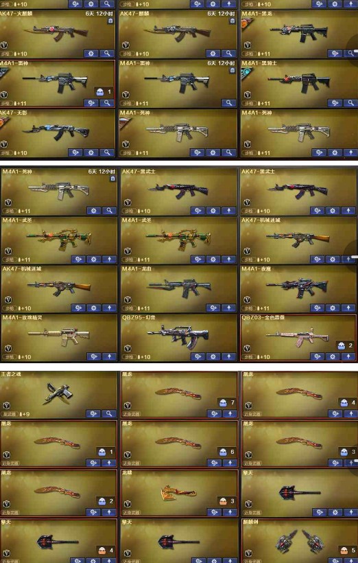 幻兽套M-200幻神青鹤蓝光三件套+M竞技荣光整套柯尔特世冠雷神COP夜魔套蔷薇+生化6烈6盘毒蜂;RPK-盘龙,QBZ03-金色蔷薇,M200-幻神,