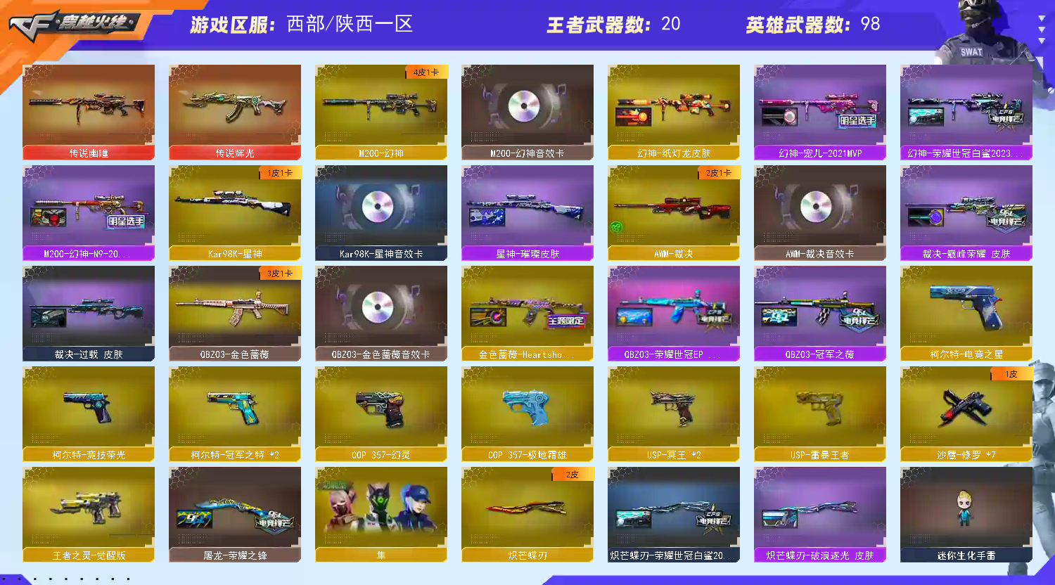 满配手枪 usp冥王*2 王者usp雷暴 炽茫蝶刃白鲨皮肤 幻神白鲨皮肤 宠儿皮肤 n9皮肤音效卡 热门武器都有炼狱小刚 白虎之魄 马枪 猫枪 王者风神 竞技荣光套 传说幽瞳 传说辉光 qbz音效卡 毁灭音效卡 幻神音效卡 雷神荣耀皮肤 毁灭荣耀皮肤 冠军之特 星神带卡 裁决带卡 希望各位老板玩的愉快;USP-雷暴王者,柯尔特-冠军之特,炽芒蝶刃,隼,电竞教官-云悠悠,RPK-盘龙,QBZ03-金色蔷薇,