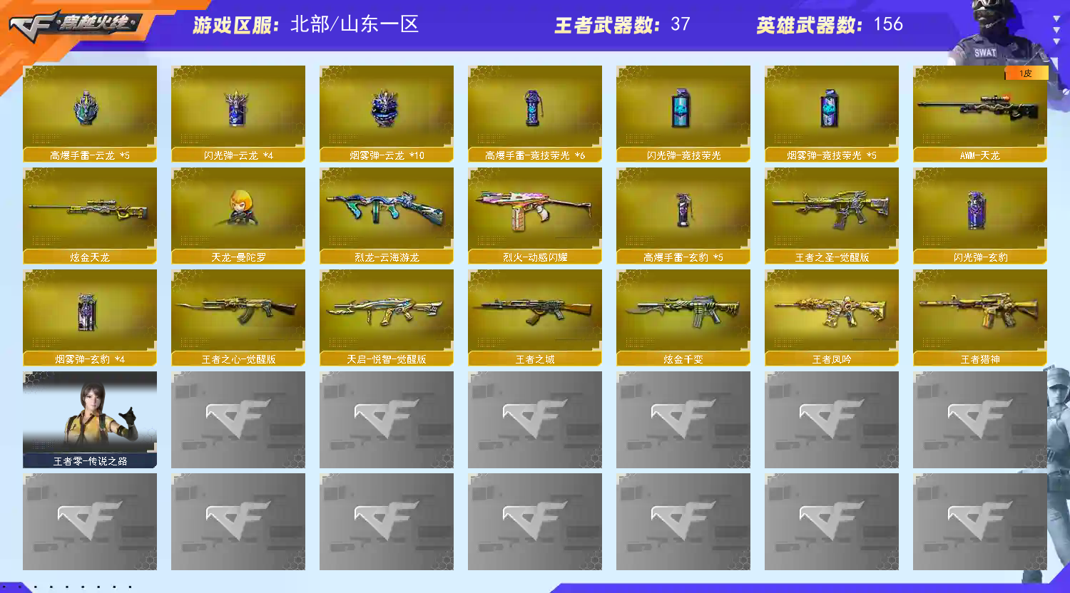王者人物六个,还有其他四防人物,人物属性有专门刷的生化和爆破属性,英雄级副武器有usp和三个cop和个玄豹左轮,还有十几个沙鹰,子弹加满满的。。。英雄级近身武器近三十个,蝴蝶刀炽芒碟刃,黄金猫猫手套,其他英雄级该有的都有。。英雄级手雷四五十个,背包全装满。。皮肤几十个(幻神皮肤星神毁灭雷神火麒麟qbz都有高质量皮肤),王者武器杂七杂八(王者芳薇王者m4王者火麒麟王者巴雷特麒麟刺屠龙天龙加特林好多),小人枪一大堆,有一套玄豹套和神巧天工套和云龙套和雷霆王者套,生化强化武器有狂怒咆哮和双面神和黑龙吞噬者,六烈六盘随便搭配,图片看着一堆重复的正常毕竟200v,够是够用了。。音效卡有幻神音效卡火麒麟音效卡雷神音效卡毁灭音效卡qbz金色蔷薇音效卡黑骑士音效卡hk朱雀音效卡,爆破生化该有的都有,都升级了,连续击杀间隔时间超过二十秒。有些截图可能未截到。 下班偶尔打个英雄联盟,会挤wegame。会挤wegame。会挤wegame。这个只有登录的时候会用到,请各位大佬不要挤回去了🙏🙏🙏。。 我会定期留着清理好友留着好友位,请各位大佬不要乱删我的,感谢 cf北部大区有河北一区、陕西一区、北京一区、北京二区、北京三区、北京四区、北方大区、山东二区、河南一区、河南二区、吉林一区、黑龙江一区、辽宁一区、辽宁二区和辽宁三区。登录选择山东一区祝各位老 板玩的开心。 最后,我们一起祝那些**的而且闲得蛋疼恶意毁号的**,早点家破人*吧;