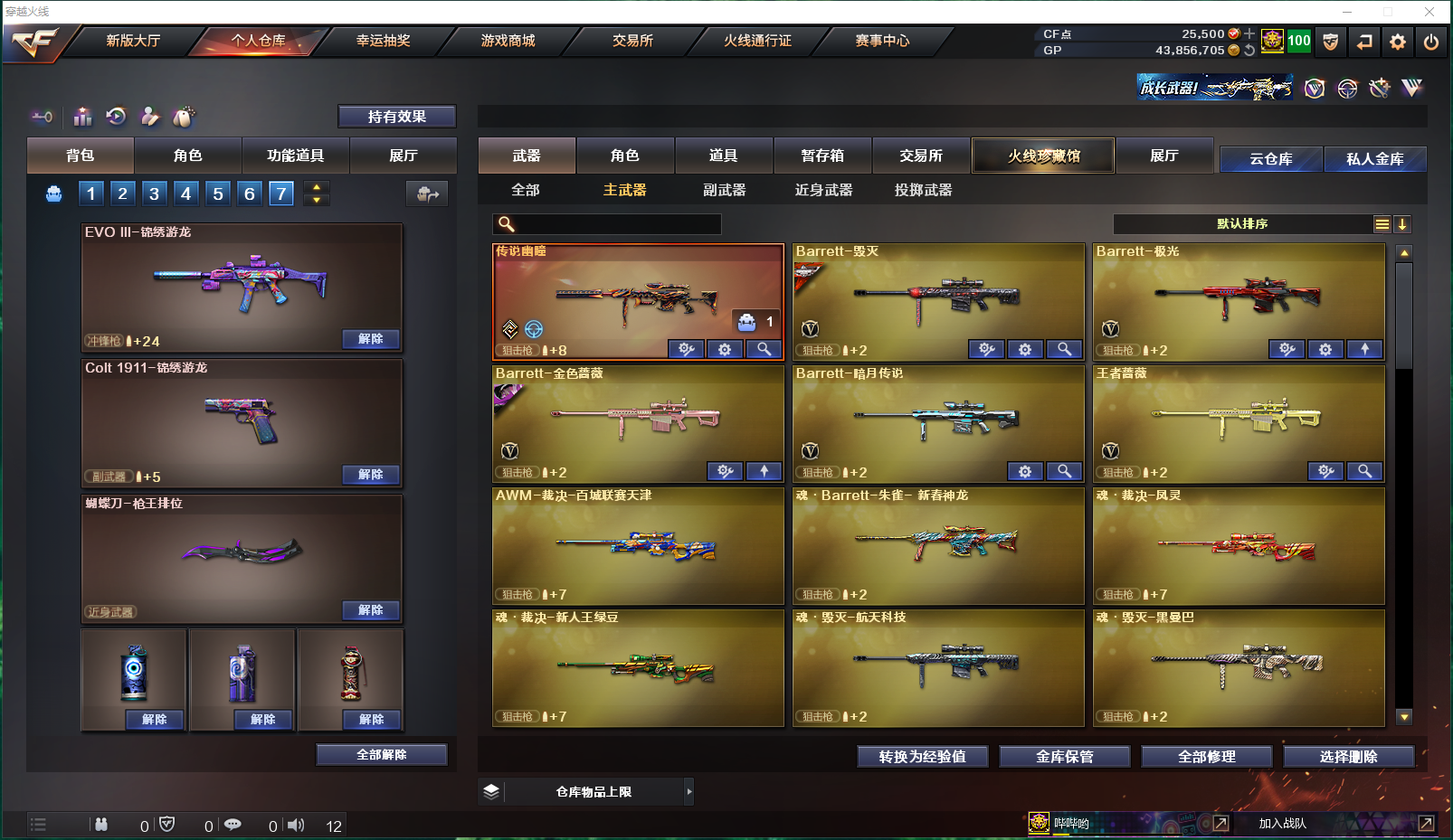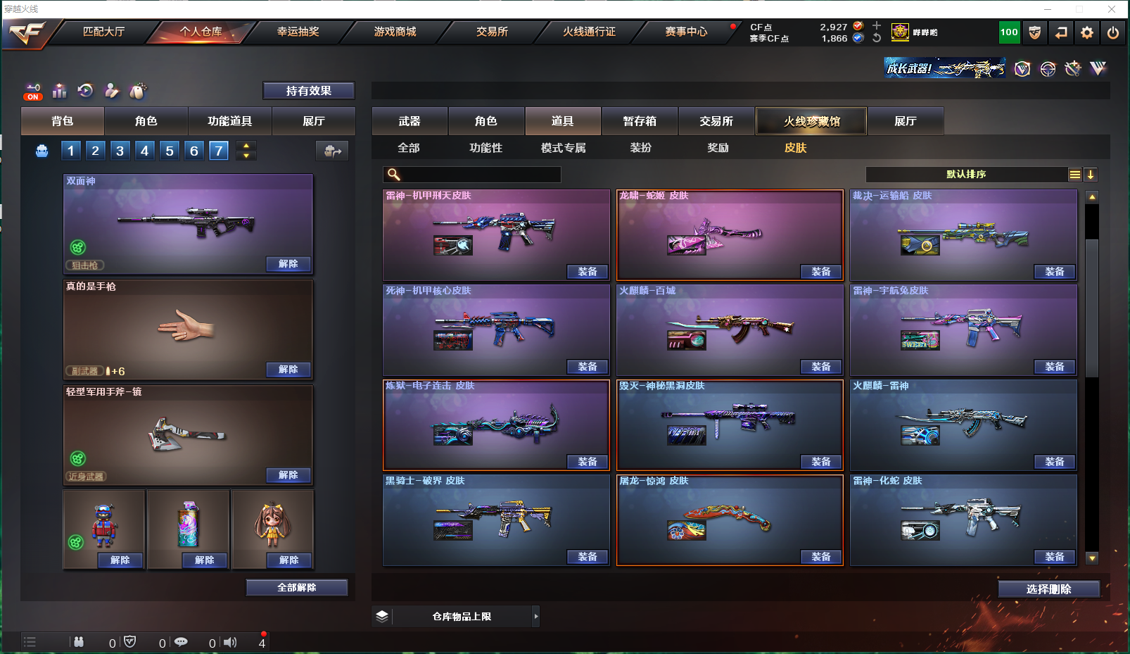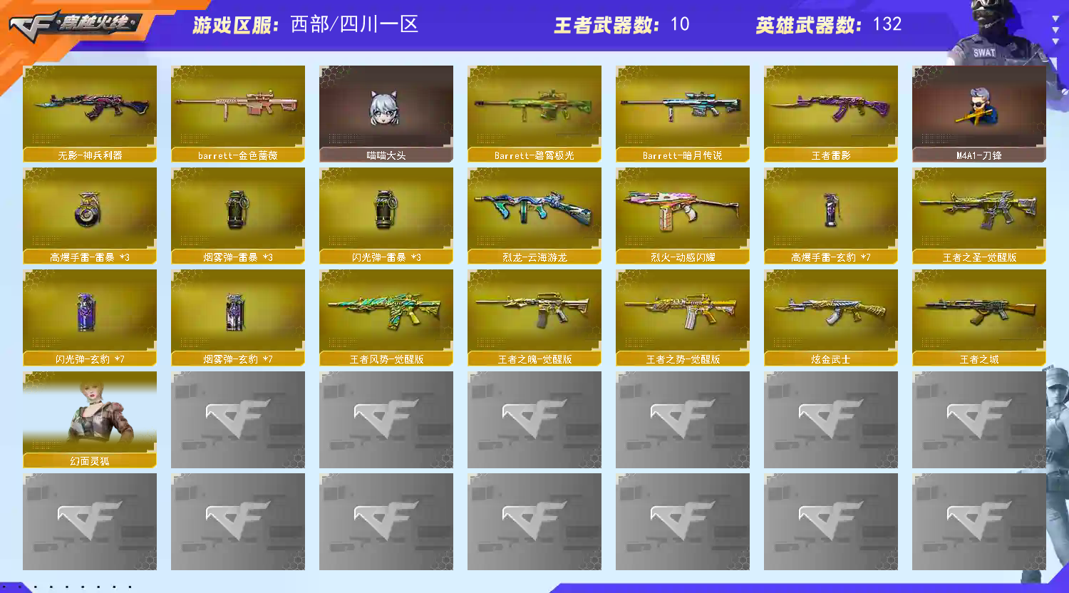 玄豹套:玄豹4防、ScarLight-玄豹(套装版白虎)、Anaconda-玄豹、丛林匕首-玄豹、高爆手雷-玄豹、闪光弹-玄豹、烟雾弹-玄豹、 【生化】:传说破晓、炽芒蝶刃(蝴蝶刀,生化加速神刀,最帅的耍酷刀)、斯泰尔-蝴蝶🦋、毒蜂、异变清道夫-蛇影双骄、异变清道夫、死亡之眼、双面神、轻型军用手斧-镜、黑龙吞噬者、 神秘方块-红色生化、机械猎手-幻灵猎姬、圣拳猎手-炽雪、救世主-黑桃战神、终极猎手-荒漠刀客、钢铁终结者-湮灭之柱、时空猎手-幻影猎人、终极猎手-秦魂将军、虚空终结者-暗域熔岩、女皇终结者-魔龙之吻、 迷你生化手雷、迷你生化手雷-黑桃战神、生化手雷-小钢、生化手雷-机甲核心、生化手雷、雄黄酒手雷、手雷-远古神话 妖姬、变异宝贝、疯狂宝贝、绿色巨人、灵魂忍者、迷雾幽灵、夺命之镰、生化弹匣、防化服、减少停顿道具(不退包) 超能女侍·觉(佣兵觉醒:无需装弹、生化觉醒:狂暴化、捕食者之眼、生化背包变更) 铁扇公主-暗灵(移动速度提升、捕食者之眼、生化背包变更) 【王者】:王者雷影、王者之城、王者风势、王者之魄、王者之圣、王者之势、王者蔷薇、王者樱-热浪之夏、炫金武士、 【皮肤】:雷神-机甲刑天皮肤、龙啸-蛇姬皮肤、裁决-运输船皮肤、死神-机甲核心皮肤、火麒麟-百城、雷神-宇航兔皮肤、炼狱-电子连击皮肤、毁灭-神秘黑洞皮肤、火麒麟-雷神、黑骑士-破解皮肤、屠龙-惊鸿皮肤、雷神-化蛇皮肤、毁灭-百城浙江皮肤、炼狱-玩具枪皮肤、Barrett-金色蔷薇-蛇姬皮肤、火麒麟-华夏之心、毁灭-黑大圣皮肤、火麒麟-AG战队皮肤、火麒麟-平天大圣、M4A1-千变-孔明皮肤、火麒麟-CFSTAR、天龙-CFSTAR、修罗-CFSTAR 【音效】:死神-雪域霜狐-怀旧音效卡、天神-动感闪耀音效卡、Barrett-碧霄极光音效卡、烈龙-云海游龙音效卡、AWM-昌龙-怀旧音效卡、炼狱-百战金芒-庆典舞曲音效卡、沙鹰-修罗-盛典舞曲音效卡 【挑战】:《主武器》:AK47-冰龙粉碎者、冰龙粉碎者-白马银枪、激光毁灭者Ⅲ、激光毁灭者Ⅲ-白马银枪、神圣爆裂者-末日Ⅲ、征服者-超越2、神罚、M240B-苍雷、末日裁决者、《副武》:巡航者、《近武》:等离切割者、龙泉剑-CFS2024、末日之拳、破天斩魔剑、双龙-秘银、轩辕剑-狐妖、斩神刀、夺魂、海斯博士双刃、克洛诺斯的凝视、迷你波特博士、迷你牛牛、迷你深渊冰龙、魔能环、魔能镰刀、萨拉坦铁棍、死亡之珠、唐刀-大唐荣耀、唐刀-青花瓷、唐刀-盛世太平、虚空之槌、《投掷》:反应堆手榴弹、疾爆手雷-点击连击、魔花手雷、深渊终结者手雷、手雷-波特魔方、无尽虚空手雷、疾爆手雷-河马、;炽芒蝶刃,RPK-盘龙,QBZ03-金色蔷薇,传说幽瞳,