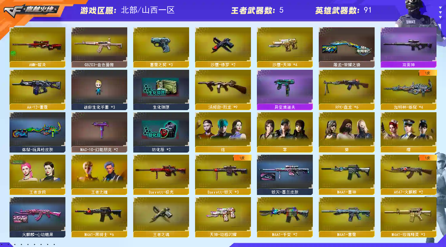 穿越火线,北部,山西一区,98V,0传说/8王者/3炫金/91英雄/【重要角色9】王者之瞳/王者涂鸦/王者零传说之路/樱(普通)/炫/葵 (普通)/铁骑荣耀/零(普通)/零水下丽影【王者武器5】天启-悦智/王者之怒/烈龙-悦心/王者之啸-觉醒版/王者之魂【炫金武器3】炫金黑龙/炫金武士/炫金千变【热门武器24】死亡之眼*3/9烈龙/6盘龙/2修罗)4炼狱【英雄武器87】M4A1-黑骑士*6/无影-神兵利器/AN94-超新星/QBZ03-金色蔷薇/AK47-火麒麟*2/M4A1-千变*2/M4A1-雷霆/M4A1-玫瑰精灵*3/烈火-动感闪耀/M4A1-雷神/AK47-黑武士/ Barrett-毁灭*3/AWM-裁决/雷霆之怒/AWM-天龙) Barrett-极光/汤姆逊-烈龙*9/RPK-盘龙*6/加特 林-炼狱*4/屠龙*3/屠龙-动感闪耀/雷霆之锋/龙啸/ 麒麟刺/擎天/AA-12-雷霆/手雷-动感闪耀/闪光 弹-雷霆*7/烟雾弹-雷霆*7/高爆手雷-雷霆*7/沙 鹰-天神*4/沙鹰-修罗*2/天神-动感闪耀/雷霆之契*3【热门皮肤武器4】火麒麟-CFSTAR/屠龙-荣耀之锋/火麒麟-心动糖果/天龙-秘银【人偶武器武器11】COP-旗袍/迷你裂空之翼*2/迷你波特博士*2/迷你生化手雷*3/生化手雷-机甲核心/深渊终结者手雷/AWM-灵狐-15周年嘉年华【暴走生化武器22】死亡之眼*3/汤姆逊-烈龙*9/RPK-盘龙*6/异变清道夫/KAC-狂怒咆哮/黑龙吞噬者/双面神【挑战武器武器12】M4A1-黑骑士*6/神圣爆裂者-末日川/激光毁灭者川-白马银枪/激光毁灭者|/激光毁灭者Ⅲ/冰龙粉碎者-白马银枪/乱世-超越1【普通皮肤2】炼狱-玩具 枪/毁灭-墨兰 (号主备注:4技能人物);RPK-盘龙,QBZ03-金色蔷薇,