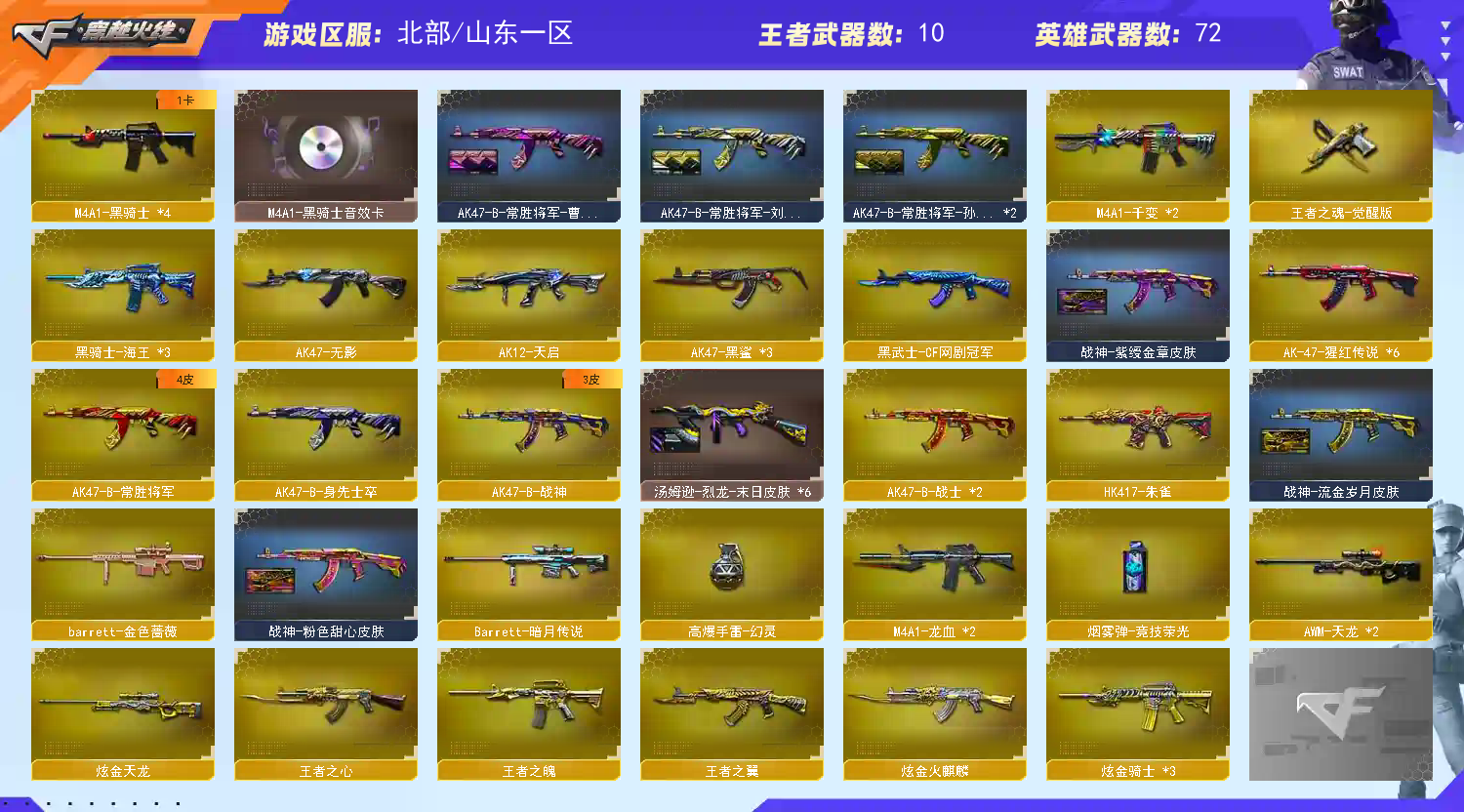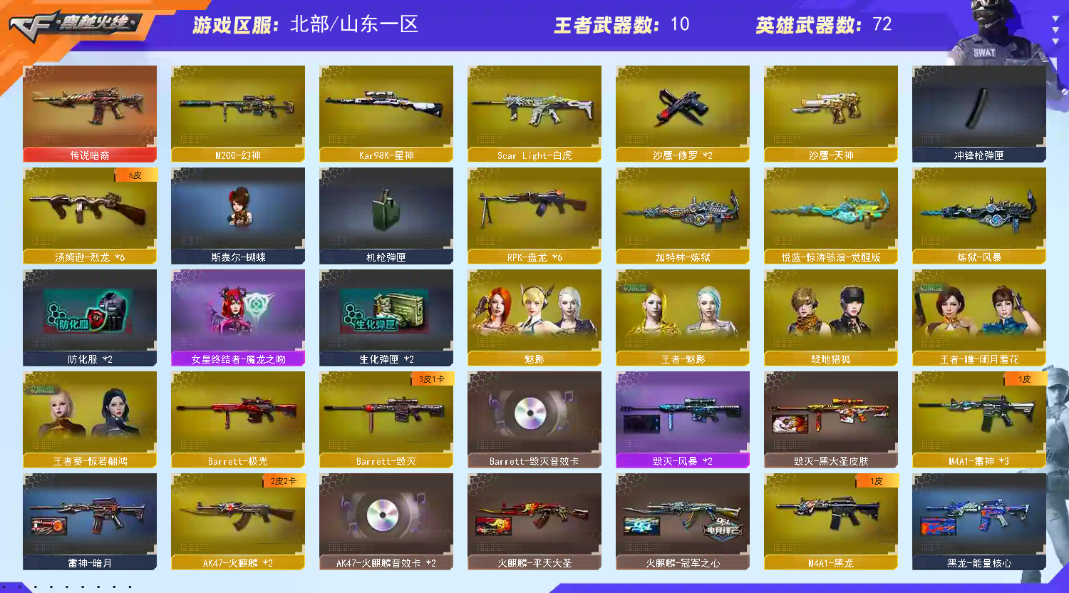 72V 1传说 10王者 5炫金 传说暗裔 M200幻神 98K星神 6盘龙 6烈龙+斯泰尔蝴蝶 【重要角色】王者瞳闭月羞花/王者葵惊若翩鸿/王者魅影/铁骑荣耀/零水下丽影/角色-魅影/角色-职业经理【热门武器27】M200-幻神/Kar98K-星神/斯泰尔-蝴蝶/C.A.T/死亡之眼/HK417-朱雀/白虎/6烈龙/6盘龙/2修罗/炼狱/黑骑士-摸金校尉*2/M200-庆典-CFS 2021/雷神-赛博朋克(武器)*2【英雄武器】M4A1-黑骑士*4/AK47-黑鲨*3/M4A1-龙血*2/9A91-烈火*2/M4A1-黑龙/AK-47-猩红传说*6/HK417-朱雀/AK47-火麒麟*2/黑骑士-海王*3/AK47-B-战神/M4A1-雷神*3/Scar Light-白虎/AK47-无影/M4A1-千变*2/AK47-B-常胜将军/AK47-B-身先士卒/AK47-B-战士*2/黑武士-CF网剧冠军/AK12-天启/AWM-天龙*2/M200-幻神/barrett-金色蔷薇/Barrett-极光/Barrett-毁灭/Barrett-暗月传说/Kar98K-星神/汤姆逊-烈龙*6/RPK-盘龙*6/炼狱-风暴/加特林-炼狱/擎天/屠龙*2/麒麟刺/擎天-CF网剧冠军/高爆手雷-幻灵/烟雾弹-竞技荣光/沙鹰-天神/天神-CF网剧冠军/沙鹰-修罗*2【热门皮肤武器】火麒麟-冠军之心/天龙-CFSTAR*2/火麒麟-CFSTAR*2/修罗-CFSTAR*2/毁灭-风暴*2/火麒麟-平天大圣/毁灭-黑大圣/火麒麟-AG【音效卡武器】AK47-火麒麟音效卡/AK47-火麒麟音效卡/Barrett-毁灭音效卡/M4A1-黑骑士音效卡;RPK-盘龙,M200-幻神,Scar Light-白虎,Kar98K-星神,传说暗裔,