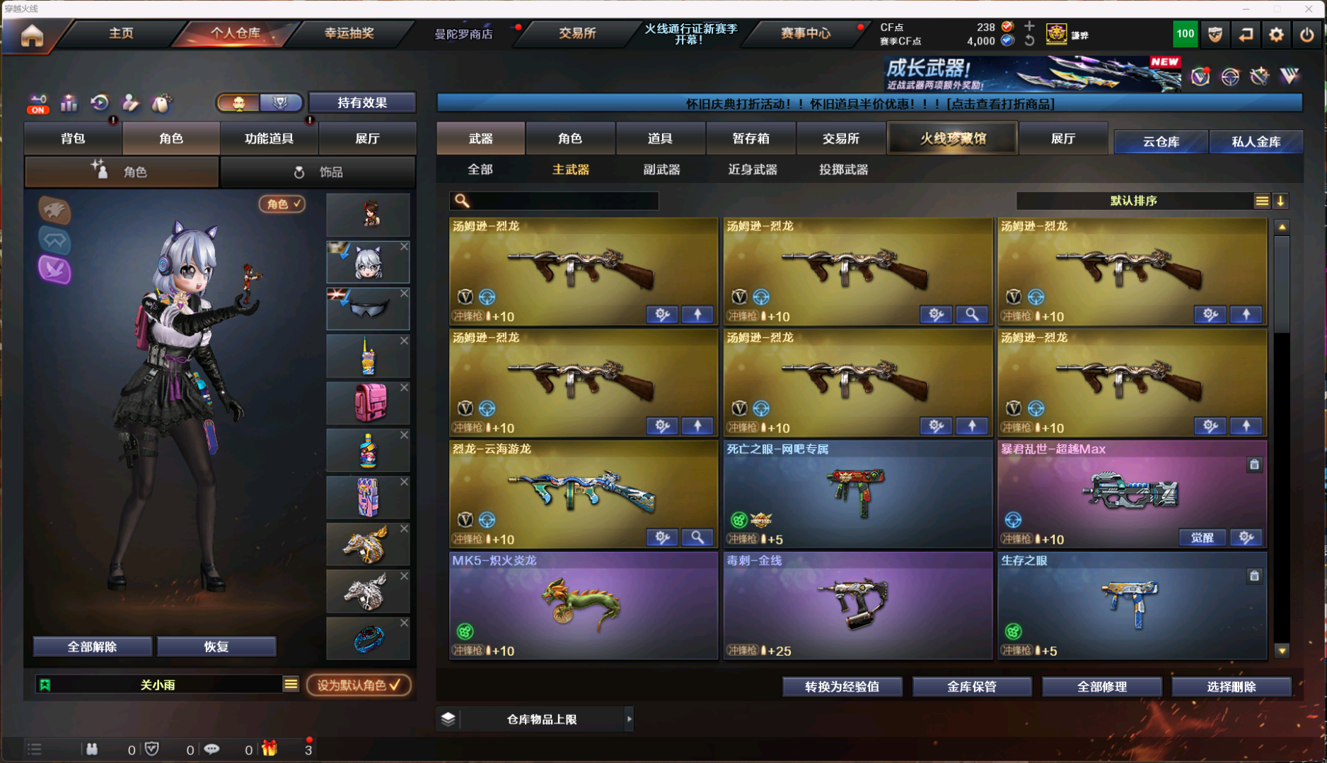 生化爆破全装✅四防关小雨+6烈蝴蝶6盘炼狱+炽芒碟刃🔥G36幻影+八面凌龙+星神🔥 西部战区合区大区(四川一区、四川二区、重庆一区、陕西一区、**南一区)登录的时候选择四川二区。 【编号】:SC398 【角 色】:关小雨、晴雅、电竞教官云悠悠、机械姬、王者零国色天香(佣兵觉醒、生化觉醒、捕食者之眼)、王者零华冠丽服、王者零、乔伊教练、樱、云海游龙、狐影、葵、风暴女、救世主-X、蜀雪、铁骑荣耀、影舞者-X、8周年戒指、双蛇戒指、双龙戒指 【主 武】:98K星神、6烈龙斯泰尔蝴蝶、6盘龙加特林炼狱、王者之怒、炫金黑龙、炫金雷神、炫金毁灭、炫金天龙、千变、火麒麟X2、黑龙、雷神(脉冲核心)、无影、黑骑士X3、死神、黑武士、天启X3、超新星、无影神兵利器、烈火动感闪耀、金色请问、海王、白虎枪娘安尼、天龙、毁灭X3、极光X2、裁决、巴雷特金色蔷薇、毁灭征服者、冰龙粉碎者、机甲撕裂者、激光毁灭者、圣炎切割者、深渊巨龙咆哮、神圣爆裂者、试炼破坏者、苍雷、金魔等各种活动武器 【副 武】:修罗X6、天神动感闪耀X2、修罗云海游龙、天神CF网剧冠军、阐释者、COP小青龙、胜利之火、大黄蜂 【近 身】:炽芒蝶刃、王者之锋、屠龙X2、龙啸X2、擎天、麒麟刺X2、屠龙动感闪耀、擎天云海游龙、龙啸烈火龙威、金刚伞、丛林匕首-枪王排位、猫猫手套、激光短刃、冰火魔拳 【投 掷】:手雷动感闪耀、手雷云海游龙、迷你生化手雷、深渊终结者手雷、胜利之光、高爆手雷-雷蛇、高爆手雷-SS 【道 具】:黑骑士音效卡、中国娃玩偶、红色艾比玩偶、金色曼提克玩偶、14个背包、AC(防弹衣+防弹头盔)、C4工具钳、手雷包、挑战弹夹、夺命之镰、变异宝贝、灵魂忍者、生化弹夹、防化服、机枪弹夹、冲锋枪弹夹、散弹枪弹夹、手枪弹夹、狙击枪弹夹、步枪弹夹、减少停顿包;炽芒蝶刃,电竞教官-云悠悠,晴雅,RPK-盘龙,QBZ03-金色蔷薇,G36C-幻影,Scar Light-白虎,