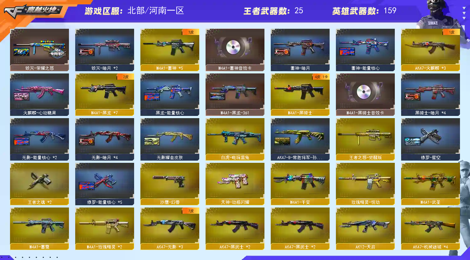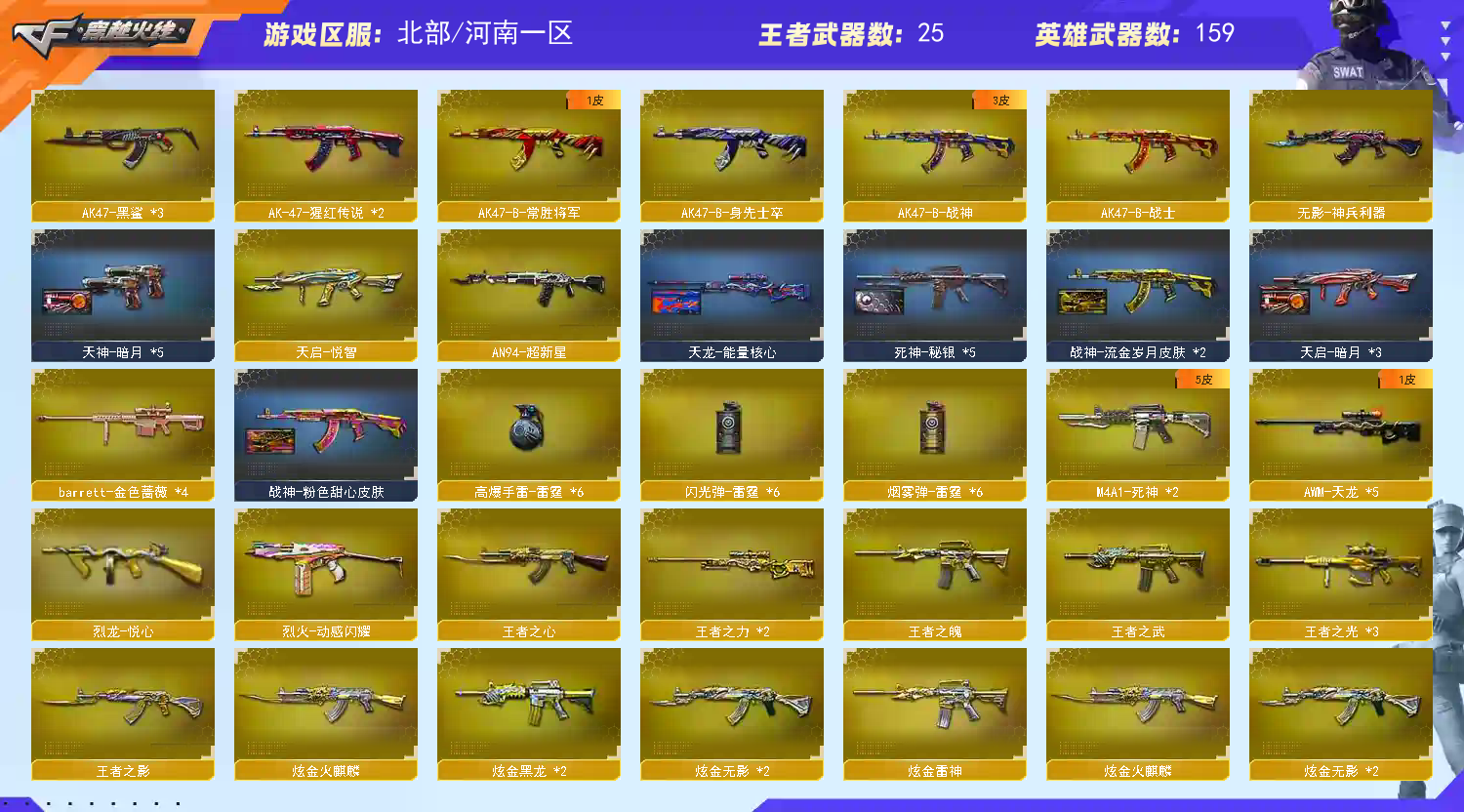 【遇到信用分不足时请去旧版大厅进入普通频道,勿下载使用科技,感谢你么么哒】 【步枪系列】M4A1-雷神*5/黑龙*7/千变/黑骑士/死神*2/武圣/雷霆/玫瑰精灵*2/能量核心/AK47-火麒麟*2/无影*3/黑武士*2/机械迷城*4/黑鲨*3/黑武士暗月/能量核心/冰龙粉碎者/白虎/9A91烈火*2/天启/超新星/金色蔷薇*2/烈火动感闪耀 【狙击枪】 AWM-天龙*5/裁决/Barrett-毁灭*15/极光*2/金色蔷薇*4/暗月传说 【辅助枪】 RPK-盘龙 *9/ 加特林炼狱*4/汤姆逊-烈龙*8/征服者/神圣爆裂者末日/ M37-葵/迷你生化手雷/死亡之眼/ 斯太尔蝴蝶 / 六烈六盘 / 六盘六烈 / 6烈6盘 / 6盘6烈 /生化号 / 爆破号 / 【炫金王者】玫瑰精灵-悦动/天启-悦智/王者之魄/王者之势/王者之武/王者之心/王者之影/王者之光*3/王者之力/王者之怒/王者之魂*2/王者之击觉醒/王者之锋/炫金黑龙/雷神/无影/火麒麟/毁灭/修罗/超新星-悦享 【角色】王者炽天使【生化4防】乔伊教练/葵/零/瞳/樱/炫/狐影/王者零/王者瞳/兰-海滩派对/零-水下丽影/灵狐者-黄金海岸/曼陀罗-X【佣兵觉醒 无需换弹7秒/生化觉醒 狂暴化】 【副武器】 /沙鹰-天神*7 /沙鹰-修罗*6/雷霆/幻兽/闸释者III/COP-旗袍/MAC-涂鸦/天神动感闪耀 【近身武器】麒麟刺 *4/ 龙啸*4 / 屠龙 *10 /擎天/尼泊尔雷霆/女皇利刃-幻兽/屠龙动感闪耀/手斧-镜/唐刀 【投掷武器】幻兽套装/雷霆套装*6/迷你生化手雷 【通用道具】双1-7背包 / 手枪弹匣 / 金蛇戒 / 狙击枪弹夹 / 魔龙戒 / 散弹枪弹夹 / 圣龙戒 / 挑战弹夹 / 银蛇戒 / 防弹头盔 / 烟雾保护头盔 / 防弹衣 / C4工具钳 / 手雷包 / 步枪弹匣 / 冲锋枪弹匣 / 机枪弹匣 / 闪光护目镜/超级护目镜/超级背包/透明头盔/透明护目镜/ 超级对讲机 /新彩色昵称/C4.红龙 【生化专用道具】永久生化弹夹/防化服/幽灵之刃/减少停顿道具(不退包)/灵魂忍者/绿巨人/变异宝贝/伪装幽灵/ 迷你生化手雷 / 肩膀佩戴超级对讲机(榴弹3/22) 【皮肤音效玩偶】【火麒麟CFSTAR】【黑龙361/暗月/能量核心】【雷神暗月/能量核心】【死神秘银】【天启暗月】【天龙能量核心】【毁灭星空/荣耀之怒/暗月】【极光能量核心】【修罗能量核心/STAR/星空】【天神暗月】玩偶小兔姬/铁骑/幸运猪猪/幸运鼠/三国玩偶 【音效卡-雷神-毁灭】 【4大战区】北部战区;RPK-盘龙,QBZ03-金色蔷薇,Scar Light-白虎,
