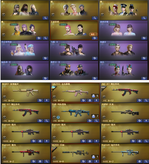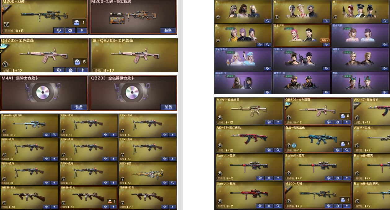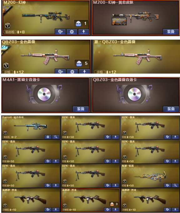 幻神+黄忠皮+6烈6盘+死亡+炼狱+生化爆破全装+5王者+7修罗+IQBZ金色蔷薇+冠军之薇+音效 17修罗|黑骑+冠军之势+音效;柯尔特-冠军之特,Knife-冠军之刃,RPK-盘龙,QBZ03-金色蔷薇,M200-幻神,