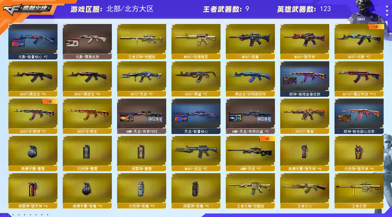 北部号 123V可排🔥王者幻神/零/朱雀🔥夜魔/堕天神/冠军套🔥传奇EVEN白鲨/白鲨冠军/霓裳皮【北方大区登录】【炫金稀有顶1V介意者勿租】【恶意投诉、撤单不想玩了租错号了等非帐号问题1律拉黑】【此号已备案请勿以身试法】【开挂必究账号价值超高】详细武器请看下方 【重要套装】堕天神套装/网剧冠军套装/夜魔套装 【重要角色】_迷迭香/_葵/王者玲珑/王者-零/铁骑荣耀 【英雄武器】王者幻神-觉醒版/Barrett-毁灭(4)/Barrett-极光(3)/AWM-天龙(2)/AWM-裁决(4)/M4A1-堕天神/M4A1-雷神(2)/M4A1-黑龙(3)/M4A1-龙血(2)/M4A1-黑骑士(3)/M4A1-夜魔/M4A1-玫瑰精灵/王者之魄-觉醒版/HK417-朱雀/AK12-天启(2)/AK47-火麒麟(3)/AK47-无影(2)/AK47-黑鲨(2)/AK47-黑武士(4)/黑武士-CF网剧冠军/AK-47-猩红传说(13)/AK47-B-战士/AK47-B-战神(2)/QBZ03-金色蔷薇/9A91-烈火(2)/RPK-盘龙(2)/汤姆逊-烈龙(5)/烈龙-悦心-觉醒版/加特林-炼狱/COP-堕天神(3)/沙鹰-天神/天神-CF网剧冠军/沙鹰-修罗(2)/破空枪刃-夜魔/麒麟刺/麒麟刺-堕天神(2)/龙啸/龙啸-堕天神/擎天/擎天-CF网剧冠军/屠龙(2)/雷霆之锋/马来剑-夜魔/高爆手雷-雷霆/高爆手雷-夜魔(5)/高爆手雷-堕天神(6)/烟雾弹-雷霆/烟雾弹-夜魔(5)/烟雾弹-堕天神(6)/闪光弹-雷霆/闪光弹-夜魔(5)/闪光弹-堕天神(6) 【王者武器】王者之武/王者之心/王者之城/王者之怒 【小人枪】M4A1-雷神-精英刀锋/巴雷特-零-水下丽影/M37-葵/迷你深渊冰龙/闪光弹-小乔 【其他重要武器】炫金无影/炫金骑士/炫金雷神(3)/黑骑士-摸金校尉/M4A1-破空冰刃/M4A1-樱/QBZ03-烛龙/M4A1-电音(2)/AK47-齐天大圣/AK47-十年火线/M4A1-肯德基(2)/M4A1-情人节2019/AK47-破空冰刃/M14EBR-赤血龙魂(2)/AK47-枪娘/M4A1-十年火线/9A-91翡翠/AK47-轮回(2)/M4A1C-死亡之翼/AK-47-二次元/AK47-大帝林肯/AK47-娜塔莎/M4A1-秘银赤龙(5)/黄金AK-47(2)/火麒麟-桃园结义/M14EBR-情人节2020(2)/AK12-枪王排位/M4A1-紫狱/AK47-SS-枪王排位(2)/AK47-狂欢-CFS/M4A1-SS-枪王排位/AK-12-CFS2017纪念版/M4A1-狂欢-CFS/M200-涂鸦/M200-赤血龙魂(3)/AWM-十周年/98K-蓝色骑士/AWM-涂鸦/98K-烛龙/M200-情人节2019(2)/AWM-蓝水晶(2)/M200-万圣节/AWM-卡通/暗金M200/AWM-S/黄金AWM/EVO III-赤血龙魂(5)/EVOⅢ-黑金传说/征服者-地狱之火 [Lv Max]/Spas-12-黑金/沙鹰-青龙/愤怒公牛左轮-枪王排位(2)/沙鹰-枪王排位/新USP-枪王排位奖励(4)/幻影Anaconda-枪王排位/Anaconda-雷电核心(2)/沙漠之鹰-A-摸金校尉/新USP-怒火大圣/Anaconda-黑金神龙/COP-十二生肖-蛇/Anaconda-炽焰核心/COP 357--绚樱/幻影沙鹰-枪王排位/军用铁锹-赤龙/丛林匕首-枪王排位/军用铁锹-飞龙在天/鹰爪-枪王排位/虹光鹰爪-枪王排位/蝴蝶刀-枪王排位/斩魔刀-怒火大圣/虹光丛林匕首-枪王排位/丛林匕首-卧龙(4)/闪光弹-枪王排位(3) 【重要武器皮肤】极光-能量核心/毁灭-冠军之怒/雷神-冠军之魄/毁灭-星空/毁灭-荣耀之怒/AWM-天龙-传奇70KG/AWM-天龙-传奇白鲨/天龙-能量核心/M4A1-雷神-白鲨皮肤/雷神-荣耀之魄/雷神-能量核心/黑骑士耀金皮肤/黑龙-能量核心/M4A1-千变-孔明皮肤/AK47-火麒麟-传奇EVEN/火麒麟-CFSTAR/火麒麟-AG/无影-霓裳皮肤/无影-能量核心/战神-紫绶金章皮肤/战神-粉色甜心皮肤 【重要光效】王者之光金色光效/王者之心金色光效/王者之怒金色光效/王者之魄金色光效/AK47-黑武士蓝色光效/AWM-天龙蓝色光效/巴雷特-毁灭蓝色光效/M4A1-雷神蓝粉色光效/汤姆退-烈龙绿色光效 【重要音效卡】M4A1-黑骑士音效卡 【重要戒指】龙眼(死神)/金蛇戒/银蛇戒/16赛季纪念戒指-枪王耀金/17赛季纪念戒指-耀金/18赛季纪念戒指-耀金/20赛季纪念戒指-耀金/21赛季纪念戒指-耀银(拇指)/22赛季纪念戒指-耀铜(食指)/22赛季纪念戒指-耀银(拇指)/23赛季纪念戒指-耀银(拇指);RPK-盘龙,QBZ03-金色蔷薇,