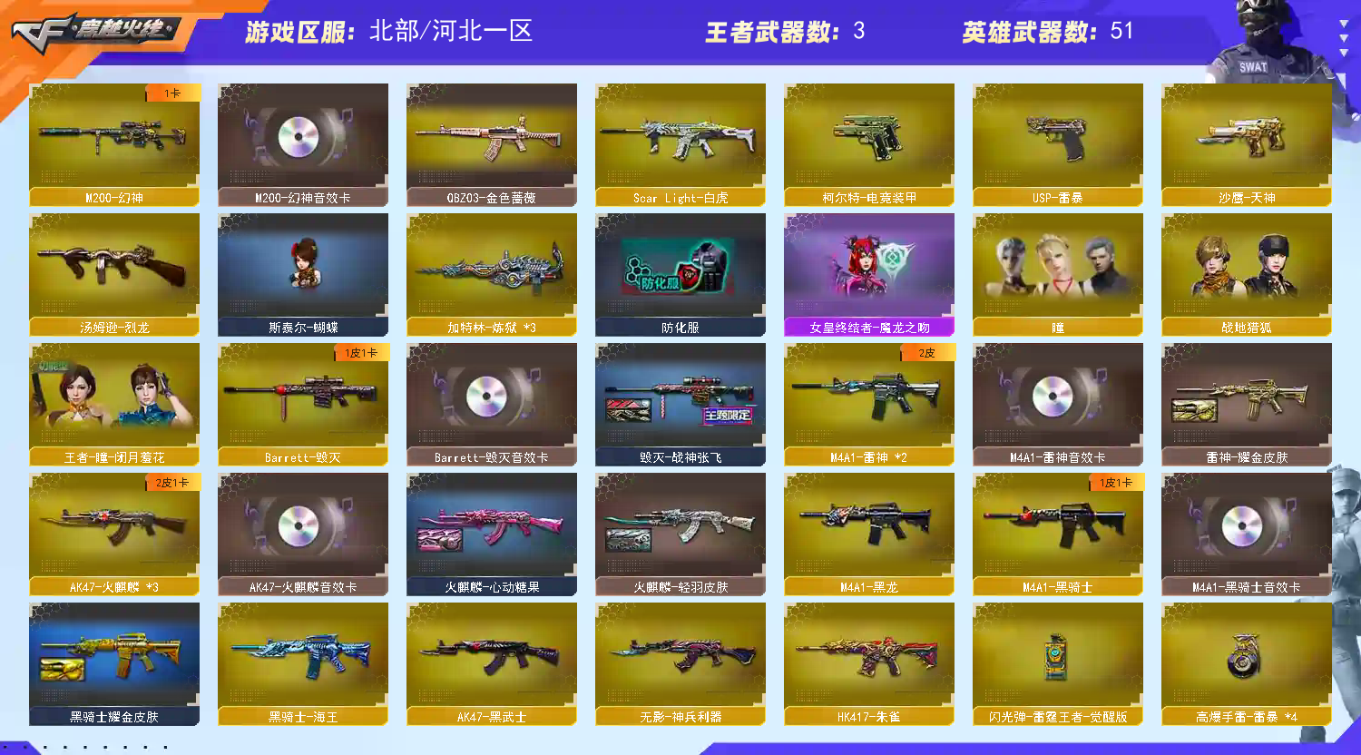 文明游戏,禁止开挂;USP-雷暴,QBZ03-金色蔷薇,M200-幻神,Scar Light-白虎,