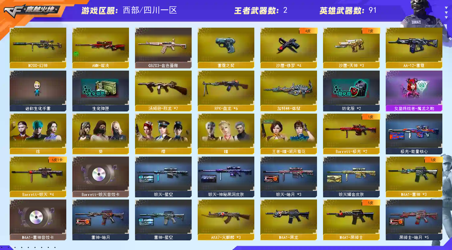 西部百V幻神/M-200幻神/COP雷霆整套+王者之鲨QBZ蔷薇朱雀6盘龙7烈+死亡之眼;RPK-盘龙,QBZ03-金色蔷薇,M200-幻神,