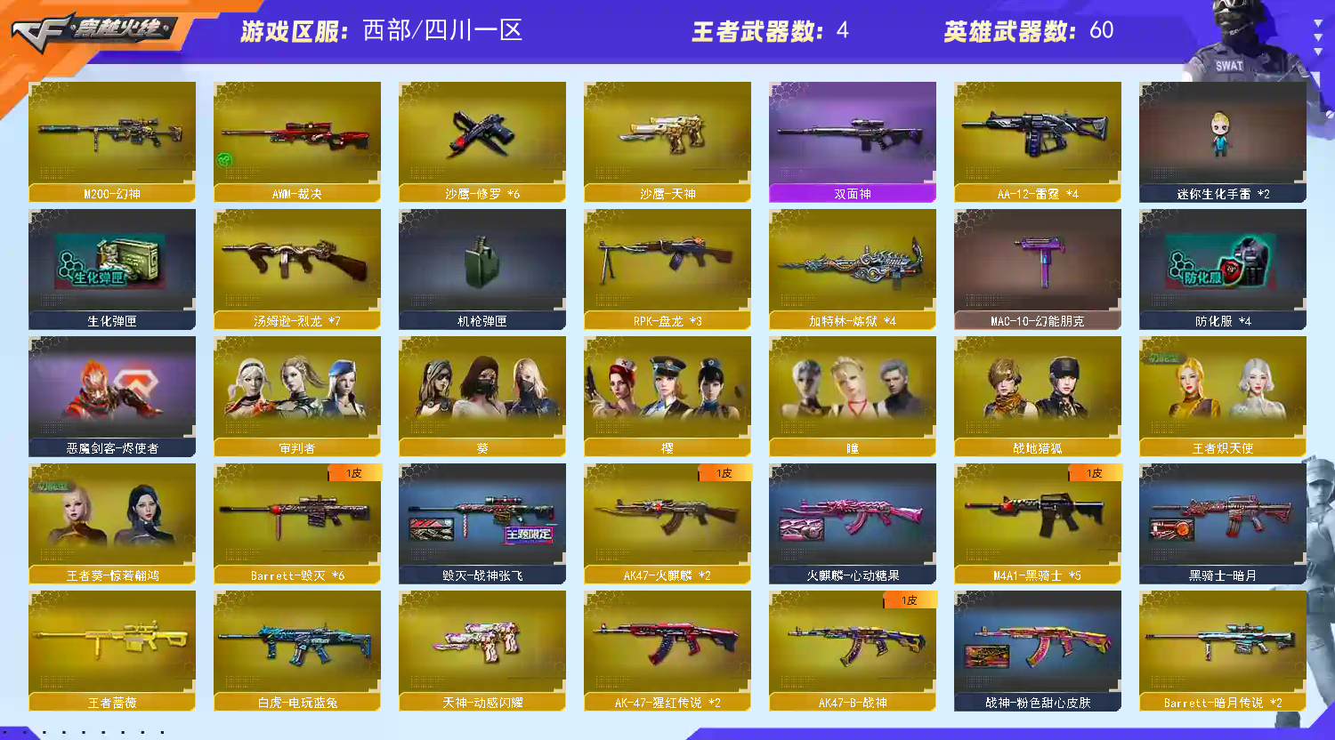 8.15日新增:封神放逐者,甄选金狐套装,挑战九阶段 九阶段+六黑骑士+168套装 【段位】:VIP5 2.4日 荣耀之巅 【区服】:四川一区 【昵称】:莪喓打十个 【编号】:CF02 【套装】:无 喓 【王者】:王者之魄,王者炎心,炫金骑士,王者蔷薇,炫金毁灭,王者之啸*2, 【主武器】:①步枪:AK47火麒麟(染色包1.2),M4A1黑骑士*5(暗月),M4A1死神,M4A1死神,9A91烈火*2,AK47猩红传说*3,AK47-B战神,白虎电玩蓝兔,王者之魄,王者炎心,炫金骑士,各种魂、御、源。 ②狙击枪:M200幻神,Barrett毁灭*7(染色包1.2-战神张飞),AWM裁决, Barrett暗月传说*2,王者蔷薇,炫金毁灭, ③机枪:RPK盘龙*3,加特林炼狱*4, ④冲锋枪:汤姆逊烈龙*7,死亡之眼, ⑤散弹枪:AA12雷霆*4, 【副武器】:沙鹰修罗*6,沙鹰天神,Colt1911大黄蜂, 【近身武器】:屠龙*2,龙啸,擎天,麒麟刺*3,王者之啸*2 【投掷武器】:迷你生化手雷*2,双生雷恶棍,各种投掷武器。 【挑战武器】:腐蚀激光超越MAX,腐蚀激光超越2,机甲撕裂者III*2,冰龙粉碎者白马银枪,白虎电玩蓝兔,激光毁灭者III,深渊巨龙咆哮III,巨龙咆哮III,M240B苍雷,乱世超越3,VEPR-12-金魔,试炼破坏者III,神圣爆裂者III,征服者*3,VEPR-12-紫魔,神圣爆裂者末日III,阐释者III*3。 【角色】:葵,审判者,瞳,樱,王哲奎惊若翩鸿,堕天使、复仇者等各种强化功能型角色。 【皮肤】:黑骑士暗月,毁灭战神张飞,战神粉色甜心 【光效】:沙鹰修罗蓝色光效,M4A1死神蓝色光效, 【音效】:无 【击杀图标】:23赛季击杀图标1,电玩兔兔,CFS 【玩偶】:赵云,兔子泰迪娃娃,红色艾比,悦动,王胖子。 【道具】:A背包套装扩展券,7背包,烟雾头26天,闪光护目镜315天,炫彩背包,Q9战队炫彩背包,SV战队炫彩背包,特殊水壶,圣龙戒,魔龙戒。夺命之镰,妖姬,疯狂宝贝,灵魂忍者,变异宝贝,生化弹匣,防化服,减少停顿道具(不退包),散弹枪弹夹,步枪弹夹,狙击枪弹夹,机枪弹夹,冲锋枪弹夹,手枪弹夹,防弹头,防弹衣,C4工具钳,手雷包。 挑战全装,6烈6盘,7烈7盘,六烈六盘,七烈七盘。;RPK-盘龙,M200-幻神,