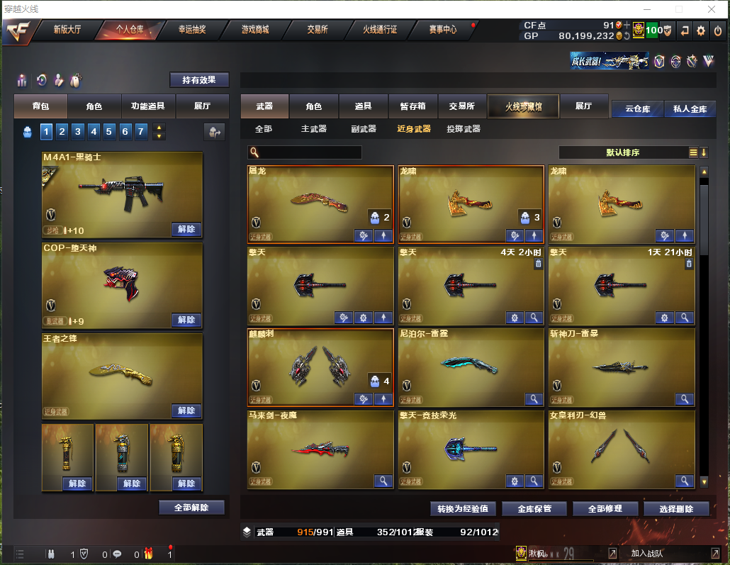 【主武器】异变清道夫蛇影双娇/斯太尔蝴蝶炼狱悦蓝觉醒④炼狱⑥烈龙⑥盘龙/青龙/M4夜魔/千变/3火麒麟/2雷神/黑龙/3黑骑士/无影/黑武士/机械迷城/黑鲨/龙血/玫瑰精灵/3烈火/2天龙/3毁灭/2极光/裁决/2蔷薇大炮/王者之光觉醒/3暗月传说大炮/AA12雷霆/王者之武/炫金骑士/A180蓝色骑士/ 【副武器】COP-堕天神/破空枪刃夜魔/沙鹰-幻兽/王者之魂/王者之灵/天神/7修罗/2涂鸦手枪 【近身武器】擎天竞技荣光/尼泊尔雷霆/4屠龙/2龙啸/擎天/麒麟刺/斩神刀雷暴/马来剑夜魔/女皇幻兽/王者之峰/手斧镜 【投掷武器】12英雄级高爆/5高爆夜魔+烟闪/3高爆雷暴+烟闪/2高爆雷霆+烟闪/高爆竞技荣光+烟闪/高爆幻兽+烟闪/迷你生化手雷 【角色】王者零传说之路+三防/葵/零/初恋令狐+无需换弹+捕食者之眼/对讲机/炫彩背包 【皮肤】修罗星空皮肤/黑骑士耀金皮肤/雷神虎将皮肤/无影霓裳皮肤/ 【音效卡】雷神音效卡/黑骑士音效卡/ 【道具】元首/全背包/vip6/变异宝贝/全弹夹/生化爆破全装;RPK-盘龙,
