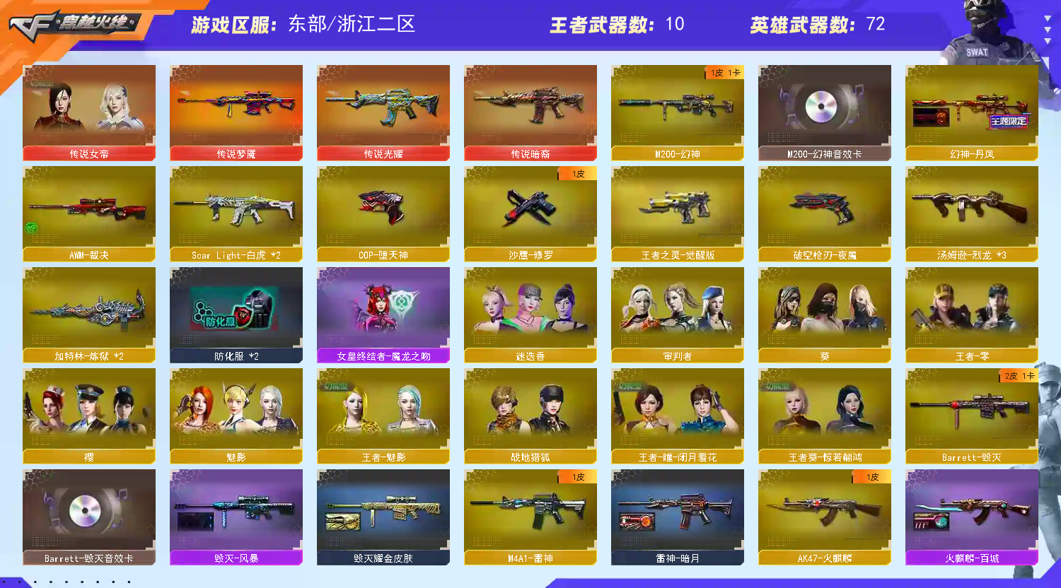 传说女帝梦魇光耀暗裔|M200幻神丹凤音效王者幻神|白虎朱雀|4烈死亡之眼|3音效|生化爆破全装号 东部战区合区大区(安徽一区、福建一区、上海一区、上海二区、浙江一区、浙江二区、江苏一区、江苏二区、教育大区、移动专区)登录的时候选择浙江二区 【编号】:ZJ294 【角 色】:传说女帝、葵、迷迭香、审判者、王者零、王者瞳闭月羞花、王者魅影、王者葵惊若翩鸿、樱、魅影、莎莎、风暴女、救世主-X、蜀雪、铁骑荣耀、影舞者-X、8周年戒指、双蛇戒指、双龙戒指 【主 武】:传说梦魇、传说暗裔、传说光耀(9999)、幻神(丹凤)、王者幻神、白虎X2、HK朱雀X2、4烈死亡之眼、火麒麟(心动糖果皮肤)、黑龙(能量核心)、雷神、黑骑士X6(白马银枪)、无影(霓裳)、天启、超新星、武圣、黑鲨、猎神、烈火、黑武士网剧、炼狱X2、天龙(STAR)、毁灭(耀金)、裁决、毁灭征服者、冰龙粉碎者、机甲撕裂者、激光毁灭者、圣炎切割者、深渊巨龙咆哮、神圣爆裂者、试炼破坏者、苍雷、金魔等各种活动武器 【副 武】:修罗(STAR)、武圣、COP堕天神、破空枪刃夜魔、天神网剧、王者之魂、阐释者、COP小青龙、胜利之火、大黄蜂 【近 身】:屠龙X2、龙啸、擎天、麒麟刺、麒麟刺堕天神、龙啸堕天神、马来剑夜魔、擎天网剧、丛林匕首-枪王排位、猫猫手套、激光短刃、冰火魔拳 【投 掷】:堕天神套装X4、夜魔套装X4、、迷你生化手雷、深渊终结者手雷、胜利之光、高爆手雷-雷蛇、高爆手雷-SS 【道 具】:幻神音效卡、黑骑士音效卡、毁灭音效卡、女皇终结者这玩偶、超能特工玩偶、14个背包、AC(防弹衣+防弹头盔)、C4工具钳、手雷包、挑战弹夹、夺命之镰、变异宝贝、灵魂忍者、生化弹夹、防化服、机枪弹夹、冲锋枪弹夹、散弹枪弹夹、手枪弹夹、狙击枪弹夹、步枪弹夹、减少停顿包;传说女帝,M200-幻神,Scar Light-白虎,传说暗裔,