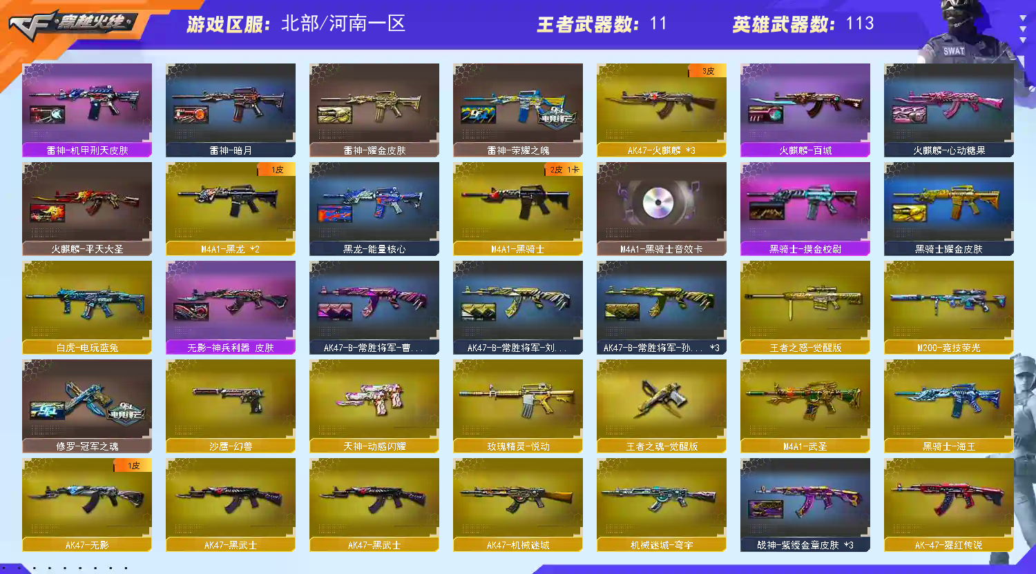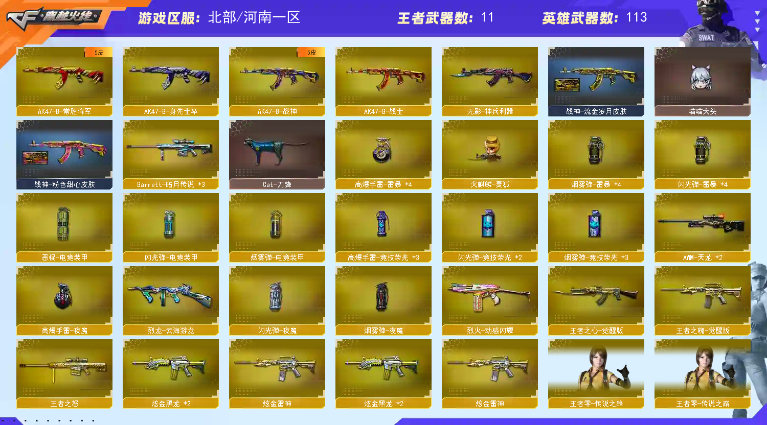 【北部战区】(吉林一区 黑龙江区 辽宁一二三区 合区)(河北一区 山西一区 北京一二三四区 合区)(山东一区 山东二区 河南二区 北方大区 合区)河南一区 VIP等级6 M4A1雷神精英刀锋 火麒麟灵狐 白虎电玩蓝兔 雷神赛博幻想 QBZ金色蔷薇 王者之击觉醒版,王者之啸觉醒版,QBZ吕布,7屠龙 王者零 可排位 【角色】:灵狐者职业经理动作花手满金色四防、葵、王者瞳、黄金海岸、复仇者、幻影、雷霆、坠天使、西部牛仔、妲己、仙子、X角色 【主武器】:王者之魄绿色光效觉醒版、王者之怒金色光效觉醒版、王者之心金色光效觉醒版、雷神耀金暗月带音效卡、黑骑士耀金带音效卡、黑骑士海王、炫金雷神、炫金黑龙、炼狱加特林带蓝粉光效、盘龙、烈龙、斯太尔-蝴蝶、AK系列:火麒麟雷神皮肤绿色光效蓝色光效、黑武士、无影、机械迷城、猩红传说、M4系列:雷神耀金暗月皮肤、黑龙能量核心暗月皮肤、黑骑士耀金皮肤、黑骑士海王、武圣套装、王者玫瑰精灵悦动、CAT-猫枪、狙击系列:天龙、裁决、毁灭、极光、王者之怒 【副武器】王者之魂、COP旗袍、沙鹰幻兽、USP雷暴、修罗蓝色光效、天神、武圣、1911大黄蜂、COP-青龙、胜利之火、MAC10涂鸦【近身武器】屠龙蓝色光效、龙啸红绿光效、麒麟刺红绿光效、擎天蓝色光效、斩神刀雷暴、女皇利刃、巨蝎之尾、手斧-镜、X刀 【投掷武器】幻兽套装、雷暴套装+4、高爆X、cfs雷闪烟、黄金闪、橙烟、蓝烟、红烟、 【道具】烟雾头 闪光镜 钳子 手雷包 防弹衣 防弹头 防化服 生化弹夹 生化钩子 五大生化幽灵 14个背包 冲锋枪弹夹 机枪弹夹 步枪手枪弹夹 生化爆破全装 玩偶 孙悟空、关羽、金猪、金鼠、深渊黑龙 各职业战队名片喷涂 cfs击杀图标 炫彩背包 6烈6盘6屠龙6修罗X步枪X狙 电竞装甲 套装一套绿豆2020MVP大炮皮肤,荣耀之怒,荣耀之魄,荣耀之峰,冠军之魂,CFPL职业选手角色 账号角色有打生化人物不用换弹,可以看幽灵血条。夜魔马夜魔马来剑套装一套,火麒麟百城皮肤,AG皮肤来剑套装一套,火麒麟百城皮肤,AG皮肤,cfpl竞技荣光M200七套,四防新角色电竞教官云悠悠,英雄王者雷霆cop,英雄级单持cfpl柯尔特,cfpl套装;USP-雷暴,电竞教官-云悠悠,RPK-盘龙,