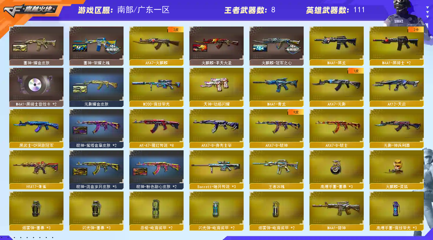 【遇到信用分不足时去请旧版大厅进入普通频道,请勿开科技和功能鼠标,感谢你么么哒】 【步枪系列】M4A1-雷神/黑骑士/黑龙/青龙/猎神/海王/葫芦兄弟/AK47-火麒麟/无影/神兵利器/黑武士网剧套装/火麒麟-灵狐/战士/战神/摸金校尉/能量核心/龙太子/冰龙粉碎者/超新星/天启/朱雀/烈火/金色蔷薇 【狙击枪】M200-竞技荣光/幻神/ AWM-天龙/Barrett-毁灭/极光/暗月传说 【副武器】 沙鹰-天神*2/修罗-沙鹰*3/COP-堕天神/USP-雷暴/柯尔特-竞技荣光/破空枪刃-夜魔/COP-雷霆王者/COP-白鲨/天神网剧套装/天神动感闪耀/MAC-涂鸦/幻能朋克 【近身武器】麒麟刺 / 龙啸/ 屠龙 /擎天/擎天竞技荣光/斩神刀-雷暴/屠龙动感闪耀/手斧镜/迷你深渊冰龙/唐刀 【投掷武器】雷暴套装*3/竞技荣光套装*3/夜魔套装*3/电竞装甲套装*2/迷你生化手雷/生化手雷 【炫金王者】王者之魄觉醒/王者之势觉醒/王者之锋觉醒/王者冰魄/炫金雷神/炫金骑士 【生化挑战】 RPK-盘龙*6/加特林炼狱掌火/汤姆逊-烈龙*6/ 斯太尔蝴蝶 /死亡之眼/暴君乱世-超越Max/集束激光超越MAX/机甲撕裂者III/激光毁灭者III/神圣爆裂者III/圣炎切割者III/六烈六盘 / 六盘六烈/ 6烈6盘 / 6盘6烈 /生化号/爆破号/可排位 【稀有角色】电竞教官-云悠悠【自定义4防】王者魅影【爆破4防】灵狐者-职业经理【生化4防】王者瞳闭月羞花【爆破属性】樱/魅影/乔伊教练/甜心偶像/职业选手【佣兵觉醒 无需换弹7秒/生化觉醒 狂暴化】捕食者之眼/生化背包变更 【通用道具】1-7背包 / 步枪弹匣 / 冲锋枪弹匣 / 机枪弹匣 / 散弹枪弹夹 / 手枪弹夹/ 挑战弹夹 / 金蛇戒 / 魔龙戒 / 圣龙戒 / 银蛇戒 / 锋芒环 / 防弹头盔 / 烟雾保护头盔 / 防弹衣 / C4工具钳 / 手雷包 / 闪光护目镜/超级护目镜/超级背包/透明头盔/透明护目镜/ 超级对讲机 /新彩色昵称/C4.红龙/CFs击杀图标/摇滚西游 【生化专用】永久生化弹夹/防化服/幽灵之刃/减少停顿道具(不退包)/灵魂忍者/绿巨人/变异宝贝/迷雾幽灵/ 迷你生化手雷 / 肩膀佩戴超级对讲机(榴弹3/22) 【皮肤音效玩偶】【幻神蓝粉光效】【火麒麟STAR/冠军之心/平天大圣】【雷神荣耀之魄/星空/耀金】【黑骑士白马银枪】【无影耀金】【天龙STAR】【毁灭荣耀之怒/CFS2018/CFS2020/风暴】【修罗STAR/CFS2018】 【音效卡-黑骑士-毁灭】 玩偶审判者/小兔姬/红色艾比/白泽/三国吾国/红色曼提柯尔15周年 【4大战区】南部战区;USP-雷暴,电竞教官-云悠悠,RPK-盘龙,QBZ03-金色蔷薇,M200-幻神,