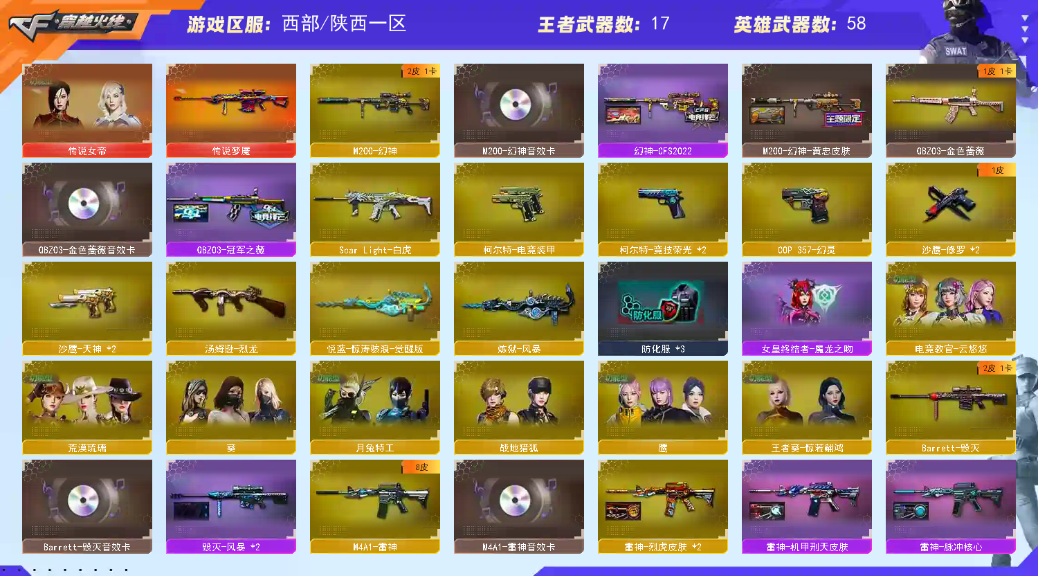 女帝/星神/四防鹰/云悠悠四防/传说梦魇/幻神+2皮+音效/雷神8皮+音效/竞技荣光套还有各种皮肤以及英雄武器;传说女帝,电竞教官-云悠悠,QBZ03-金色蔷薇,M200-幻神,Scar Light-白虎,