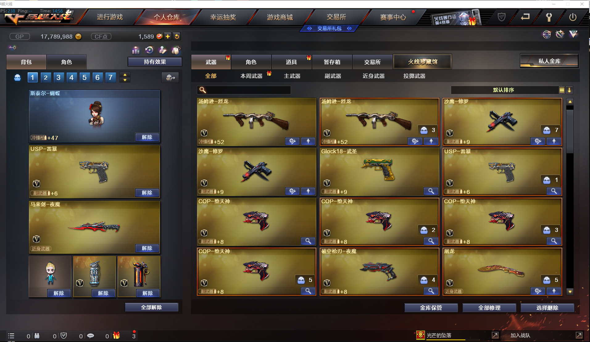 生化性价比✅四防凌霄+6烈龙蝴蝶+炽芒蝶刃+USP雷暴✅堕天神全套+夜魔全套✅4COP✅全弹匣