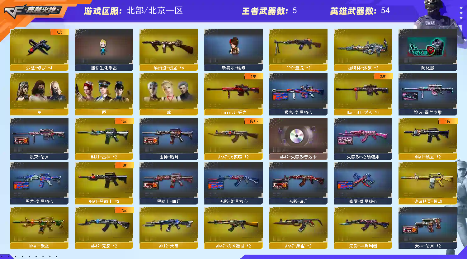巴雷特朱雀|6烈龙斯太尔蝴蝶|2盘2炼狱|56V5王者|火麒麟音效卡|生化爆破全装号 北部战区合区大区(河北一区、辽宁一区、辽宁二区、辽宁三区、山东一区、山东二区、河南一区、河南二区、北京一区、北京二区、黑龙江一区、北方大区、北京三区、北京四区、吉林一区、山西一区)登录的时候选择北京一区。 【编 号】:BJ86 【角 色】:CFVIP6、元首等级、葵、瞳、樱、风暴女(捕食者之眼/佣兵觉醒)、新娜塔莎、影舞者X、堕落天使、兰、深海之兰、夜玫瑰、威锋、烟雾保护头盔、闪光护目镜、双龙戒指 【主 武】:Barrett朱雀、烈龙X6、斯太尔蝴蝶、王者之魄、王者之势、王者之怒、炫金毁灭、火麒麟(音效卡、CFSTAR)、黑龙X2(暗月、能量核心)、雷神X2(暗月)、黑骑士X3(暗月)、无影X2(暗月)、死神(秘银)、天启(暗月)、超新星、武圣、机械迷城X2、黑鲨X2、天龙X2(能量核心)、毁灭X2(暗月)、极光(能量核心)、金色蔷薇、盘龙X2、加特林炼狱X2 【副 武】:天神X2(暗月)、修罗X4、COP旗袍、1911大黄蜂、COP小白龙、胜利之火、凤凰之火 【近 身】:王者之锋(觉醒)、麒麟刺堕天神、麒麟刺、擎天X2、龙啸X2、屠龙X2、无畏之矛、黄金充气大锤、金条、清刚、影之刃 【投 掷】:堕天神手雷套装X1、迷你生化手雷、深渊终结者手雷、凤凰之息、胜利之光、凤舞云烟 【道 具】:火麒麟音效卡、深渊红龙玩偶X4、孙悟空玩偶、铁骑玩偶、王胖子玩偶、7个背包、AC(防弹头盔-防弹衣)、C4工具钳、手雷包、挑战弹夹、冲锋枪弹夹、机枪弹夹、手枪弹夹、步枪弹夹、狙击枪弹夹、散弹枪弹夹;RPK-盘龙,