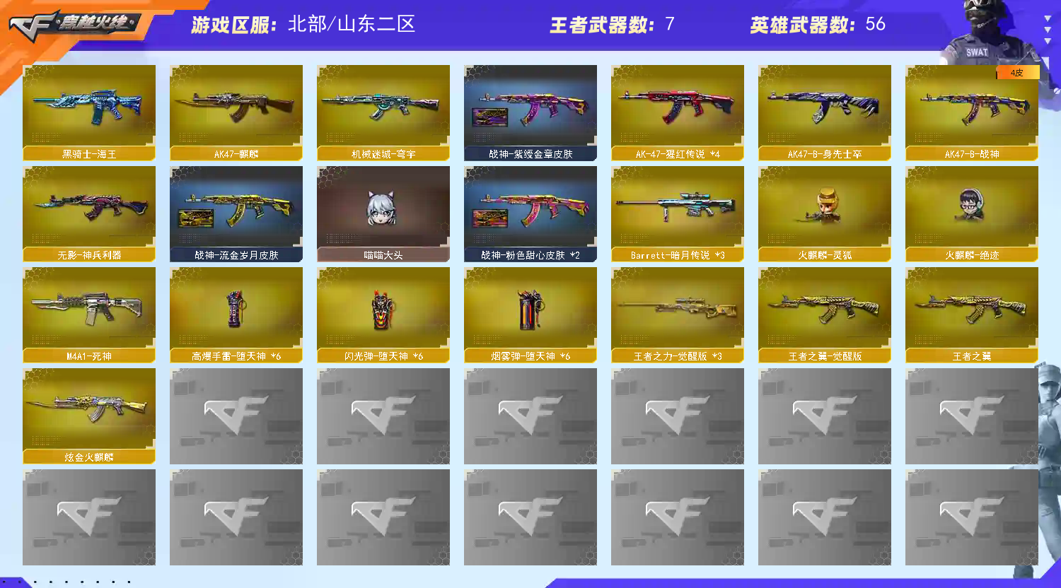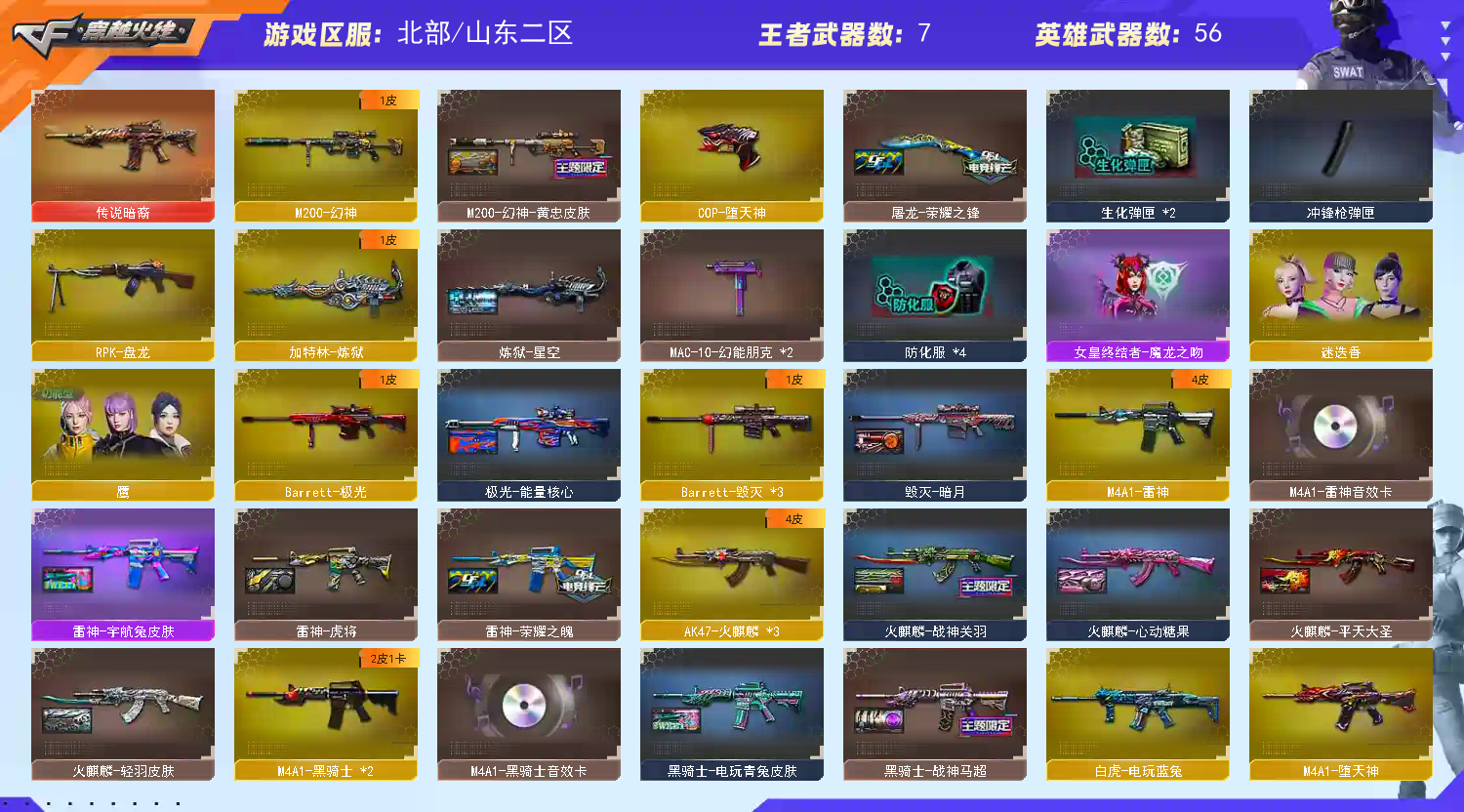 幻神+皮肤 传说暗裔 堕天神套装 火麒麟 黑骑士 白虎-电玩蓝兔 毁灭超多皮肤 修罗+皮肤 屠龙+皮肤 烈火 武圣 玄武 雷神小人枪-精英刀锋 迷迭香 鹰 零 王者之翼 王者之力 王者之击 王者之刺 雷神+皮肤+音效卡 防弹头盔+防弹衣+C4钳子+手雷包 步枪弹夹 死神 极光 如果游戏异常 可申请售后 会及时处理。 如果感觉账号可以 请点击收藏 防止迷路!!!;RPK-盘龙,M200-幻神,传说暗裔,
