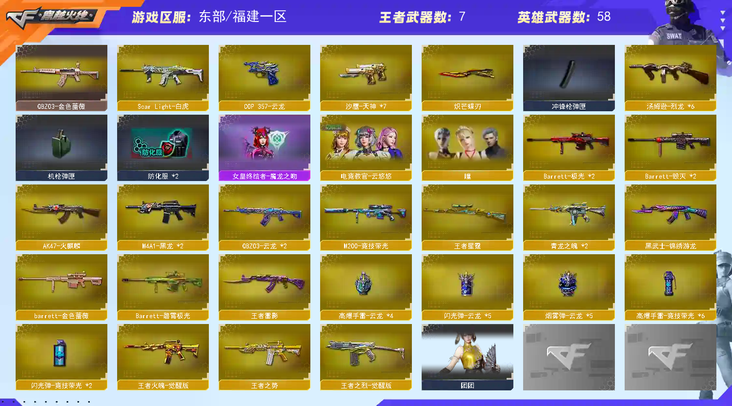 首页 > 租号大厅 > 穿越火线 > 电信区/福建一区 > 生化爆破双t0❤️m200竞技荣光❤️98k王者星霆❤️6烈龙炼狱+炽芒蝶刃❤️王者雷影
