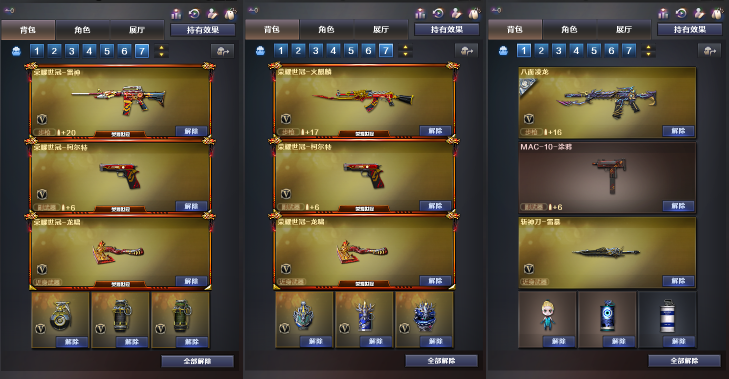 八面凌龙、白虎宙斯套、蝴蝶毒蜂双面神6烈4盘2炼不退包、生化背包无需装弹、荣耀世冠套云龙套雨墨金蚀