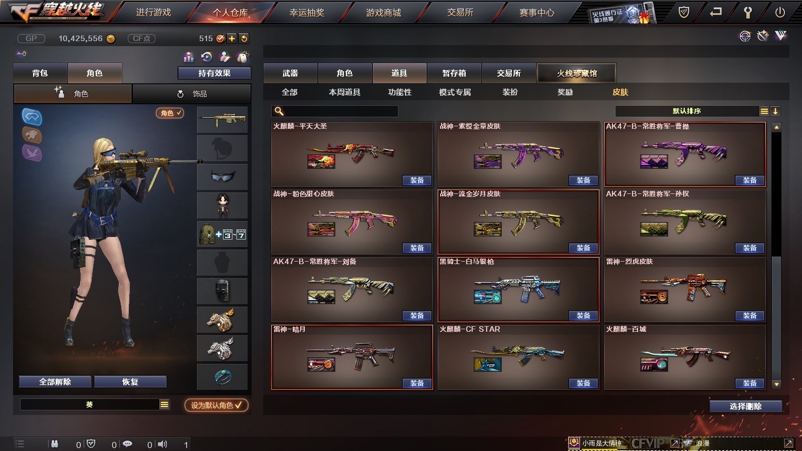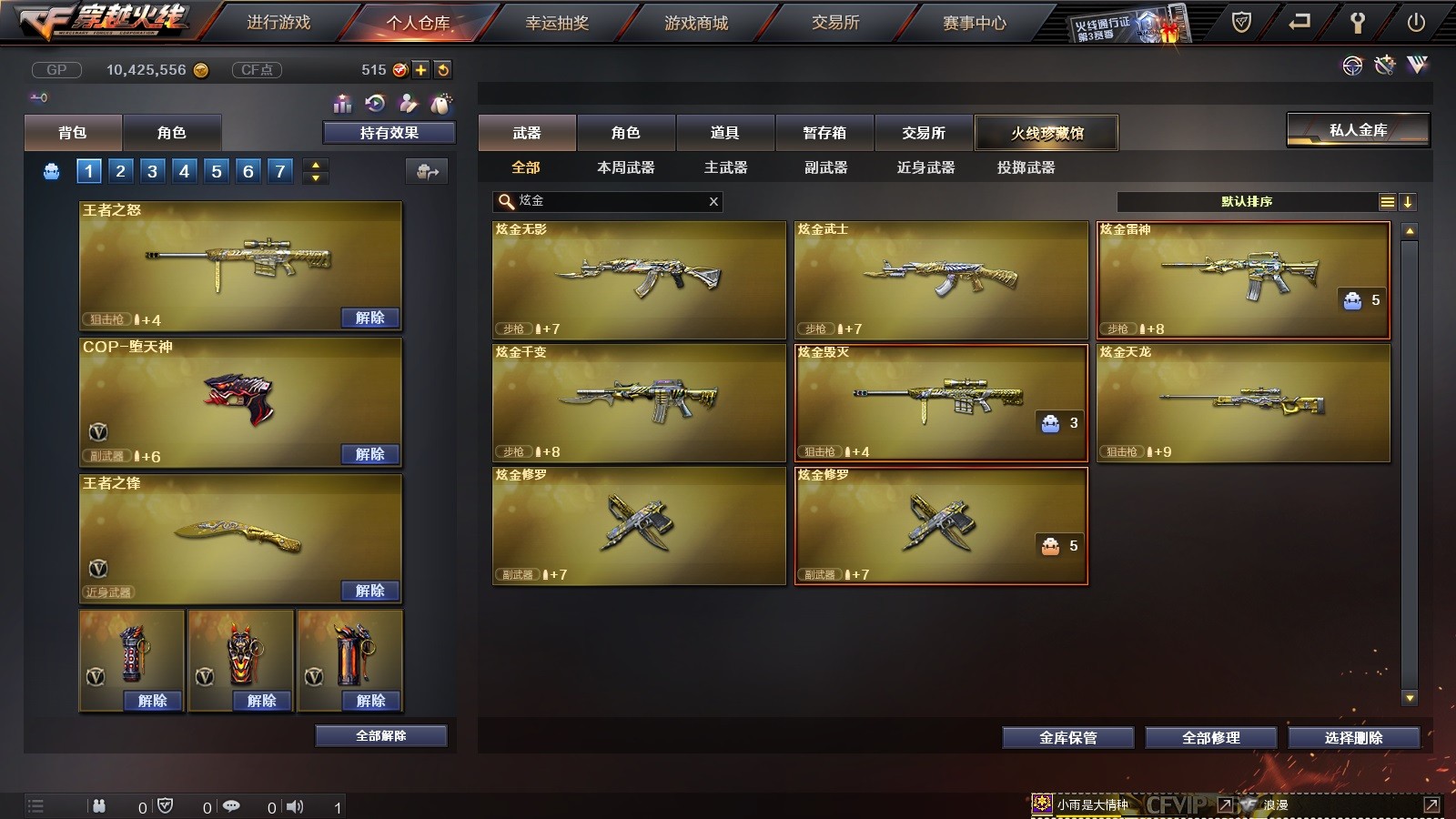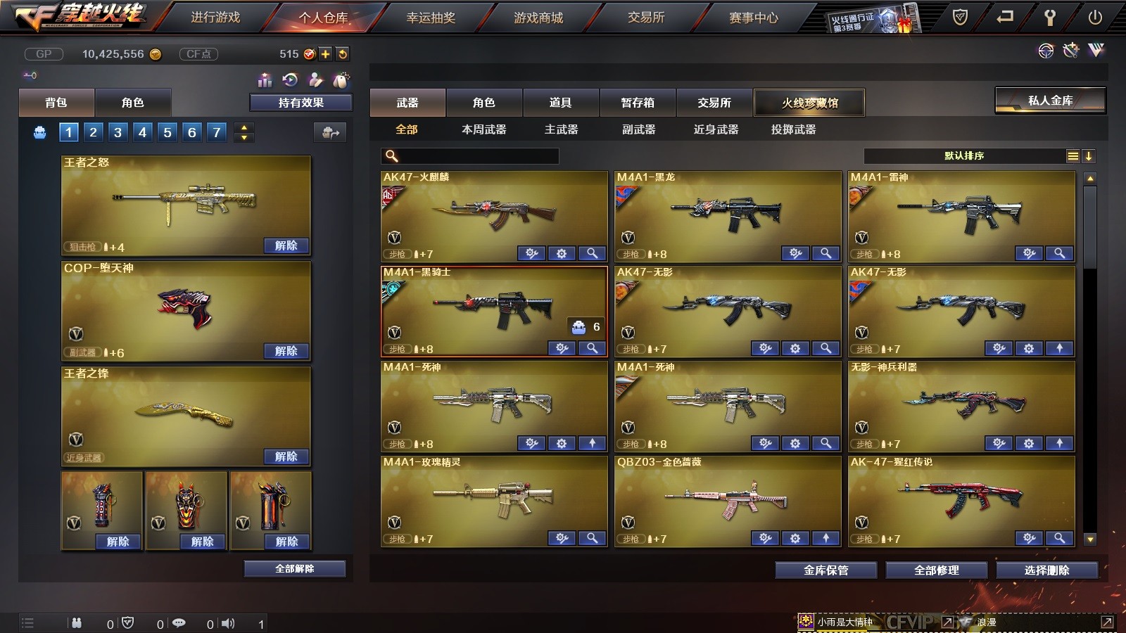 78V 王者之怒,王者之锋,QBZ03-金色蔷薇,柯尔特-竞技荣光,火麒麟-灵狐,王者之幻,炫金雷神,炫金千变,炫金无影,炫金武士,炫金毁灭,炫金天龙,炼狱-悦蓝,王者之魂,炫金修罗,葵,详情看图 VIP6爆破生化全装号 4王者 8炫金 4屠龙 3烈1盘王者之怒 炫金毁灭天龙 极光朱雀 王者之锋,王者之幻 葵,炫金雷神,炫金千变,炫金无影, 炼狱悦蓝 qbz金色蔷薇 火麒麟(AG战队)雷神(烈虎)黑骑士(白马银枪)死神(秘银)无影(能量核心)等等;RPK-盘龙,QBZ03-金色蔷薇,