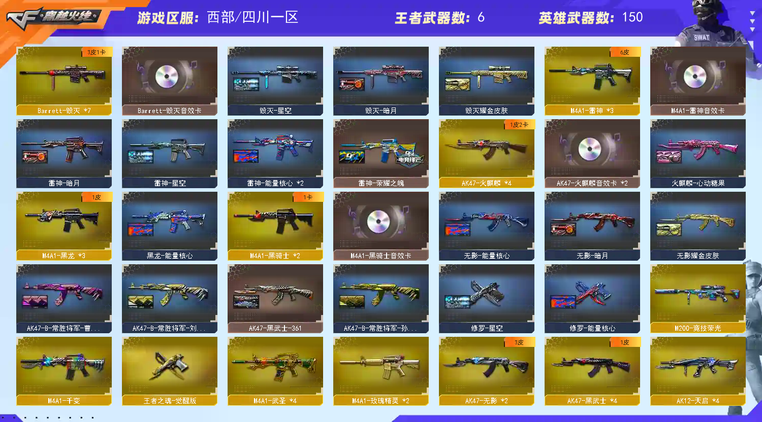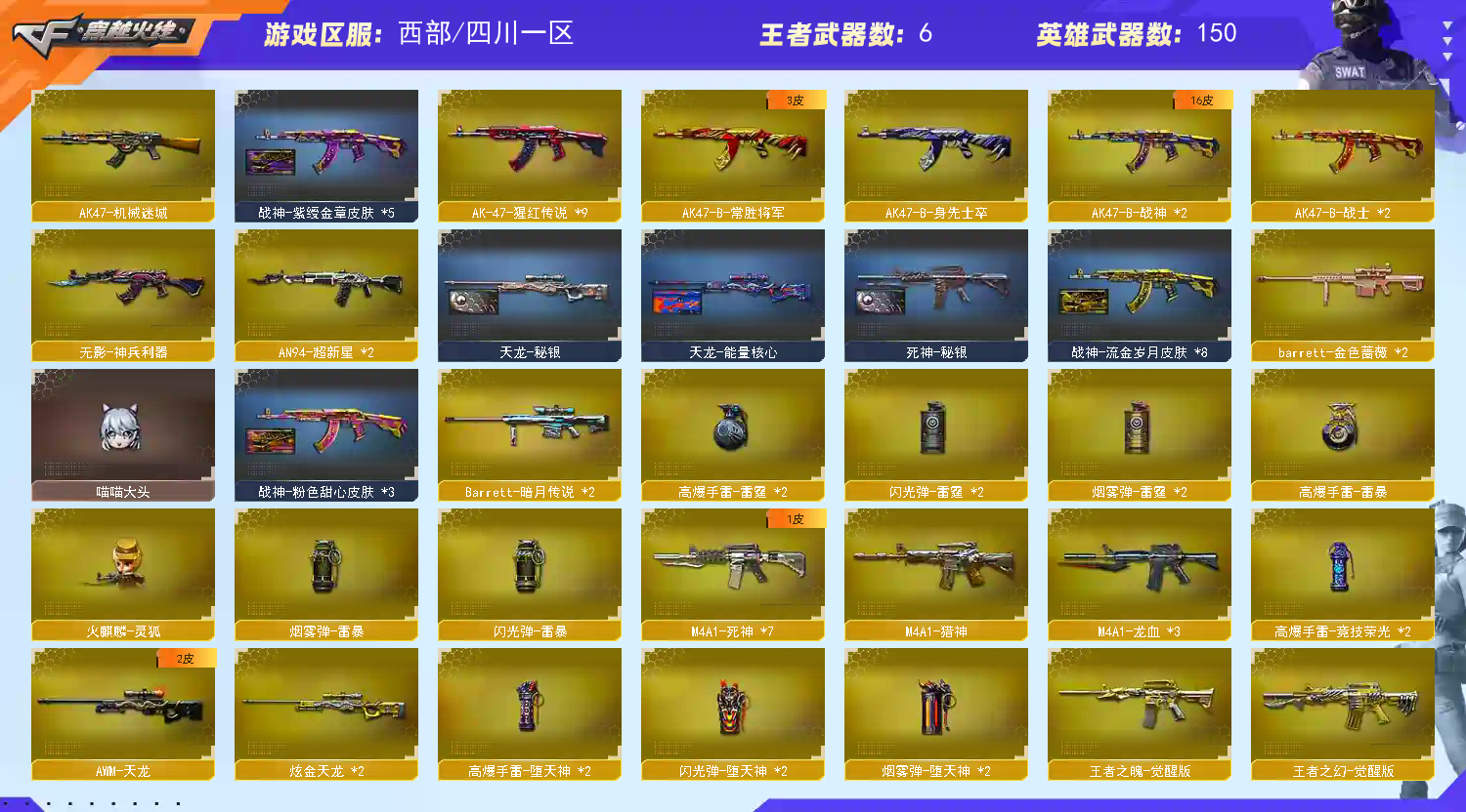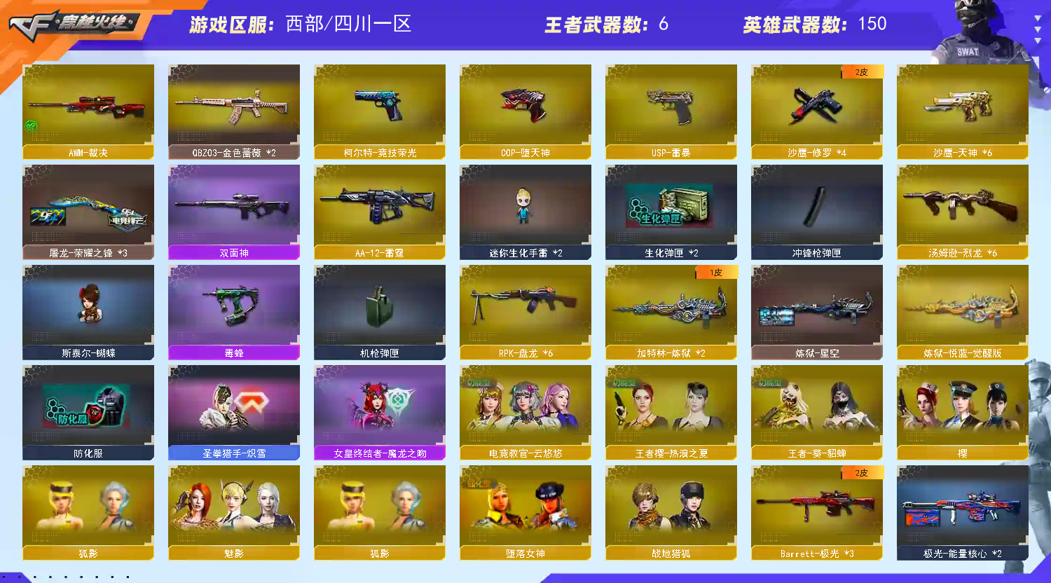 【遇到信用分不足时请去旧版大厅进入普通频道,感谢】 【步枪系列】M4A1-雷神*3/千变/黑龙*3/黑骑士*2/死神*8/武圣*4/龙血*3/玫瑰精灵*2/猎神/精英刀锋/AK47-火麒麟*3/无影*2/黑武士*4/机械迷城/猩红传说/战士/战神/桃园结义/火麒麟-灵狐/AN94-超新星*2/QBZ03-金色蔷薇*2/9A91-烈火/激光毁灭者/ 【狙击枪】M200-竞技荣光幻神 /AWM-天龙/裁决/Barrett-毁灭*7/极光*3/暗月传说/金色蔷薇*2 【辅助枪】 RPK-盘龙 *6/ 加特林炼狱*2/悦蓝/汤姆逊-烈龙*6/AA12-雷霆/激光毁灭者III/巨龙咆哮III/乱世/征服者/迷你生化手雷*2/死亡之眼/ 斯太尔蝴蝶 / 六烈六盘 / 六盘六烈 / 6烈6盘 / 6盘6烈 /生化号 / 爆破号/ 【炫金王者】王者之魄觉醒/王者之幻觉醒/王者之魂觉醒/王者之锋/王者之击觉醒/炫金千变/雷神/黑龙/天龙/机械青龙/赤魂 【角色】电竞教官-云悠悠【自定义4防】王者葵-貂蝉/樱/空/魅影/狐影/灵狐者-黄金海岸/樱-缤纷夏日/零-水下丽影/王者樱-热浪之夏(跳舞)/铁骑荣耀/北极狐x/青霞仙子/雪莉杨/夜玫瑰x【佣兵觉醒:生化无需换弹/捕食者之眼】 【副武器】 柯尔特-竞技荣光/USP-雷暴/沙鹰-天神 /沙鹰-修罗/COP-堕天神/摸金校尉/COP-旗袍/MAC-涂鸦 【近身武器】擎天-竞技荣光/麒麟刺 / 龙啸 / 屠龙 /擎天/尼泊尔雷霆/斩神刀雷暴/麒麟刺-堕天神/龙啸-堕天神/手斧-镜 【投掷武器】竞技荣光套装/雷霆套装*2/雷暴套装/堕天神套装*2/迷你生化手雷*2 【通用道具】双1-7背包 / 手枪弹匣 / 金蛇戒 / 狙击枪弹夹 / 魔龙戒 / 散弹枪弹夹 / 圣龙戒 / 挑战弹夹 / 银蛇戒 / 防弹头盔 / 烟雾保护头盔 / 防弹衣 / C4工具钳 / 手雷包 / 步枪弹匣 / 冲锋枪弹匣 / 机枪弹匣 / 闪光护目镜/超级护目镜/超级背包/透明头盔/透明护目镜/新彩色昵称/C4.红龙-翡翠-枪王排位/KZ-战队击杀图标/夏日击杀图标/Estar-击杀图标/R.LGD击杀图标/金色击杀图标 【生化专用道具】永久生化弹夹/防化服/幽灵之刃/减少停顿道具(不退包)/灵魂忍者/绿巨人/变异宝贝/ 伪装幽灵永久/迷你生化手雷 / 肩膀佩戴超级对讲机(榴弹3/22) 【皮肤玩偶音效】【火麒麟AG战队皮肤/雷神*3/CFS2018/CF-STAR*2】【黑龙能量核心】【雷神星空/能量核心*2/暗月/荣耀之魄】【无影耀金/暗月/能量核心】【死神秘银】【黑武士361】【天龙STAR/秘银/能量核心】【毁灭星空/耀金/暗月】【极光能量核心*2】【炼狱星空】【修罗CF2018*4/星空/能量核心】【屠龙荣耀之锋*3】 葫芦兄弟/王胖子/小红玩偶/暴躁猪猪玩偶/白狼玩偶/剑齿虎玩偶*2/审判者玩偶/黄金幸运猪猪玩偶/幸运鼠玩偶/金色幸运鼠玩偶/深渊红龙玩偶/铁骑玩偶*2/王者刀锋玩偶/关羽玩偶/猫头鹰玩偶/【音效卡-毁灭/黑骑士/火麒麟*2/雷神】 【4大战区】西部战区;USP-雷暴,电竞教官-云悠悠,RPK-盘龙,QBZ03-金色蔷薇,