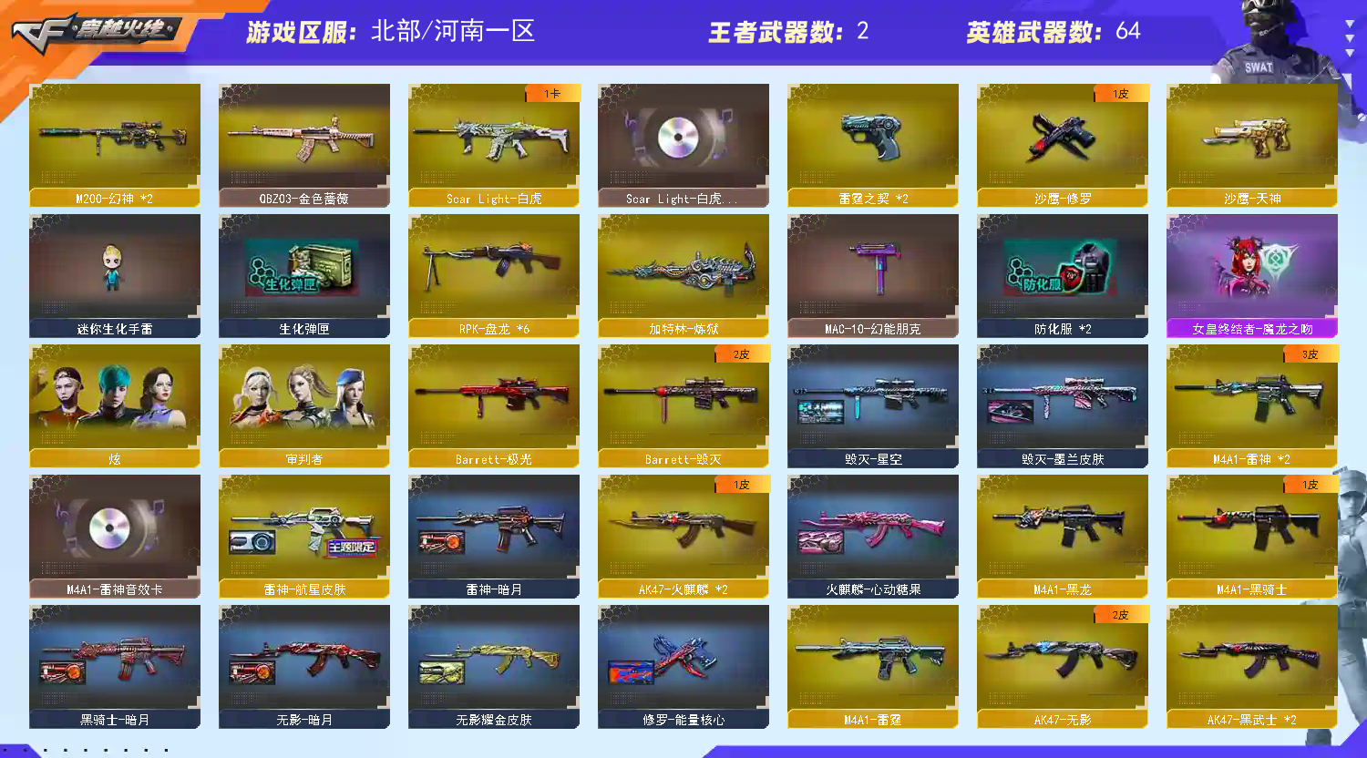 61V爆破生化双全装 四星上将 主武器:王者之武、王者之影、炫金毁灭、炫金火麒麟、2火麒麟(CFSTAR皮肤)、2雷神(暗月皮肤)、黑骑士(暗月皮肤)、无影(暗月皮肤)、死神、2黑武士、天启、超新星、机械迷城、雷霆M4、朱雀HK、QBZ03金色蔷薇、AK47猩红传说(老兵传说皮肤)、毁灭(星空皮肤)、极光、雷霆大炮、M200幻神、4盘龙、炼狱、火麒麟桃园结义等 角色:审判者、炫、救世主X、潘多拉X、新猎狐者、陈龙野Y、堕天使、复仇者、幻影、❤境防卫者、海军陆战队、精英部队、救世主、王力宏、深海之兰等 副武器:炫金天神、炫金修罗、修罗(能量核心皮肤)、天神、2雷霆COP、凤凰之灵、暗杀者绿豆等 近身:2屠龙、龙啸、擎天、2麒麟刺、尼泊尔雷霆、破天斩魔剑、斩神刀、圣诞彩砖、鹰爪、青花扇、棒球棒等 投掷:7高爆*雷霆、7*雷霆、7*雷霆、2凤凰之息、惨叫鸡高爆*、迅捷虫*、高爆*雷蛇等 道具:烟雾头、闪光镜、炫彩背包、超❤背包、34567背包❤、防化服、灵魂忍者、变异宝贝、防弹衣、防弹头、*工具钳、*包等;RPK-盘龙,QBZ03-金色蔷薇,M200-幻神,Scar Light-白虎,