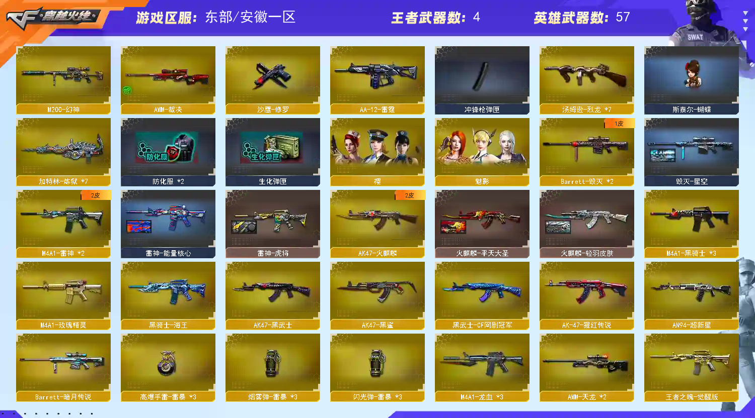 M200幻神|6烈龙斯泰尔蝴蝶|7加特林炼狱|70V|觉醒王者之魄之势|炫金雷神|轻羽虎将星空等皮肤|生化爆破全装号 东部战区合区大区(安徽一区、福建一区、上海一区、上海二区、浙江一区、浙江二区、江苏一区、江苏二区、教育大区、移动专区)登录的时候选择上安徽一区。 AH124 【角 色】:CFVIP4、元首等级、樱、魅影、空、零水下丽影、青霞仙子(生化/佣兵觉醒)、潘多拉X、新猎狐者、影武者X、雷霆、复仇者、幻影、娜塔莎、精英部队、瞳蓝魂、雷豹、王力宏、救世复仇、救世主、邓紫棋、兰、夜玫瑰、烟雾保护头盔,闪光护目镜、超级对讲机、超级背包、炫彩背包、8周年戒指 【主 武】;M200幻神、烈龙X7、斯泰尔蝴蝶、加特林炼狱X7、王者之幻、王者之魄(觉醒)、王者之势(觉醒)、炫金雷神、火麒麟(CFSTAR、轻羽、平天大圣)、雷神X2(虎将、能量核心)、黑骑士X3、黑武士、超新星、黑鲨、龙血X3、玫瑰精灵、烈火、AK47猩红传说、黑武士CF网剧冠军武器套装、黑骑士海王X2、天龙X2(CFSTAR)、毁灭X2(星空)、裁决、AA12雷霆、地狱征服者超越Max、极光毁灭者3、KAC圣炎切割者3、巨龙咆哮3、神圣爆裂者3 【副 武】:天神CF网剧冠军武器套装、修罗(CFSTAR)、胜利之火 【近 身】:王者之啸(觉醒)、擎天CF网剧冠军武器套装、斩神刀雷暴、屠龙、擎天、龙啸X3、断离、干将莫邪、金砖、伪装、无畏之矛、清刚、影之刃 【投 掷】:雷暴手雷套装X3、迷你生化手雷、音乐手雷、凤舞云烟、凤凰之息 【道 具】:金色幸运鼠玩偶、7个背包、AC(防弹头盔-防弹衣)、C4工具钳、手雷包、夺命之镰、变异宝贝、灵魂忍者、妖姬、绿色巨人、疯狂宝贝、生化弹夹、防化服、步枪弹夹、冲锋枪弹夹、狙击枪弹夹、手枪弹夹;M200-幻神,