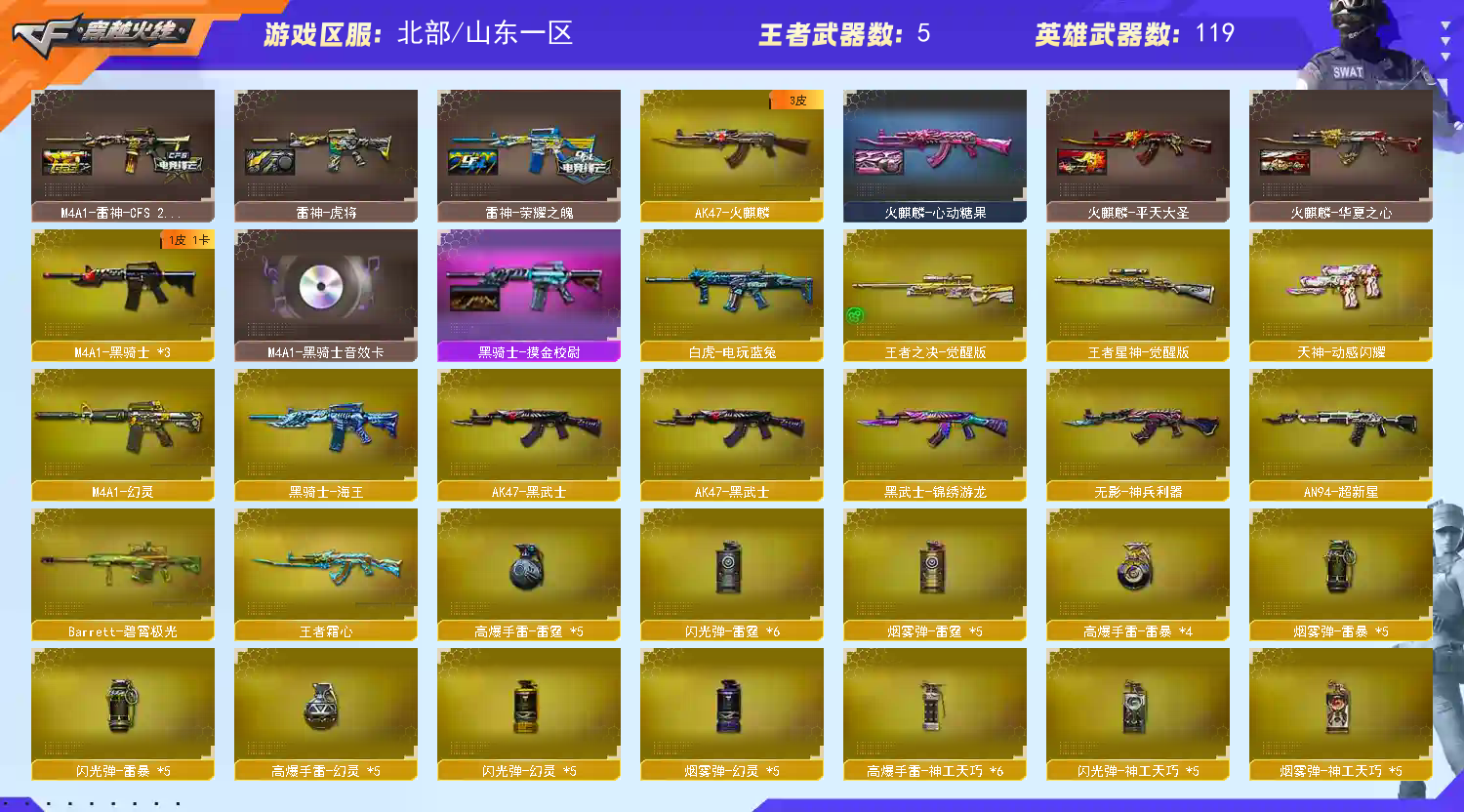 【此号价值数十万,如有开G开辅助封号的,想想自己是否能够承担的起,后果自负,由平台提供,身份信息,证据和地址进行报警处理】 步枪:G36C幻影 火麒麟 雷神 黑骑士 超新星 白虎 幻灵 烈火动感闪耀 金色蔷薇 王者霜心 白虎电玩蓝兔 狙击:传说灵眸 VSK94金蚀 毁灭 极光 幻神 星神 王者之决 王者星神 机枪:2加特林炼狱 炼狱秦师 冲锋:6烈龙 斯太尔蝴蝶 异变清道夫 副武:COP雷霆 USP雷暴 COP幻灵 USP神工天巧 COP雲龙 柯尔特冠军之特 近身:炽芒蝶刃 屠龙 龙啸 麒麟刺 尼泊尔雷霆 斩神刀雷暴 幻灵之锋 唐刀神工天巧 屠龙动感闪耀 投掷:5雷霆 4雷暴 5幻灵 5神工天巧 角色:传说艾莉莎 隼 关小雨 荒漠琉璃 王者凌霄 王者潘多拉 鹰 影豹 雨墨 音效:幻神音效卡 星神音效卡 毁灭音效卡 金色蔷薇音效卡 白虎音效卡 黑骑士音效卡 皮肤:幻神宠儿 幻神N9 幻神世冠白鲨 幻神电流骇客 幻神动感闪耀 幻神纸灯龙 幻神黄忠 星神AG 星神冠军之星 星神破竹 星神璀璨 白虎虎牙 白虎虎啸 白虎大汉风骨 QBZ冠军之薇 QBZ白鲨 QBZ纸灯龙 炼狱虎牙 炼狱钟馗 毁灭AG 雷神传奇N9 雷神宠儿 裁决百城联赛 麒麟刺白鲨 毁灭2018 雷神2019 雷神动感闪耀 雷神荣耀之魄 屠龙荣耀之锋;USP-雷暴,柯尔特-冠军之特,炽芒蝶刃,隼,传说艾莉莎,QBZ03-金色蔷薇,G36C-幻影,