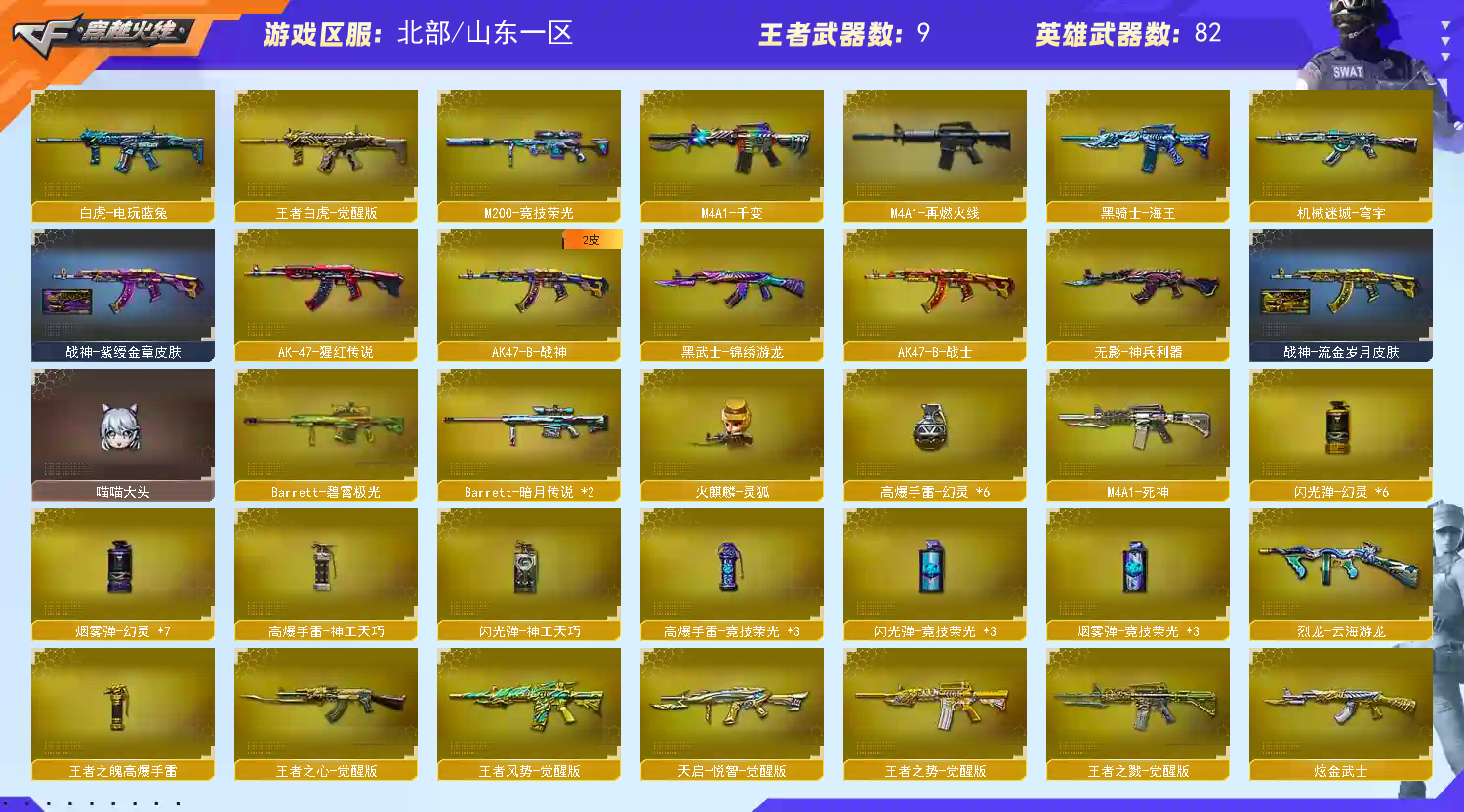 北部可排|王者白虎|角色影豹|毁灭音效卡青帝星空皮肤|觉醒王者之势之戮|炫金无影|爆破全装号 北部战区合区大区(河北一区、辽宁一区、辽宁二区、辽宁三区、山东一区、山东二区、河南一区、河南二区、北京一区、北京二区、黑龙江一区、北方大区、北京三区、北京四区、吉林一区、山西一区)登录的时候选择山东一区 【编 号】:SD200 【角 色】:VIP等级5、元首等级、影豹、樱、王者零传说之路、、甜心偶像、新娜塔莎、影舞者X、堕落天使、兰、深海之兰、夜玫瑰、威锋、烟雾保护头盔、闪光护目镜、双龙戒指 【主 武】:王者白虎、王者之心、王者之戮(觉醒)、王者之势(觉醒)、炫金无影、炫金武士、雷神、黑骑士、死神、黑武士、QBZ03金色蔷薇、AK47-猩红传说X7(老兵传说皮肤)、AK47-B-战士、AK47-B-战神(粉色甜心皮肤、流金岁月皮肤、紫媛金章皮肤)、黑骑士海王、天龙、毁灭(音效卡、星空、青帝、黑大圣) 、暗月传说、盘龙、加特林炼狱X3、火麒麟灵狐、火狱乱世超越Max、致命乱世超越MAx、AK47冰龙粉碎者、机甲撕裂者、极光毁灭者、神圣爆裂者 【副 武】:COP幻灵、1911大黄蜂、COP小白龙、胜利之火、凤凰之火 【近 身】:幻灵之锋、麒麟刺X2、擎天、屠龙、无畏之矛、黄金充气大锤、金条、清刚、影之刃 【投 掷】:幻灵手雷套装X6、王者之魄高爆手雷、深渊终结者手雷、凤凰之息、胜利之光、凤舞云烟 【道 具】:毁灭音效卡、深渊红龙玩偶、王者刀锋玩偶、7个背包、AC(防弹头盔-防弹衣)、C4工具钳、手雷包、挑战弹夹、冲锋枪弹夹、机枪弹夹、手枪弹夹、步枪弹夹、狙击枪弹夹、散弹枪弹夹;炽芒蝶刃,电竞教官-云悠悠,RPK-盘龙,QBZ03-金色蔷薇,Kar98K-星神,