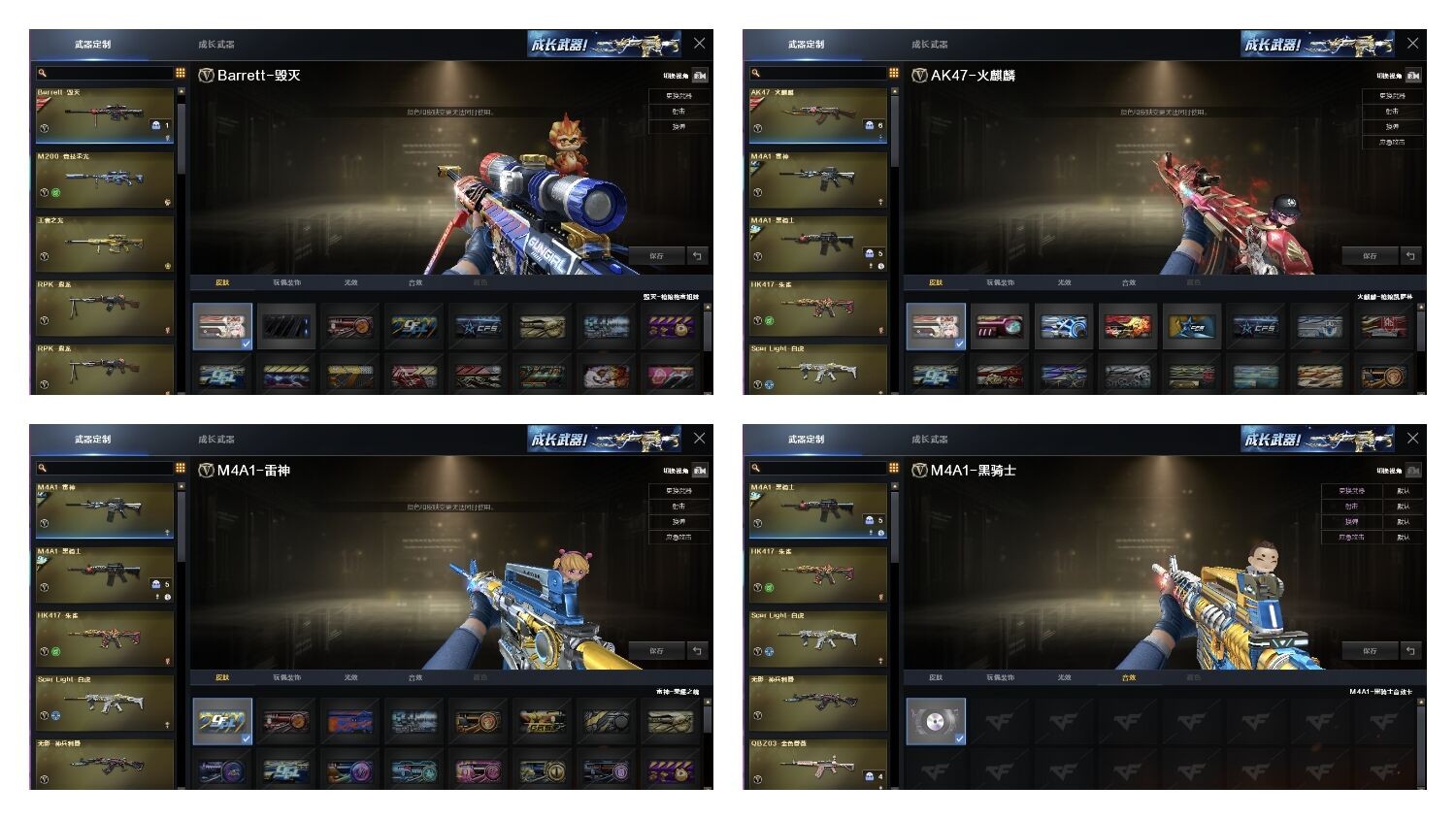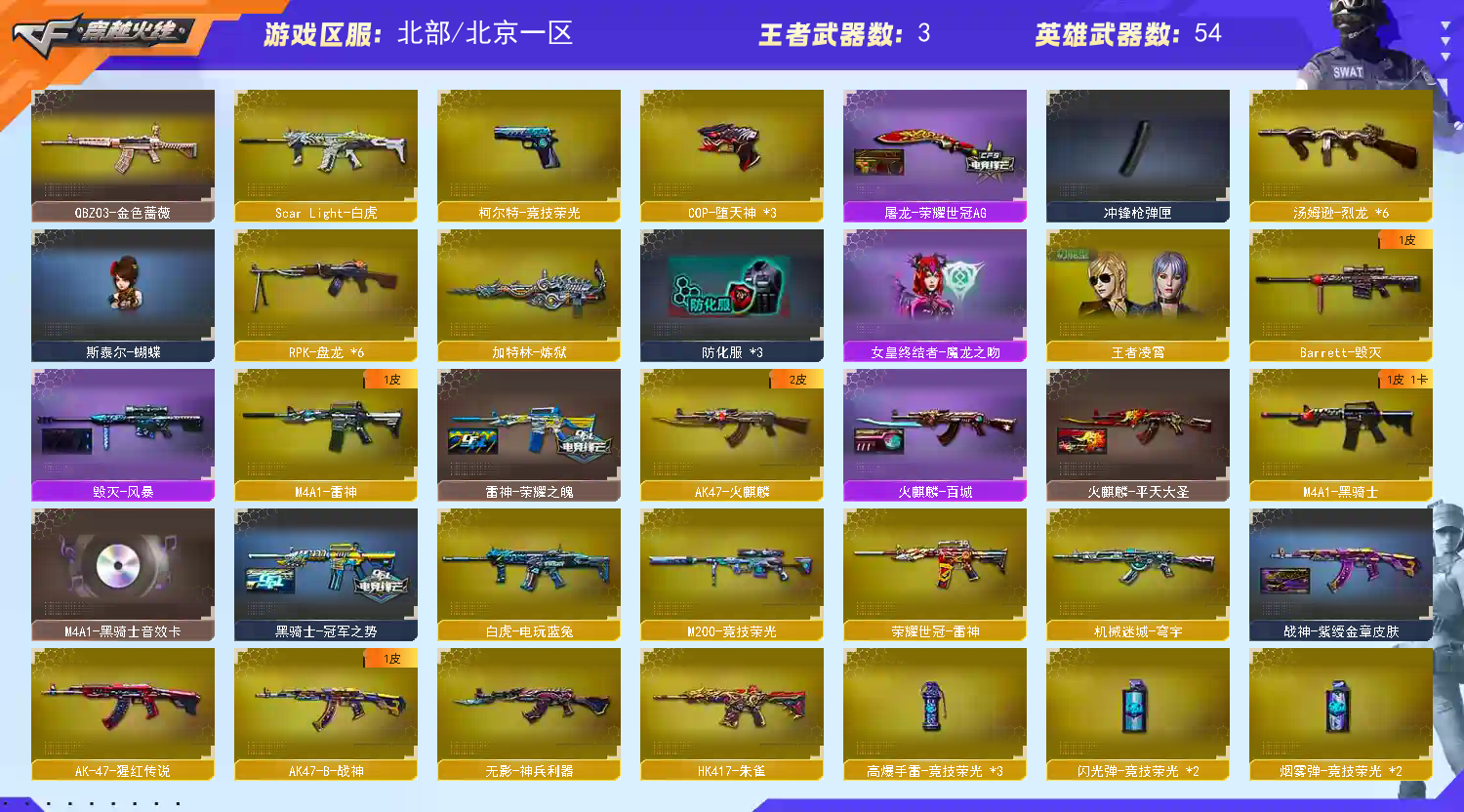 53V荣光幻神,白虎,世冠雷神,荣光柯尔+特堕天神COP*3丨荣耀魄,冠军黑骑士音效,炼狱6盘蝴蝶6烈,王者凌霄樱*青春偶像;RPK-盘龙,QBZ03-金色蔷薇,Scar Light-白虎,