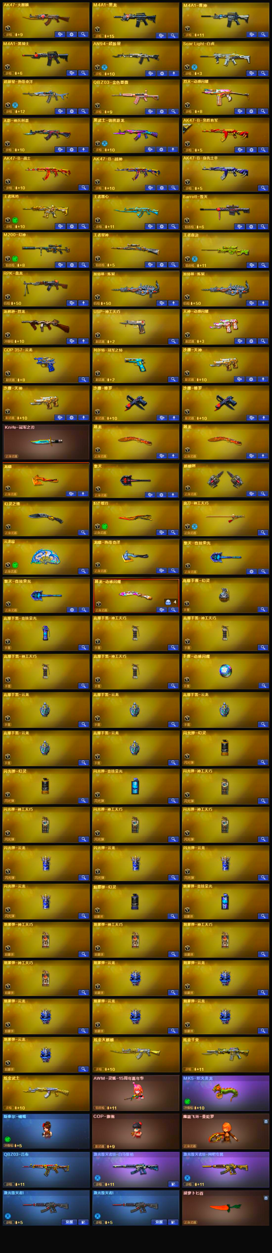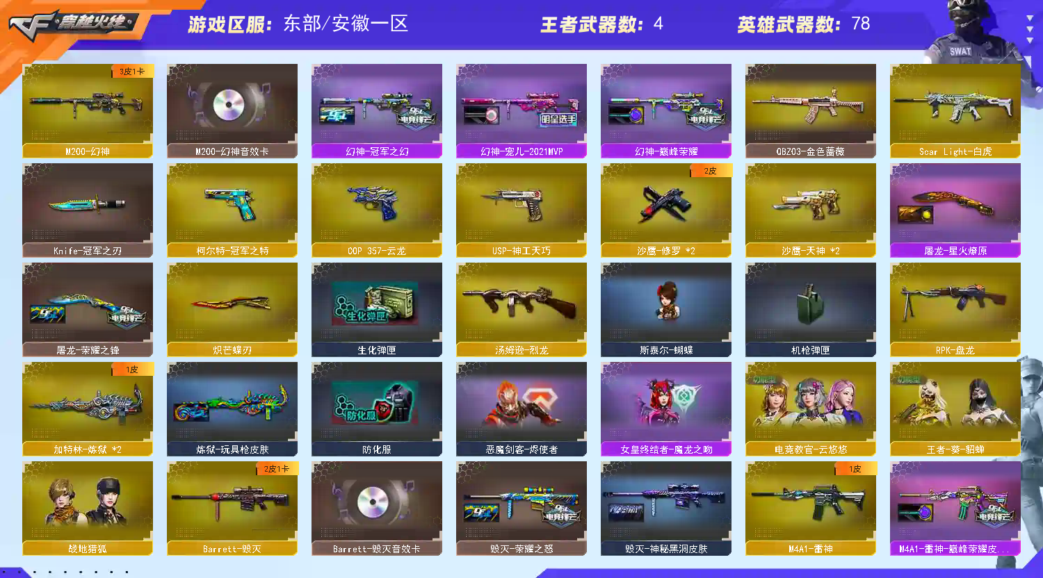 可排位/M200-幻神+音效卡+宠儿3皮/冠军之特+冠军之刃+炽芒蝶刃+云悠悠白虎QBZ蔷薇爆破生化;柯尔特-冠军之特,炽芒蝶刃,Knife-冠军之刃,电竞教官-云悠悠,RPK-盘龙,QBZ03-金色蔷薇,M200-幻神,