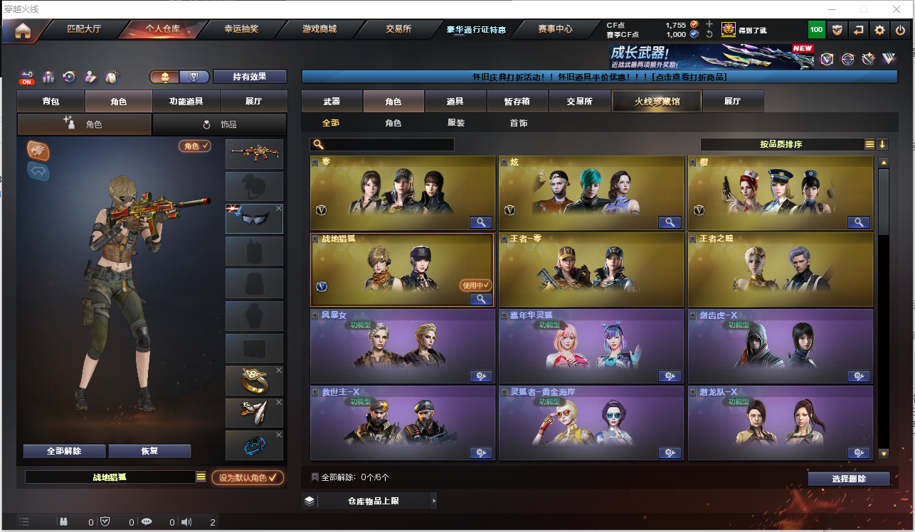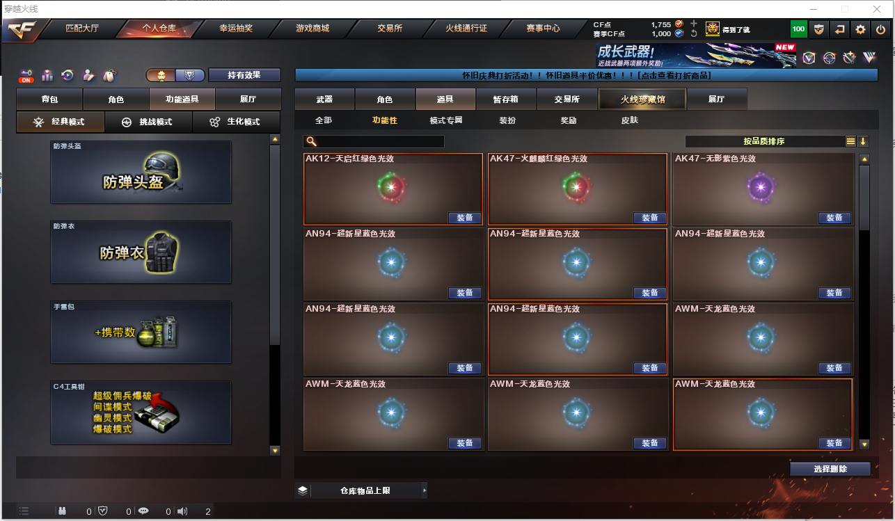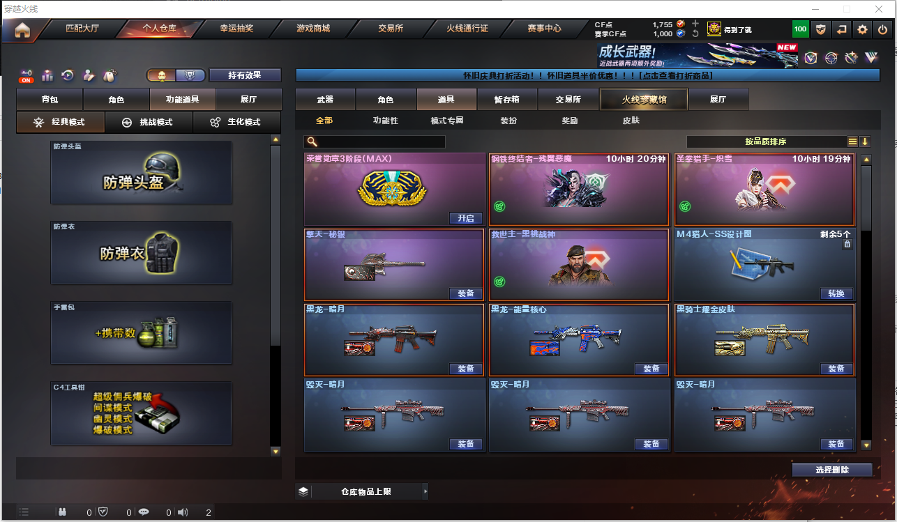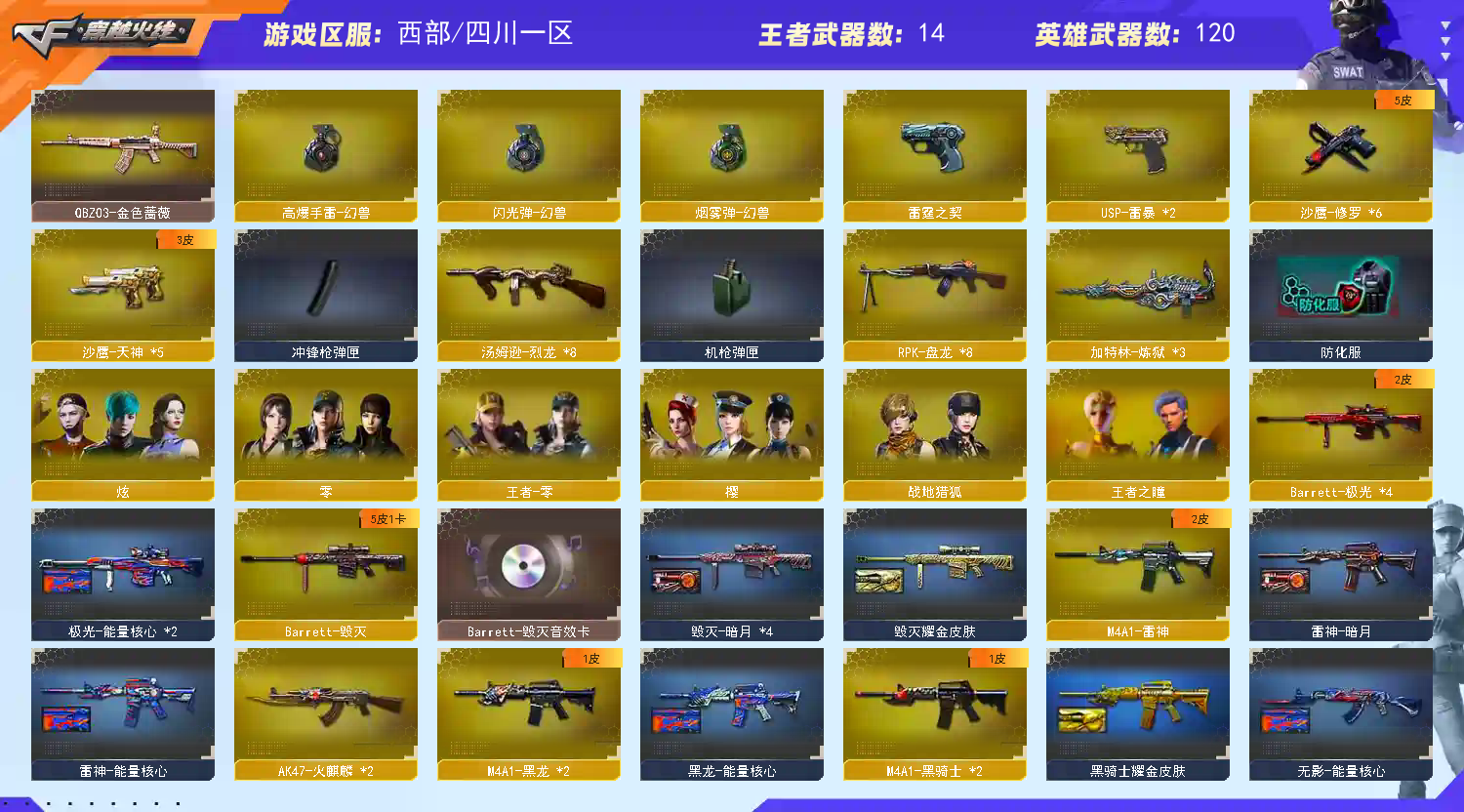 150V雷神白鲨皮肤/毁灭音效卡/毁灭耀金/天龙传奇皮肤/耀金皮肤/CFS皮肤/各种玩偶/各种光效/7雷霆套/6盘龙/6烈龙/炼狱/王者之魄/王者之幻/炫金火麒麟/王者之心/王者之影/炫金雷神/炫金骑士/王者之武/王者之怒/炫金毁灭/王者之啸/王者之锋/神圣爆裂者:9A91-烈火,AK-47-猩红传说,AK12-天启,AK47-黑武士,AK47-火麒麟,AK47-无影,AN94-超新星,AWM-天龙,Barrett-暗月传说,Barrett-毁灭,Barrett-极光,Glock18-武圣,M4A1-黑龙,M4A1-黑骑士,M4A1-雷神,M4A1-雷霆,M4A1-玫瑰精灵,M4A1-千变,M4A1-死神,M4A1-武圣,QBZ03-金色蔷薇,RPK-盘龙,USP-雷暴,barrett-金色蔷薇,黑武士-暗月,黑武士-能量核心,火麒麟-灵狐,加特林-炼狱,雷霆之锋,雷霆之怒,雷霆之契,炼狱-悦蓝,龙啸,龙啸-堕天神,女皇利刃-幻兽,擎天,沙鹰-幻兽,沙鹰-天神,沙鹰-修罗,汤姆逊-烈龙,天启-悦智,屠龙,源·毁灭,斩神刀-雷暴,麒麟刺,麒麟刺-堕天神......;USP-雷暴,RPK-盘龙,QBZ03-金色蔷薇,