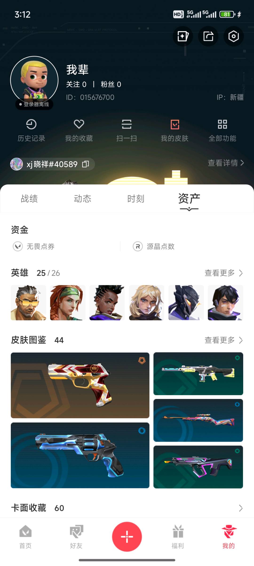 44皮/23冠军/爆爆正义/低分可排/vct标配EDG/离火扇;西部未来 奥丁,奇点 战神,离火刃,偃月苍龙 判官,归零者 獠犬,洪荒怒焰 狂徒,侦察力量 幻影,