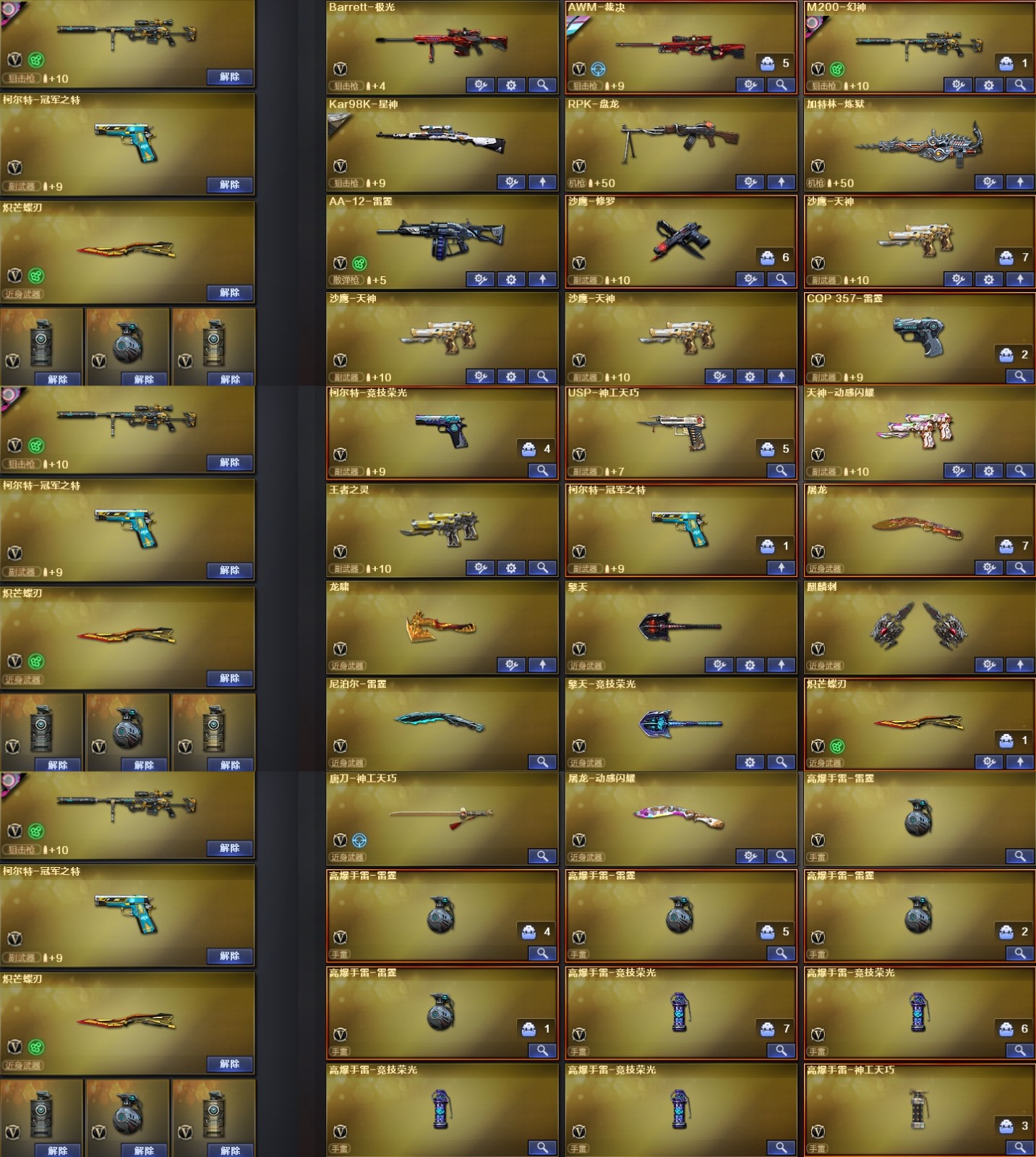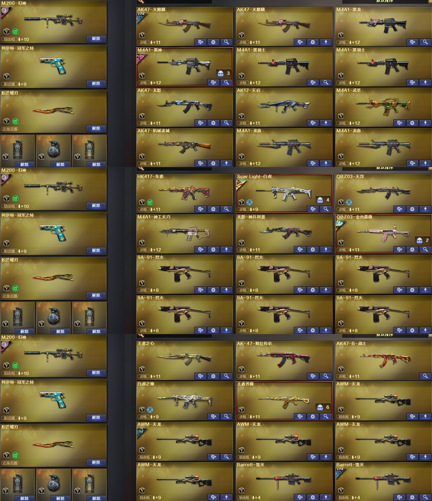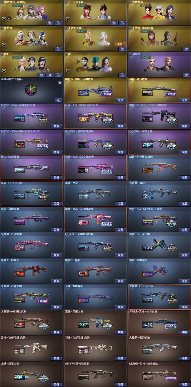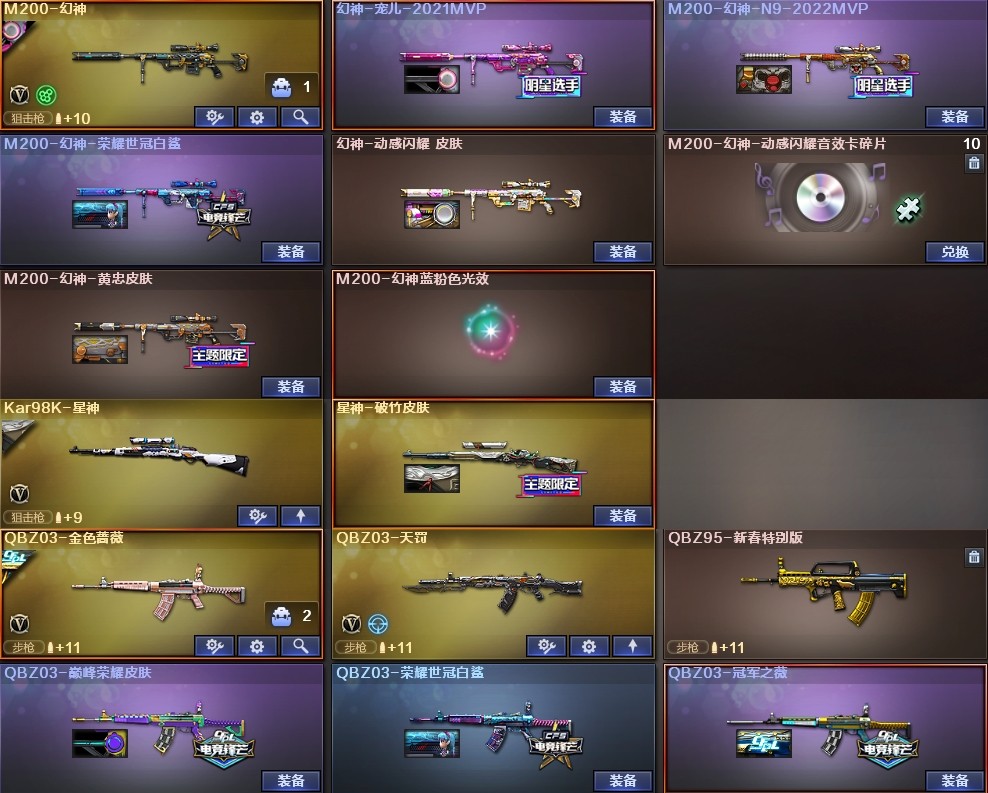 【幻神5皮】【神工天巧套装X1套】【竞技荣光套装X4套】【雷霆套装X5套】【M200-幻神】【幻神-宠儿-2021MVP】【M200-幻神-N9-2022MVP】【M200-幻神-荣耀世冠白鲨】【幻神-动感闪耀 皮肤】【M200-幻神-黄忠皮肤】【Kar98K-星神】【星神-破竹皮肤】【AWM-裁决】【裁决-流光秘银】【Scar Light-白虎】【白虎-AG-CFPLS20冠军】【白虎之魄-觉醒版】【QBZ03-金色蔷薇】【QBZ03-冠军之薇】【QBZ03-荣耀世冠白鲨】【QBZ03-巅峰荣耀皮肤】【QBZ03-天罚】【王者芳薇-觉醒版】【HK417-朱雀】【M4A1-神工天巧】【柯尔特-冠军之特】【柯尔特-竞技荣光】【USP-神工天巧】【雷霆之契】【炽芒蝶刃】【Knife-冠军之刃】【电竞教官-云悠悠】【兰-巾帼英雄】【乔伊教练】【审判者】【王者炽天使】【王者零-华冠丽服】【影豹】【炫】【Barrett-毁灭音效卡】;柯尔特-冠军之特,炽芒蝶刃,Knife-冠军之刃,电竞教官-云悠悠,RPK-盘龙,QBZ03-金色蔷薇,M200-幻神,