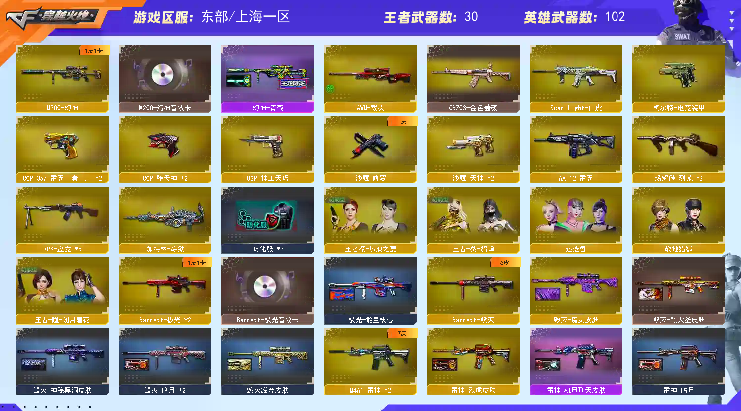 【传奇5】【Lv.102荣耀元帅】VIP5118V15王者3炫金幻神青鹤/毁灭耀金/毁灭暗月/毁灭神秘黑洞/毁灭魔灵/毁灭黑大圣/毁灭青帝/极光能量核心/天龙CFSTAR/火麒麟CFSTAR/_迷迭香/M200-幻神/Barrett-毁灭/Barrett-极光(2)/Barrett-朱雀/Barrett-暗月传说/堕天神套装/雷霆王者套装/Barrett-极光音效卡/M200-幻神音效卡/M4A1-黑骑士音效卡/M4A1-黑龙音效卡/AK47-火麒麟音效;RPK-盘龙,QBZ03-金色蔷薇,M200-幻神,Scar Light-白虎,