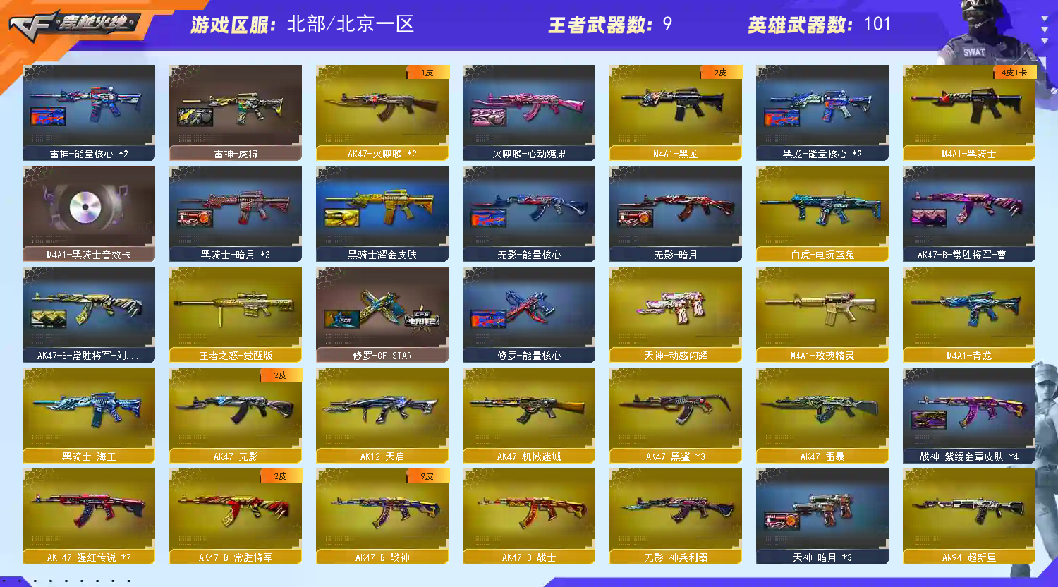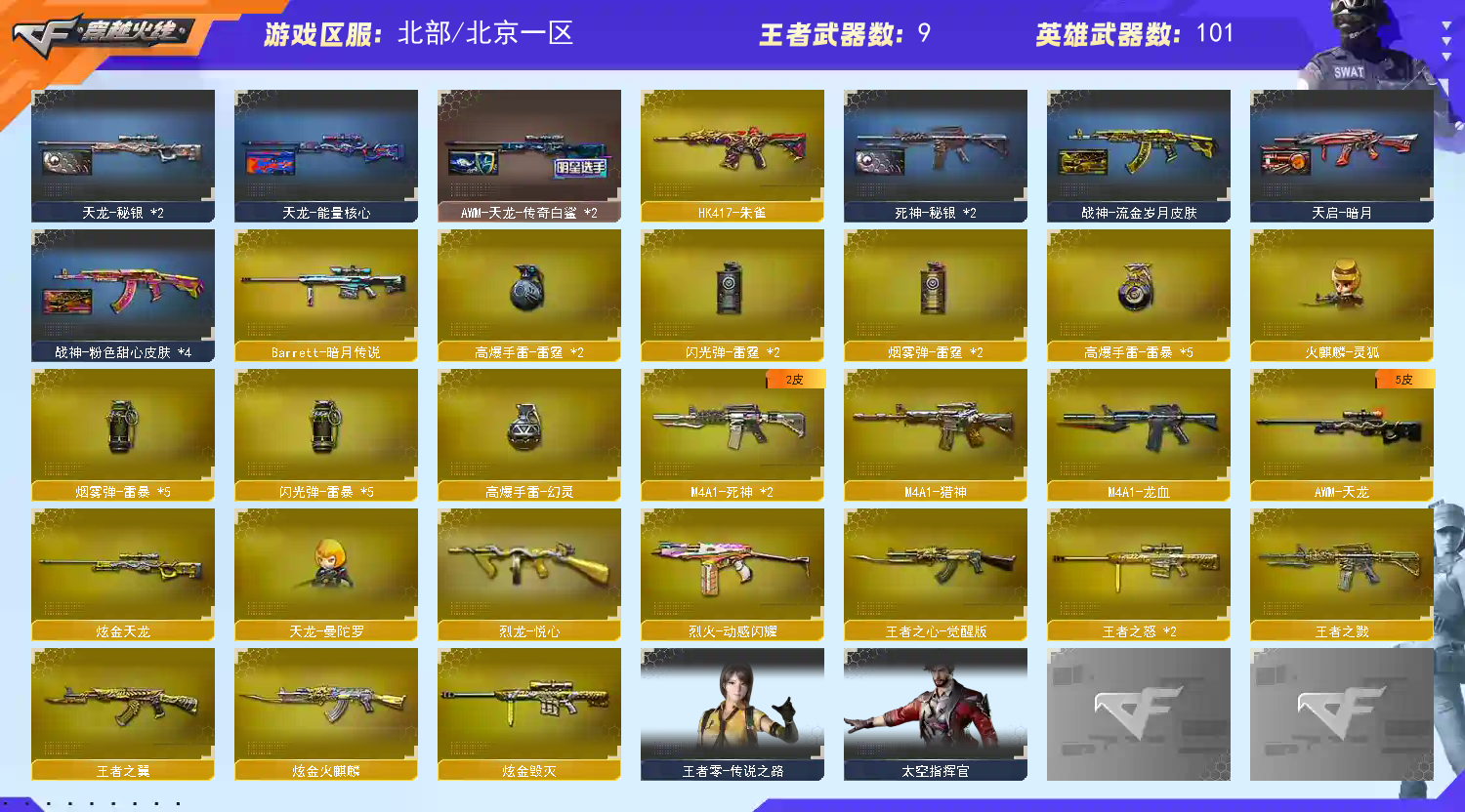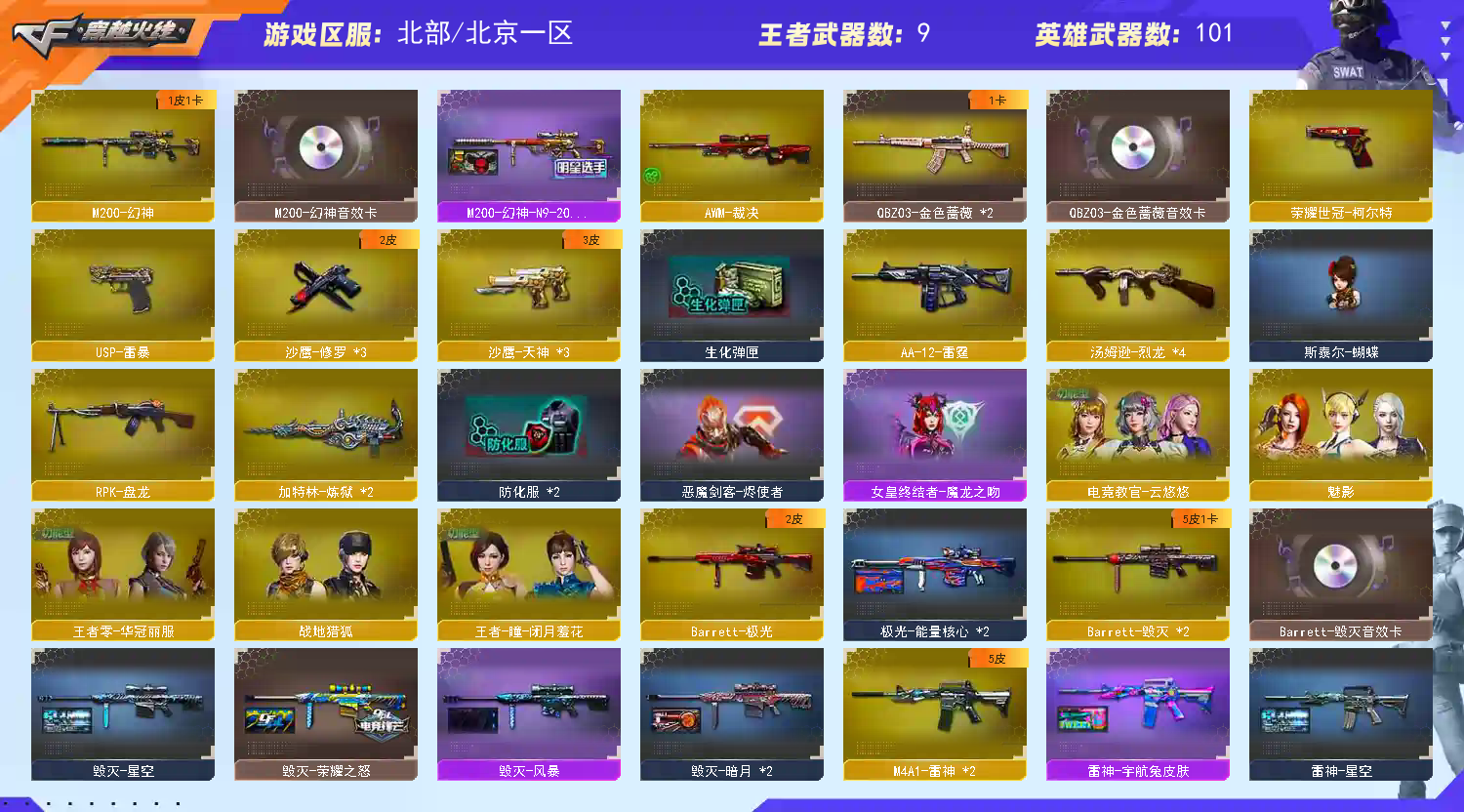 【重要套装】雷暴套装 【重要角色】魅影/电竞教官-云悠悠/王者零-传说之路/王者-瞳-闭月羞花/王者零-华冠丽服/乔伊教练/电竞少女/铁骑荣耀/空 【传说武器】 【英雄武器】_M200-幻神/Barrett-毁灭(2)/Barrett-极光/Barrett-暗月传说/王者之怒-觉醒版/AWM-天龙/AWM-裁决/M4A1-青龙/M4A1-雷神(2)/M4A1-死神(2)/M4A1-黑龙/M4A1-龙血/M4A1-黑骑士/黑骑士-海王/M4A1-猎神/M4A1-玫瑰精灵/HK417-朱雀/白虎-电玩蓝兔/AK12-天启/AK47-火麒麟(2)/AK47-无影/无影-神兵利器/AK47-雷暴/AK47-黑鲨(3)/AK-47-猩红传说(7)/AK47-机械迷城/AK47-B-常胜将军/AK47-B-战士/AK47-B-战神/AN94-超新星/QBZ03-金色蔷薇(2)/王者之心-觉醒版/烈火-动感闪耀/9A91-烈火/RPK-盘龙/汤姆逊-烈龙(4)/AA-12-雷霆/加特林-炼狱(2)/天神-动感闪耀/沙鹰-天神(3)/沙鹰-修罗(3)/荣耀世冠-柯尔特/USP-雷暴/麒麟刺/龙啸/荣耀世冠-龙啸/擎天/王者之击-觉醒版/屠龙-动感闪耀/屠龙(6)/雷霆之锋/王者之锋-觉醒版/斩神刀-雷暴/手雷-动感闪耀/高爆手雷-幻灵/高爆手雷-雷暴(5)/高爆手雷-雷霆(2)/烟雾弹-雷暴(5)/烟雾弹-雷霆(2)/闪光弹-雷暴(5)/闪光弹-雷霆(2)/超新星-热带奇洋/龙啸-热带奇洋/手雷-热带奇洋 【王者武器】王者之戮/王者之翼/王者之怒(2)/烈龙-悦心 【小人枪】火麒麟-灵狐/天龙-曼陀罗/AWM-灵狐-15周年嘉年华/巴雷特-零-水下丽影/斯泰尔-蝴蝶/COP-旗袍/夺魂/迷你深渊冰龙/魔能飞环-曼陀罗/迷你波特博士/迷你牛牛/深渊终结者手雷/闪光弹-小乔 【其他重要武器】炫金火麒麟/炫金毁灭/炫金天龙/炫金天神/炫金修罗/M4A1-十二生肖·龙-雷神(2)/黑武士-能量核心/激光毁灭者I/激光毁灭者III/AK47-破空冰刃(3)/M4A1-秘银赤龙(4)/M4A1-紫炎/M4A1-SS-枪王排位/M4A1-S-火种/百城AK47/AK47-齐天大圣(2)/AK47-苍龙/M4A1-破空冰刃/M4A1-紫狱(2)/AN94-青花瓷/AK47-轮回(2)/M4CQBR-AP-孔明/AK47-枪娘(2)/雷神-赛博朋克/金色小号/黄金AK-47/AK47-十二生肖-蛇/AK47-圣诞节[2019]/AK47-狂欢-CFS/M4A1-狂欢-CFS/AK-12-CFS2017纪念版/AK47枪王排位II/M14EBR-情人节2020/AK-103-红色悦动/9A91-赤血龙魂(2)/M14EBR-赤血龙魂(5)/M4A1-电音/M4A1-肯德基/AK47-SS-枪王排位/HK417-赤血龙魂/M4A1-青龙.(2)/M4A1-情人节2019/M4A1-战龙/M4A1-PINK/9A91-2017万圣节/AK47-万圣节2018/9A-91翡翠/M4A1C-死亡之翼/凤凰之魄/AK47-B-十周年/AK47-肯德基/M200-大黄蜂/AWM-A枪王排位II/AWM-Pink(3)/百城AWM/M200-萌杀/M200-WeGame/黄金AWM/M200-青帝/M200-圣诞(2)/暗金AWM/AWM-万圣节刀锋/巴雷特-情人节2020/M200-赤血龙魂(3)/M200 CheyTac-大圣/Barrett-翔龙/M200-情人节2019(2)/M200-万圣节/AWM-蓝水晶(2)/AWM-2018圣诞/Barrett-炎龙/AWM-圣诞/M200-万圣节2018/凤凰之力/M200-涂鸦/巨龙咆哮Ⅲ(2)/KAC-小动物(2)/阿梅利轻机枪-暗夜风暴/斯泰尔-CFS2017纪念版/P90-炫彩/EVOⅢ-黑金传说/雷蛇冲锋枪/Spas-12-幻能朋克/Spas-12-黑金/SPAS-12-雷电核心/愤怒公牛左轮-枪王排位(2)/COP 357-平天大圣/沙鹰-枪王排位(4)/新USP-枪王排位奖励(4)/COP-金蝉子-枪王排位/Cop357-萌杀/柯尔特-百城/COP357-十二生肖·羊/COP357-神秘黑洞/COP-青帝/迷彩沙鹰-70KG/蟒蛇-炫彩/Anaconda-黑金神龙/COP 357--绚樱(2)/COP 357-子鼠/Anaconda-万圣节2019(2)/Cop357-赤龙/COP 357-青龙/Anaconda-雷电核心/沙鹰-雷蛇/沙鹰-青龙/沙鹰-万圣节2018/柯尔特双枪-2017万圣节/金刚伞-电玩红兔/魔能镰刀/虹光女皇利刃-枪王排位(3)/蝴蝶刀-枪王排位/尼泊尔军刀-战龙/猫猫手套/丛林匕首-卧龙(3)/鹰爪-枪王排位/军用铁锹-赤龙(2)/军用铁锹-飞龙在天/丛林匕首-枪王排位/啸天/收割者-枪王排位/胜利奖杯闪光弹-枪王排位/胜利奖杯烟雾弹-枪王排位(2)/闪光弹-枪王排位(4)/红色诅咒娃娃手雷 【重要武器皮肤】M200-幻神-N9-2022MVP/毁灭-星空/毁灭-荣耀之怒/毁灭-暗月/毁灭-风暴/极光-能量核心/AWM-天龙-传奇白鲨/天龙-秘银/天龙-能量核心/火麒麟-CFSTAR/火麒麟-心动糖果/无影-暗月/无影-能量核心/AK47-黑武士-361/AK47-B-常胜将军-刘备/AK47-B-常胜将军-曹操/雷神-虎将/雷神-宇航兔皮肤/雷神-能量核心/雷神-星空/黑骑士耀金皮肤/黑骑士-暗月/黑龙-暗月/黑龙-能量核心/死神-秘银/天启-暗月/战神-流金岁月皮肤/战神-紫绶金章皮肤/战神-粉色甜心皮肤/修罗-CF STAR/修罗-能量核心/天神-暗月 【重要光效】屠龙-流星光效/炼狱-悦蓝金色光效/王者之影金色光效/王者之心金色光效/王者之锋金色光效/王者之魂金色光效/AK47-黑武士蓝色光效/M4A1-死神蓝色光效/RPK-盘龙蓝色光效/加特林-炼狱蓝色光效/屠龙蓝色光效/巴雷特-毁灭蓝色光效/擎天蓝色光效/汤姆逊-烈龙蓝色光效/沙鹰-修罗蓝色光效/AK47-火麒麟蓝粉色光效/M200-幻神蓝粉色光效/Barrett-极光紫橙光效/M4A1-雷神紫橙光效/王者之心紫色光效/王者之戮紫色光效/M4A1-雷神绿色光效 【重要音效卡】M200-幻神音效卡/M4A1-黑骑士音效卡/QBZ03-金色蔷薇音效卡/Barrett-毁灭音效卡 【重要戒指】15周年限定戒指/金蛇戒/银蛇戒/16赛季纪念戒指-枪王耀银/17赛季纪念戒指-耀银/21赛季纪念戒指-耀银(拇指)/22赛季纪念戒指-耀银(拇指)/23赛季纪念戒指-耀银(拇指)/23赛季纪念戒指-耀银(食指) /24赛季纪念戒指-耀银(食指) /24赛季纪念戒指-耀银(拇指)/25赛季纪念戒指-耀银(食指)/25赛季纪念戒指-耀银(拇指)/26赛季纪念戒指-耀金(拇指) 【拥有重要玩偶】金色幸运鼠玩偶;USP-雷暴,荣耀世冠-柯尔特,电竞教官-云悠悠,RPK-盘龙,QBZ03-金色蔷薇,M200-幻神,