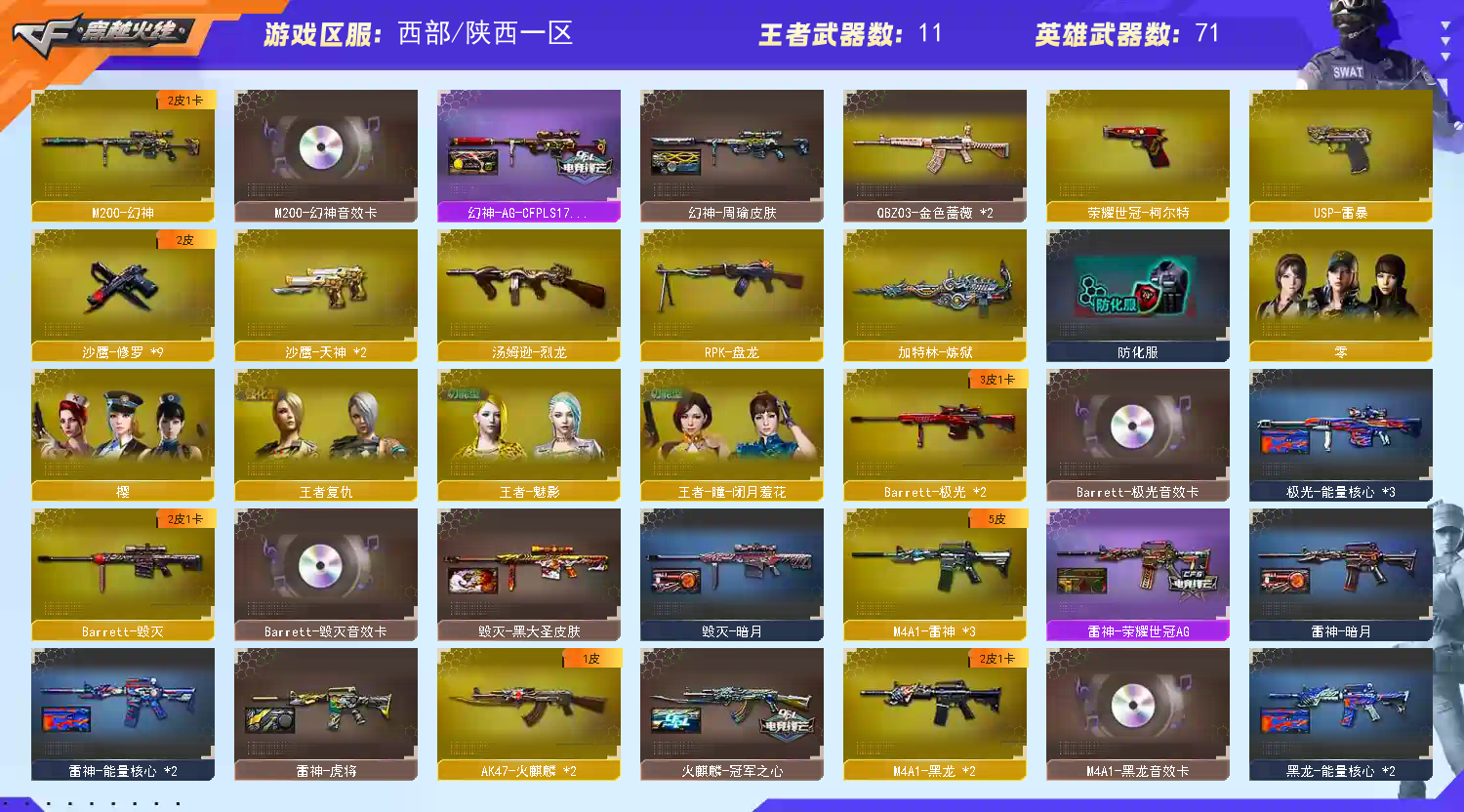 陕西-区两皮带卡【m200-幻神+幻神音效卡+幻神-周瑜皮肤+幻神a0-cfpls17冠军+usp-雷暴+荣耀世冠-柯尔特】【qbz金色蔷薇】【毁灭+毁灭音效卡】【雷祖·雷神-荣耀世冠aq+荣耀世冠-雷神)T\库甘南+火麒麟-冠军之心】【黑骑士+黑骑士音效卡+黑骑士-伏载】【黑龙+黑龙音效卡】【天龙+极光+芭蕾特-金色蔷薇】【无影+死神+黑武士+朱雀+玫瑰精灵+烈火】【烈龙+盘龙+炼狱+修罗+天神】【夜魔雷套+幻灵雷套+雷暴雷套】【王者之影+王者青龙+王者之决+雷霆王者之锋+王者之刺+王者之击】【四防王者-魅影】【零+王者复仇+王者-瞳-闭月羞花+樱】;USP-雷暴,荣耀世冠-柯尔特,RPK-盘龙,QBZ03-金色蔷薇,M200-幻神,