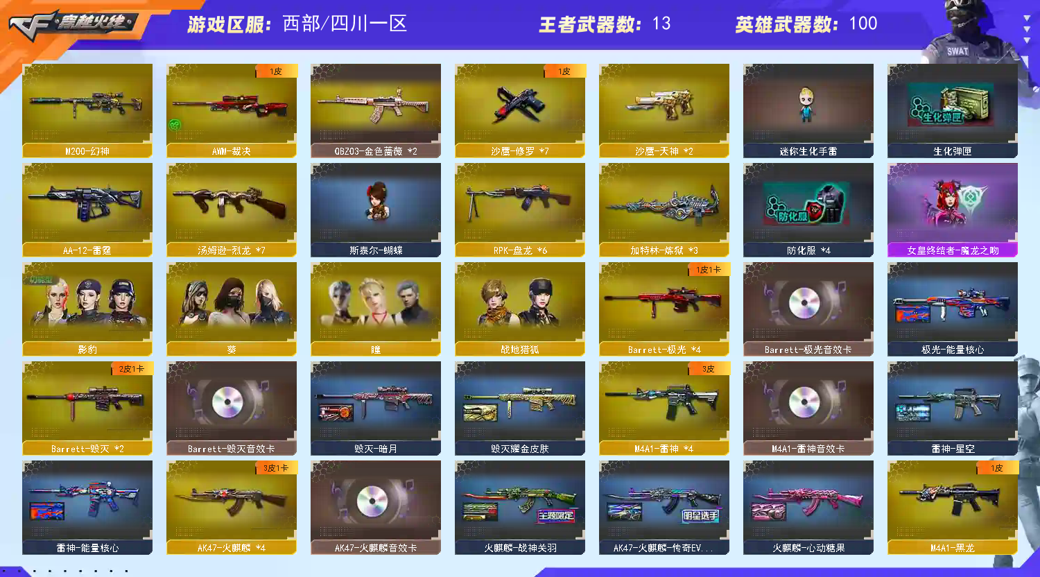 【m200幻神】【6盘龙+3炼狱+6烈龙+蝴蝶+死亡之眼】【qbz金色蔷薇2】【王者之心 王者之影 王者之怒】【火麒麟+音效卡】【雷神+音效卡】【黑骑士】【毁灭+音效卡】【6修罗 天神 屠龙 龙啸 擎天 麒麟刺】【小人呛 天龙曼陀罗 m4a1刀锋 cop旗袍】角色【葵 瞳 影豹 救世主x】【超级背包 炫彩背包】;RPK-盘龙,QBZ03-金色蔷薇,M200-幻神,
