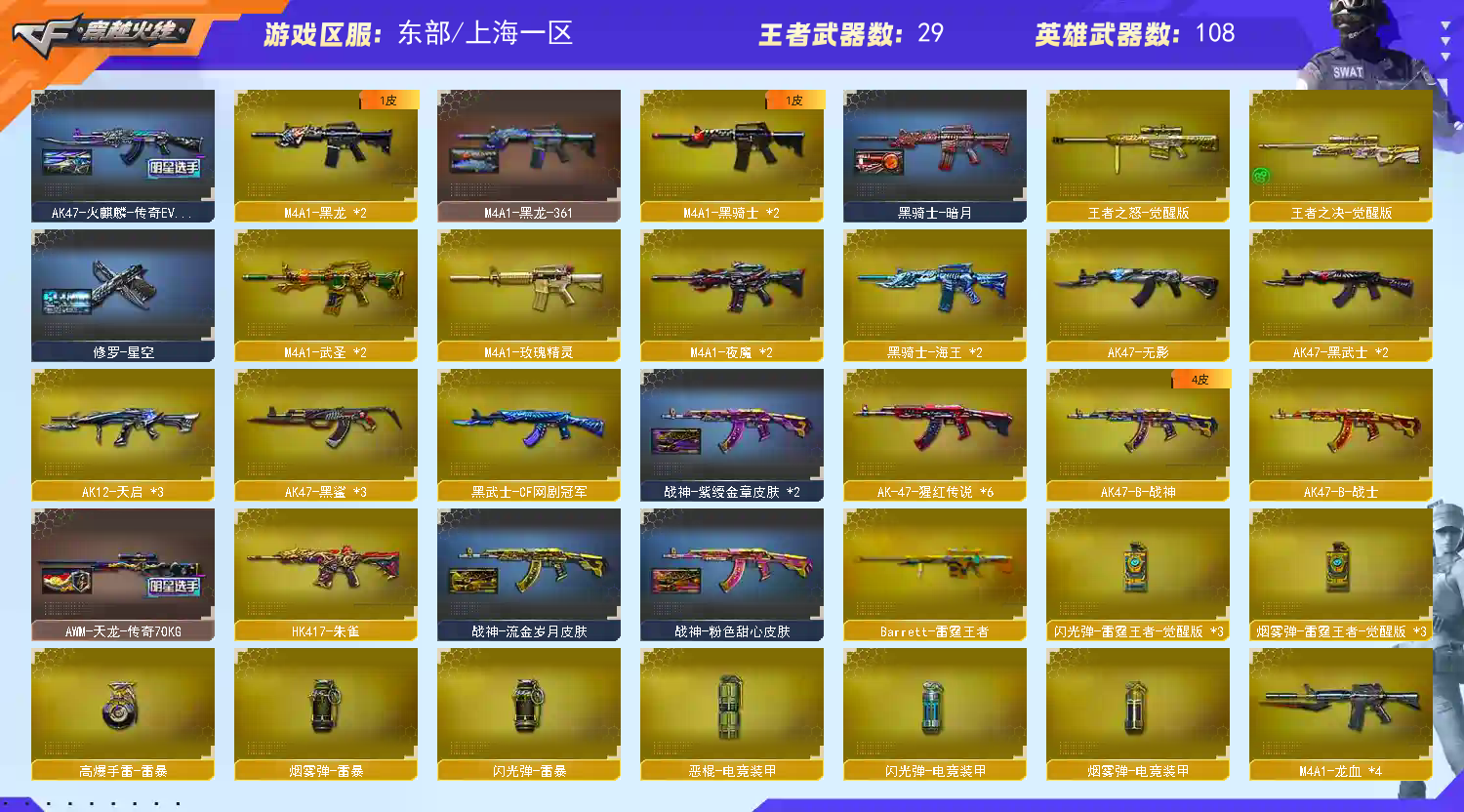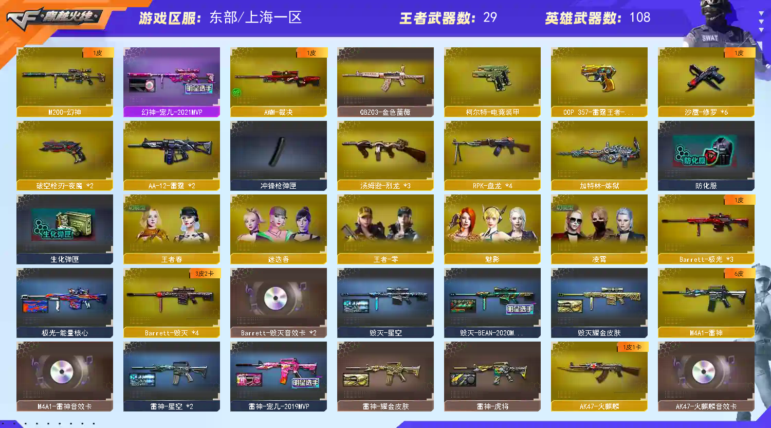 【m200幻神+幻神宠儿皮肤】【夜魔套】【qbz金色蔷薇】【barrett雷霆王者】【4盘龙+炼狱+5烈龙】【王者炎心 王者之心 王者之幻 王者之戮 王者之魄 王者之光 王者之决 王者之怒】【火麒麟+音效卡】【雷神+音效卡+宠儿皮肤】【黑骑士】【毁灭+音效卡】【6修罗 屠龙 龙啸 擎天 麒麟刺】【小人呛 雷神精英刀锋 cop旗袍】角色【四防 王者春】【凌霄 迷迭香 王者零 魅影 剑齿虎x 救世主x】【超级背包 炫彩背包 虎牙炫彩背包 q9战队炫彩背包】;RPK-盘龙,QBZ03-金色蔷薇,M200-幻神,