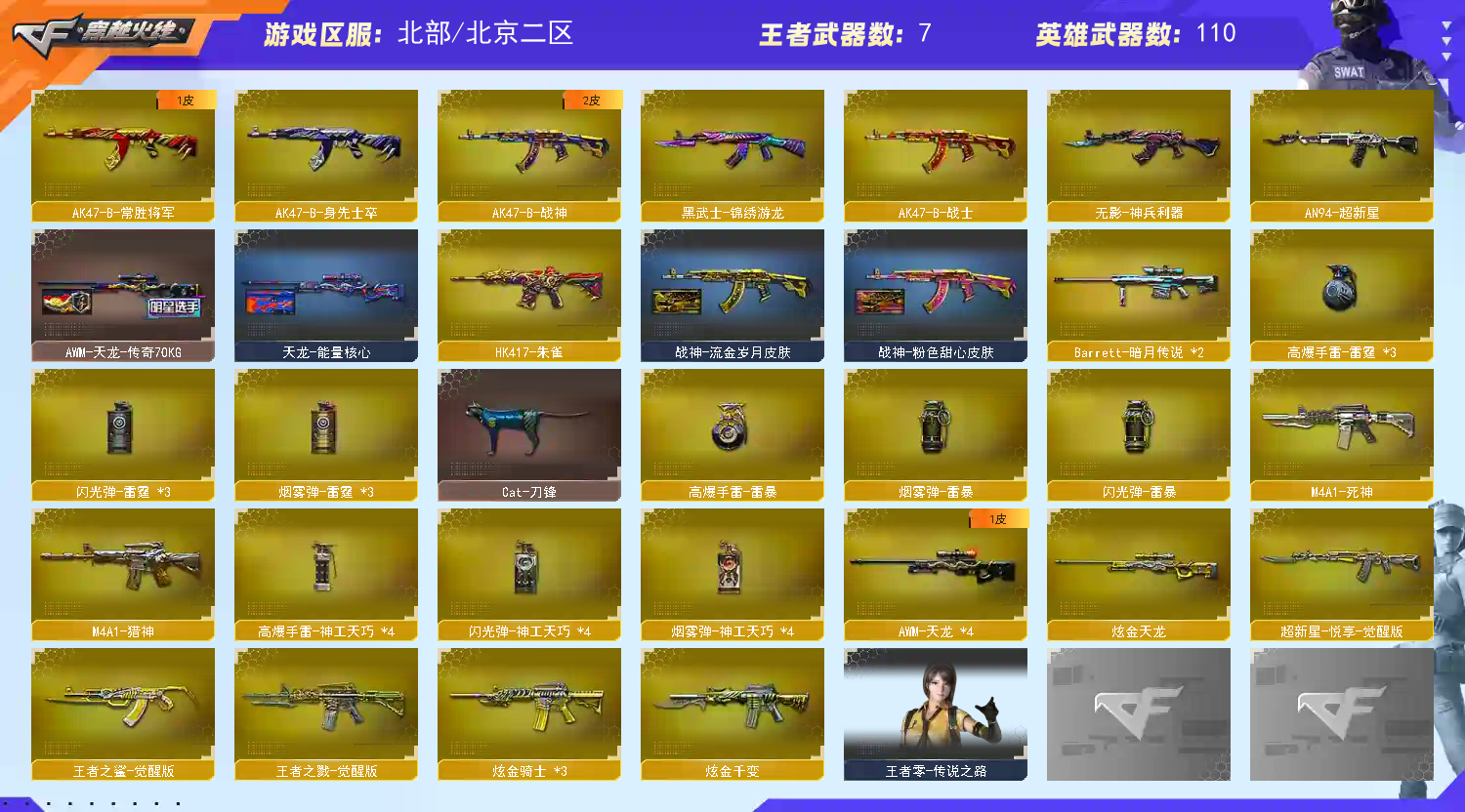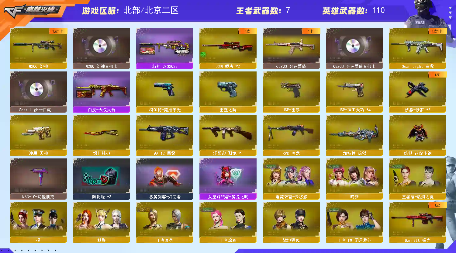 【北部战区】(吉林一区 黑龙江区 辽宁一二三区 合区)(河北一区 山西一区 北京一二三四区 合区)(山东一区 山东二区 河南二区 北方大区 合区) 118V VIP6 幻神三件套2022幻神音效卡/白虎三件套 5把USP/柯尔特竞技荣光/COP-雷霆 QBZ QBZ音效卡/4烈龙/盘龙炼狱+炼狱小刚 白虎音效卡大汉风骨/炽芒蝶刃/7音效卡;USP-雷暴,炽芒蝶刃,电竞教官-云悠悠,晴雅,RPK-盘龙,QBZ03-金色蔷薇,M200-幻神,