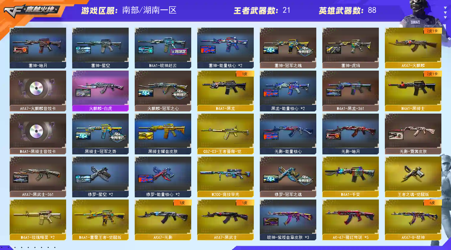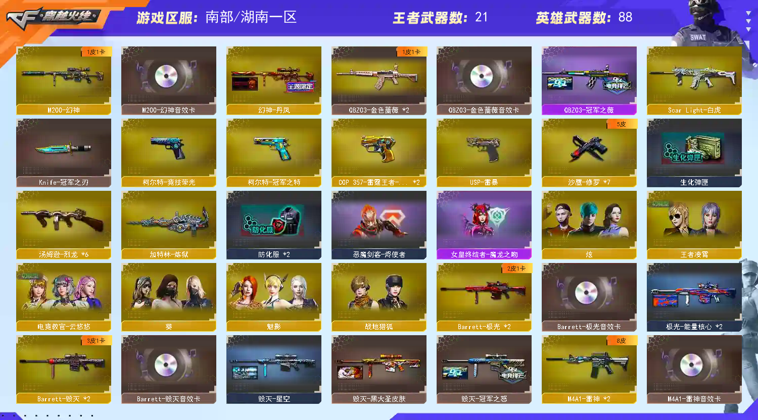 【区服】北京一区【VIP】【游戏段位】传奇4【游戏等级】Lv.100大元帅【段位排名】1002743【CF点】7888【VVIP数量】142【重要套装】网剧冠军套装【重要角色】_零/_葵/_炫/_迷迭香/蛇隐宗/蛇姬/王者-零/狐影/堕落女神/王者零-传说之路/王者-葵-貂蝉/王者樱-热浪之夏/王者-魅影/王者-瞳-闭月羞花/王者玲珑/王者春/王者涂鸦/灵狐者-职业经理/空/灵狐者-黄金海岸/兰-海滩派对【传说武器】传说光耀【英雄武器】_M200-幻神/Barrett-毁灭(7)/Barrett-极光/barrett-金色蔷薇/Barrett-暗月传说/AWM-天龙(2)/AWM-裁决(2)/M4A1-雷神(5)/M4A1-死神/M4A1-黑龙(3)/M4A1-龙血(4)/M4A1-千变(2)/M4A1-黑骑士(3)/黑骑士-海王/M4A1-猎神/M4A1-玫瑰精灵/王者之魄-觉醒版/王者之武-觉醒版/HK417-朱雀/_ScarLight-白虎/AK12-天启(2)/AK47-火麒麟(4)/AK47-无影/AK47-黑鲨(2)/AK47-黑武士/黑武士-CF网剧冠军/AK-47-猩红传说/AK47-B-身先士卒/AK47-B-常胜将军/AK47-B-战士(2)/AK47-B-战神/AN94-超新星/QBZ03-金色蔷薇(5)/王者之心-觉醒版/9A91-烈火(2)/RPK-盘龙(6)/汤姆逊-烈龙(8)/AA-12-雷霆/加特林-炼狱(2)/COP357-雷霆王者-觉醒版/王者之灵-觉醒版/沙鹰-天神(3)/天神-CF网剧冠军/沙鹰-修罗(4)/王者之魂-觉醒版/柯尔特-电竞装甲/麒麟刺/龙啸(2)/王者之啸-觉醒版(2)/擎天(2)/擎天-CF网剧冠军/屠龙(6)/雷霆之锋/幻灵之锋/马来剑-夜魔/斩神刀-雷暴/高爆手雷-幻灵(2)/高爆手雷-雷暴/高爆手雷-雷霆/高爆手雷-夜魔/高爆手雷-竞技荣光/烟雾弹-幻灵(3)/烟雾弹-雷暴/烟雾弹-雷霆/烟雾弹-夜魔/烟雾弹-竞技荣光/烟雾弹-电竞装甲/恶棍-电竞装甲/闪光弹-幻灵(2)/闪光弹-雷暴/闪光弹-雷霆/闪光弹-夜魔/闪光弹-竞技荣光/闪光弹-电竞装甲【王者武器】M4A1-雷霆王者/王者之魄(3)K-12-CFS2017纪念版/M4A1-樱花/56式步枪-梨花/AK47-樱花/9A91-2017万圣节/M4A1-战龙/雷蛇AWM(2)/AWM-枪娘(2)/AWM-摸金校尉/AWM-卡通(2)/AWM-A-圣诞2021/AWM-蓝水晶/AWM-黑金/Barrett-怒火大圣/Barrett-牛魔王/黄金AWM/AWM-CFS2020/M200-枪王排位/暗金AWM/AWM-万圣节刀锋/AWM-S/AWM-A枪王排位II/暗金M200/M200-涂鸦/M200-赤血龙魂/98K-蓝色骑士/Barrett-翔龙/M200-牡丹/AWM-恶棍-枪王排位/巴雷特-情人节2020/M200CheyTac-大圣/AWM-T/AWM-2018圣诞/M200-情人节2019/M200-圣诞/凤凰之力/AWM-7周年/AWM-十周年/FN弩炮-CFS2017纪念版/AWM-A/AWM-圣诞/AWM-圣诞2013/AWM-Pink/破天狂龙/M200-万圣节/KAC-情人节2021/KAC-小动物/KAC-耀龙/MG4-蓝色骑士/EVOIII-赤血龙魂(2)/斯泰尔-巧克力(2)/MK5-圣诞/斯太尔-能量核心/EVOⅢ-黑金传说/雷蛇冲锋枪/神圣爆裂者-末日/Spas-12-黑金/SPAS-12-雷电核心/蟒蛇-炫彩/愤怒公牛左轮-枪王排位(2)/Anaconda-情人节2021/COP357-青龙(2)/幻影沙鹰-枪王排位(4)/COP-金蝉子-枪王排位/USP-黑大圣/新USP-怒火大圣(2)/沙鹰-枪王排位(4)/Cop357-赤龙(2)/幻影Anaconda-枪王排位(2)/Anaconda-雷电核心/沙漠之鹰-炎龙/修罗-摸金校尉(2)/Anaconda-黑金神龙/COP357-子鼠/MauserM1896-CFS2020/COP-十二生肖-蛇/COP357-万圣节2020/COP357--绚樱(2)/新USP-枪王排位奖励(4)/Anaconda-炽焰核心/沙鹰-雷蛇(2)/沙鹰-青龙(2)/凤凰之灵(3)/沙鹰-万圣节2018/柯尔特双枪-2017万圣节/凤凰之火/斩神刀-青帝/虹光鹰爪-枪王排位/虹光丛林匕首-枪王排位/斩魔刀-怒火大圣/猫猫手套/斩神刀-御龙/幻影扳手-枪王排位/尼泊尔-CFS2020/丛林匕首-卧龙/军用铁锹-飞龙在天/丛林匕首-枪王排位/军用铁锹-赤龙/啸天/收割者-枪王排位/闪光弹-枪王排位(7)/胜利奖杯手雷-枪王排位/胜利奖杯烟雾弹-枪王排位(3)/胜利奖杯闪光弹-枪王排位(3)/手雷-能量核心(2)/红色诅咒娃娃手雷(3)【重要武器皮肤】M200-幻神-黄忠皮肤/巴雷特-毁灭-CFPL冠军/毁灭-星空/毁灭耀金皮肤/毁灭-暗月/毁灭-黑大圣皮肤/极光-能量核心/AWM-天龙-传奇70KG/天龙-能量核心/火麒麟-CFSTAR/火麒麟-AG/火麒麟-平天大圣/火麒麟-冠军之心/无影-暗月/无影-霓裳皮肤/无影-能量核心/无影耀金皮肤/AK47-B-常胜将军-刘备/AK47-B-常胜将军-孙权/AK47-B-常胜将军-曹操/AK-47-雷神/M4A1-千变-孔明皮肤/雷神-荣耀之魄/雷神-虎将/雷神-耀金皮肤/雷神-烈虎皮肤/雷神-能量核心/雷神-星空/黑骑士-暗月/黑龙-暗月/黑龙-能量核心/天启-暗月/战神-流金岁月皮肤/战神-紫绶金章皮肤/战神-粉色甜心皮肤/修罗-能量核心/天神-暗月/屠龙-荣耀之锋【重要光效】AK47-黑武士金色光效/Barrett-毁灭金色光效/王者之怒金色光效/王者之魂金色光效/王者之魄金色光效/AK47-火麒麟蓝色光效/AK47-黑武士蓝色光效/AN94-超新星蓝色光效/AWM-天龙蓝色光效/M4A1-死神蓝色光效/RPK-盘龙蓝色光效/屠龙蓝色光效/巴雷特-毁灭蓝色光效/沙鹰-修罗蓝色光效/麒麟刺蓝色光效/龙啸蓝色光效/M200-幻神蓝粉色光效/M4A1-雷神蓝粉色光效/Barrett-极光红绿光效/AK47-无影紫色光效/AK47-火麒麟绿色光效/M4A1-黑骑士绿色光效/王者之灵绿色光效【重要音效卡】M200-幻神音效卡/M4A1-黑骑士音效卡/M4A1-黑龙音效卡/M4A1-雷神音效卡/Barrett-毁灭音效卡/AK47-火麒麟音效卡【重要戒指】8周年戒1/8周年戒2/龙眼(死神)/龙眼(鹰)/金蛇戒/银蛇戒/16赛季纪念戒指-枪王耀金/17赛季纪念戒指-耀金/18赛季纪念戒指-耀金/20赛季纪念戒指-耀金【拥有重要玩偶】;USP-雷暴,柯尔特-冠军之特,Knife-冠军之刃,电竞教官-云悠悠,QBZ03-金色蔷薇,M200-幻神,Scar Light-白虎,
