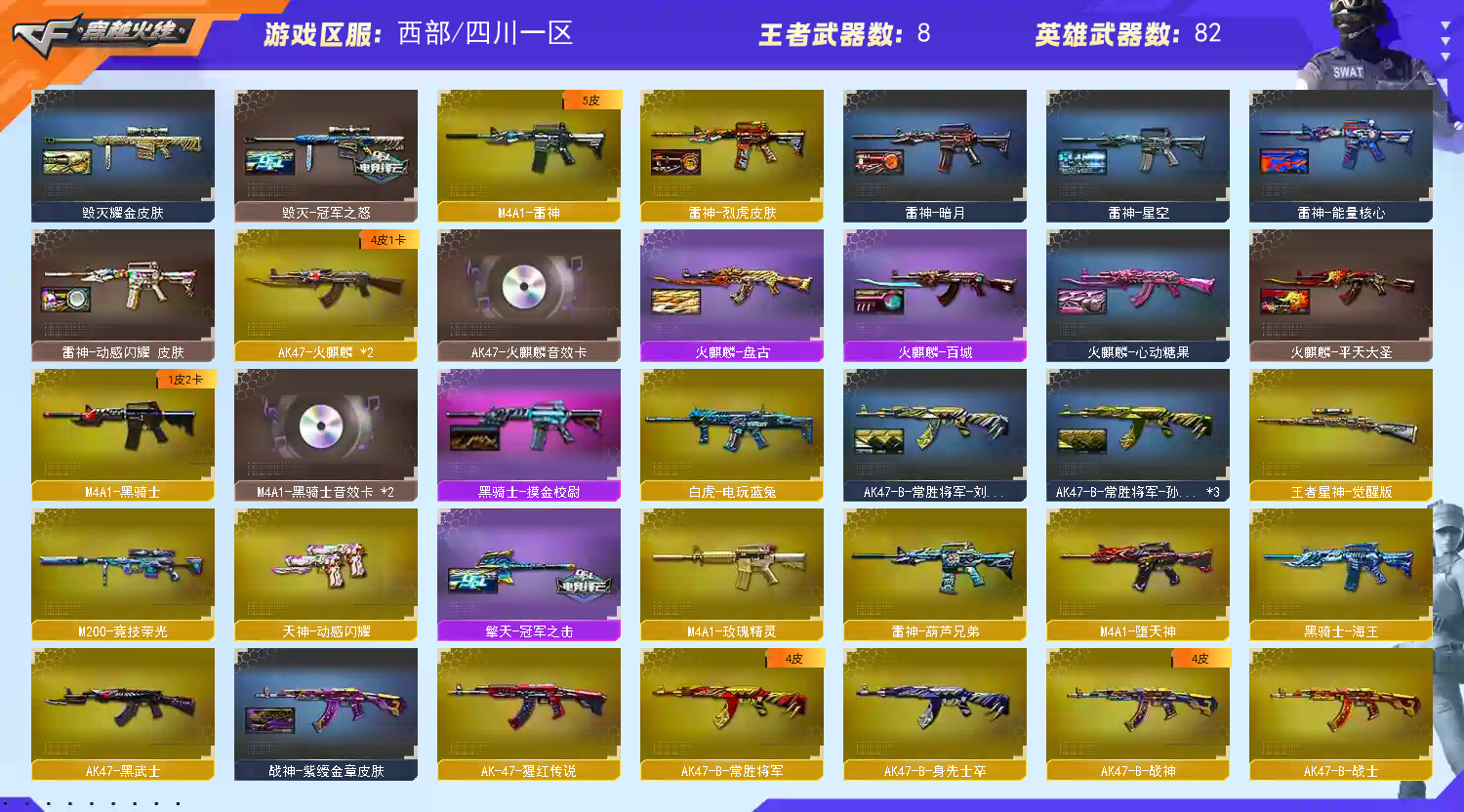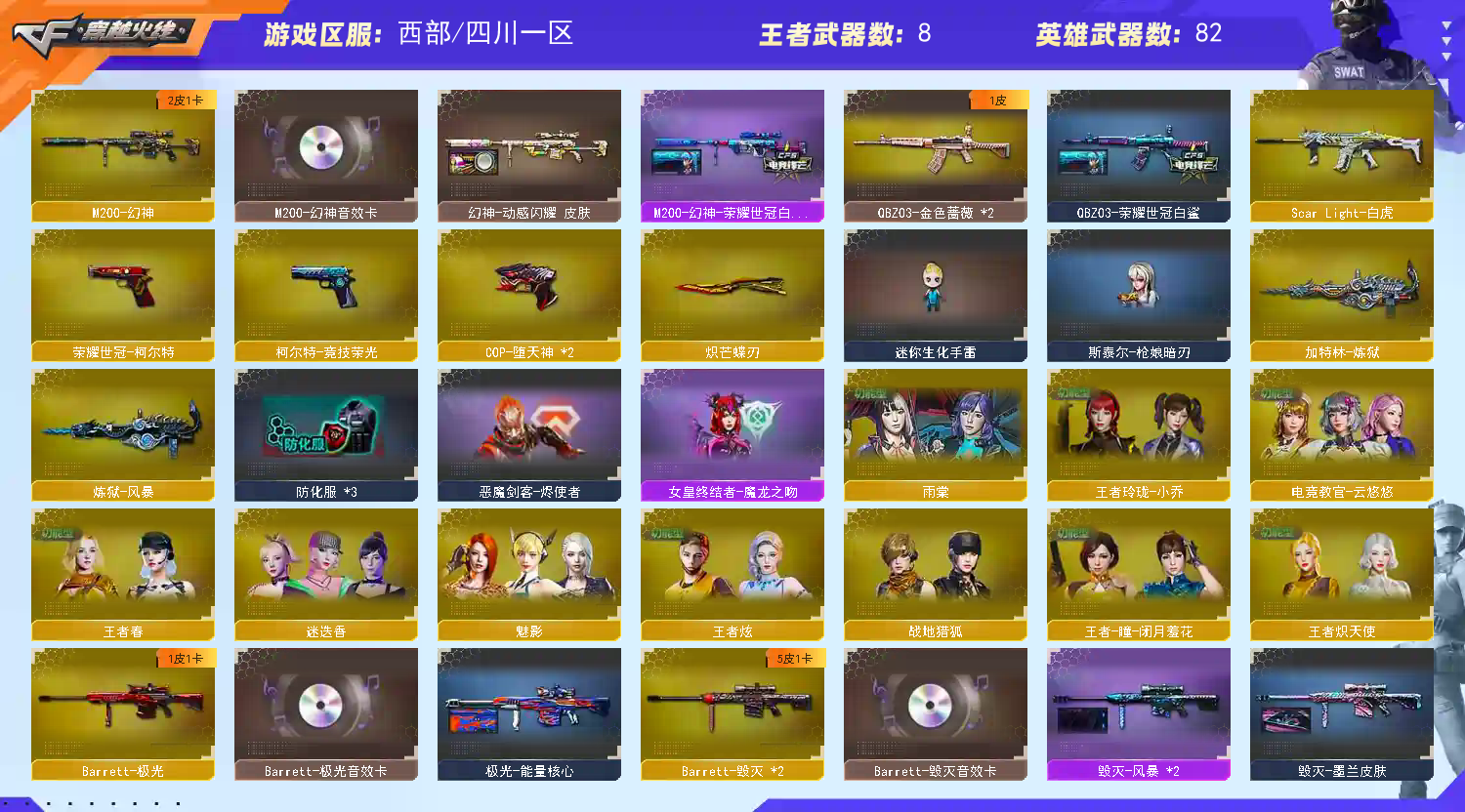Lv.102荣耀元帅【重要套装】堕天神套装/竞技荣光套装【重要角色】魅影/_迷迭香/雨棠/电竞教官-云悠悠/蛇隐宗/蛇姬/王者零-传说之路/王者-瞳-闭月羞花/王者春/王者玲珑-小乔/王者炫/王者炽天使/乔伊教练/樱-青春偶像/灵狐者-职业经理/铁骑荣耀【传说武器】【英雄武器】_M200-幻神/M200-竞技荣光/Barrett-毁灭(2)/Barrett-极光/Barrett-朱雀/barrett-金色蔷薇/Barrett-暗月传说(3)/王者星神-觉醒版/M4A1-堕天神/M4A1-雷神/雷神-葫芦兄弟/M4A1-黑骑士/黑骑士-海王/M4A1-玫瑰精灵/王者冰魄-觉醒版/_ScarLight-白虎/白虎-电玩蓝兔/AK47-火麒麟(2)/无影-神兵利器/AK47-黑武士/AK-47-猩红传说/AK47-B-身先士卒/AK47-B-常胜将军/AK47-B-战士/AK47-B-战神/AN94-超新星/QBZ03-金色蔷薇(2)/烈火-动感闪耀/加特林-炼狱/炼狱-风暴/COP-堕天神(2)/天神-动感闪耀/沙鹰-天神/荣耀世冠-柯尔特/柯尔特-竞技荣光/麒麟刺-堕天神/龙啸/龙啸-堕天神(3)/王者之啸-觉醒版(2)/擎天/擎天-竞技荣光/王者之击-觉醒版(2)/屠龙-动感闪耀/屠龙(2)/幻灵之锋/王者之锋-觉醒版/炽芒蝶刃/手雷-动感闪耀/高爆手雷-堕天神(7)/高爆手雷-竞技荣光(2)/烟雾弹-堕天神(7)/烟雾弹-竞技荣光(2)/闪光弹-堕天神(7)/闪光弹-竞技荣光(2)/龙啸-烈火龙威【王者武器】王者之魄高爆手雷【小人枪】M4A1-雷神-精英刀锋/HK417-朱雀-蛇隐宗/金色蔷薇-空/火麒麟-灵狐/AWM-灵狐-15周年嘉年华/Barrett-夜玫瑰/巴雷特-零-水下丽影/斯泰尔-枪娘暗刃/迷你深渊冰龙/魔能飞环-曼陀罗/迷你裂空之翼/迷你牛牛/生化手雷-机甲核心/深渊终结者手雷/迷你生化手雷/灵狐娃娃手雷(2)/闪光弹-小乔/高爆手雷-大乔/闪光弹-貂蝉【其他重要武器】炫金骑士/炫金雷神/火麒麟-能量核心/冠军之怒/毁灭耀金皮肤/毁灭-墨兰皮肤/毁灭-风暴/极光-能量核心/火麒麟-AG战队皮肤/火麒麟-平天大圣/火麒麟-心动糖果/火麒麟-百城/火麒麟-盘古/AK47-B-常胜将军-刘备/AK47-B-常胜将军-孙权/雷神-动感闪耀皮肤/雷神-暗月/雷神-烈虎皮肤/雷神-能量核心/雷神-星空/黑骑士-摸金校尉/QBZ03-荣耀世冠白鲨/战神-流金岁月皮肤/战神-紫绶金章皮肤/战神-粉色甜心皮肤/修罗-CFSTAR/修罗-能量核心/擎天-冠军之击【重要光效】王者之击金色光效/AK47-黑武士蓝色光效/AN94-超新星蓝色光效/M200-幻神蓝粉色光效/M4A1-雷神绿色光效【重要音效卡】M200-幻神-动感闪耀音效/天神-动感闪耀音效卡/Barrett-极光音效卡/M200-幻神音效卡/M4A1-黑骑士音效卡/Barrett-毁灭音效卡/AK47-火麒麟音效卡【重要戒指】15周年限定戒指/龙眼(死神)/龙眼(鹰)/20赛季纪念戒指-耀金/21赛季纪念戒指-耀铜(食指)/21赛季纪念戒指-耀银(拇指)/22赛季纪念戒指-耀铜(食指)/22赛季纪念戒指-耀银(拇指)/23赛季纪念戒指-耀铜(食指)/23赛季纪念戒指-耀银(拇指)/25赛季纪念戒指-耀铜(食指)/25赛季纪念戒指-耀铜(拇指)/26赛季纪念戒指-耀金(拇指);荣耀世冠-柯尔特,炽芒蝶刃,电竞教官-云悠悠,QBZ03-金色蔷薇,M200-幻神,Scar Light-白虎,
